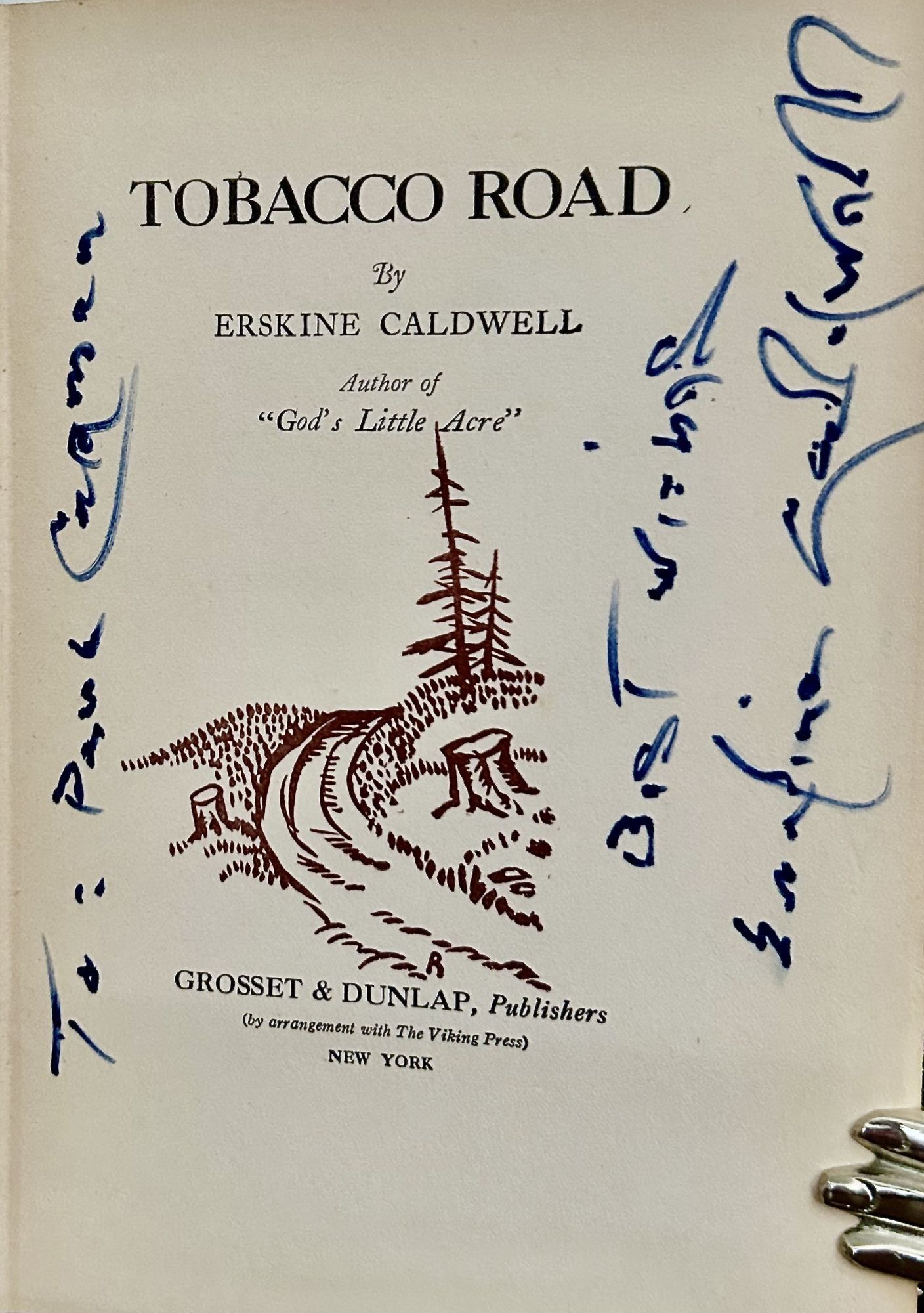 New York: Grosset & Dunlap, 1932. Hardcover. Orig. green cloth decorated in blind and silver. Near fine. 241 pages. 20 x 14 cm. Signed presentation copy to Paul Carman signed by Erskine Caldwell. Interior contents fresh and clean. A novel about a dysfunctional family of Georgia sharecroppers during the Great Depression and often portrayed as a work of social realism. Saxophonist Paul Carman is a veteran of the Frank Zappa Band of the late 1980's (in Frank's own words, "the best band you never heard in your life").