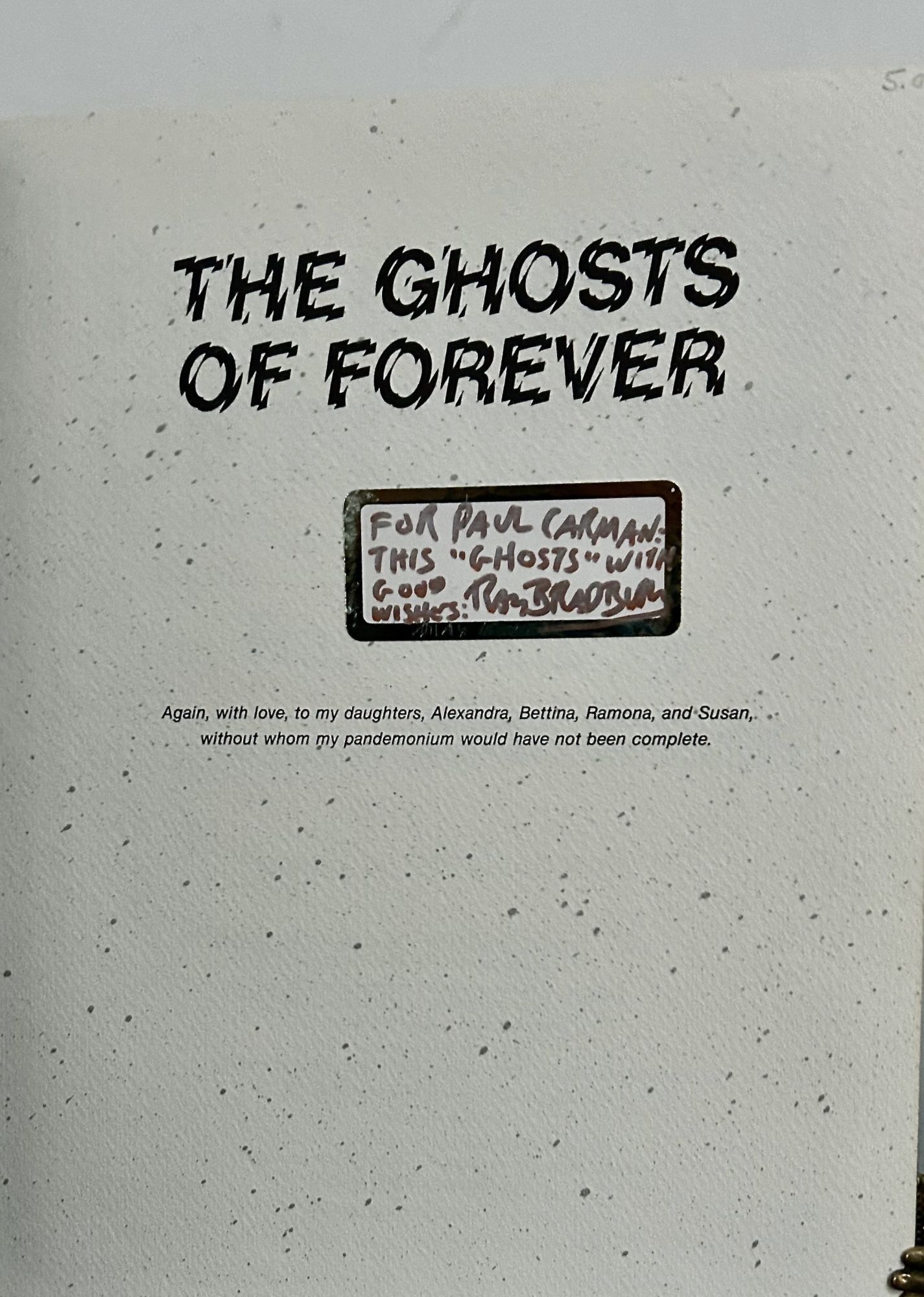 New York: Rizzoli, 1980. First edition. Hardcover. Orig. silver covers lettered in black. Near fine. 130 pages. Folio, 36 x 28. Illustrations by Aldo Sessa, with a prologue by Bradbury and an Epilogue by Melvin B. Zisfien. Signed presentation copy "For Paul Carmen: This "Ghosts" with Good Wishes: Ray Bradbury" on half title page on label in silver lettering. Saxophonist Paul Carman is a veteran of the Frank Zappa Band of the late 1980's (in Frank's own words, "the best band you never heard in your life"). Slight bump to backstrip foot.