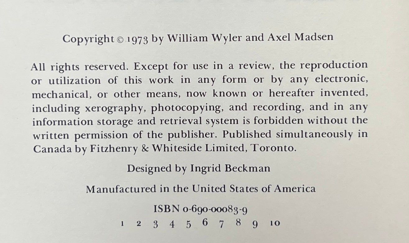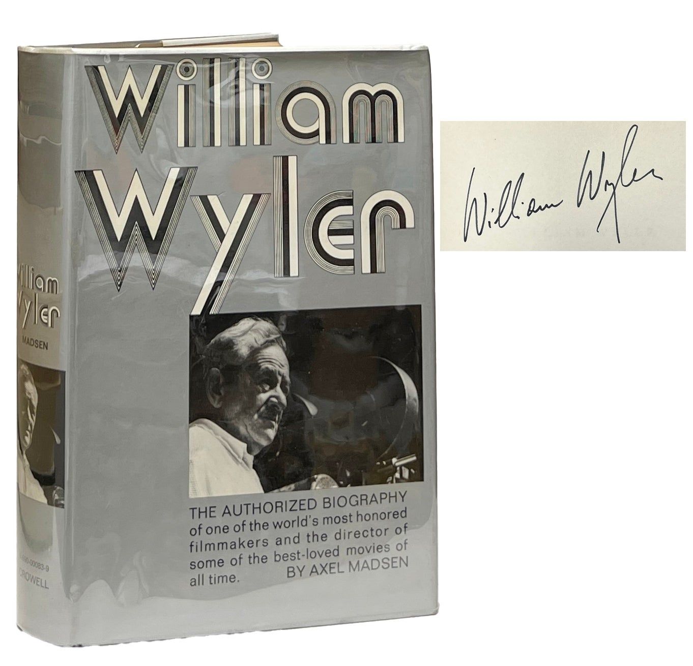 New York: Thomas Y. Crowell Co, 1973. First Edition. Hardcover. Fine/Fine. Signed by Wyler on the front endpaper. Fine in a Fine jacket, unclipped ($9.95), lightly bumped at the top edge. Silver boards, pushed at the foot of the spine, with black and white ink lettering on the spine. Square and firmly bound, clean internally. Madsen's biography of the Academy Award-winning director of classics like Ben-Hur and Roman Holiday.