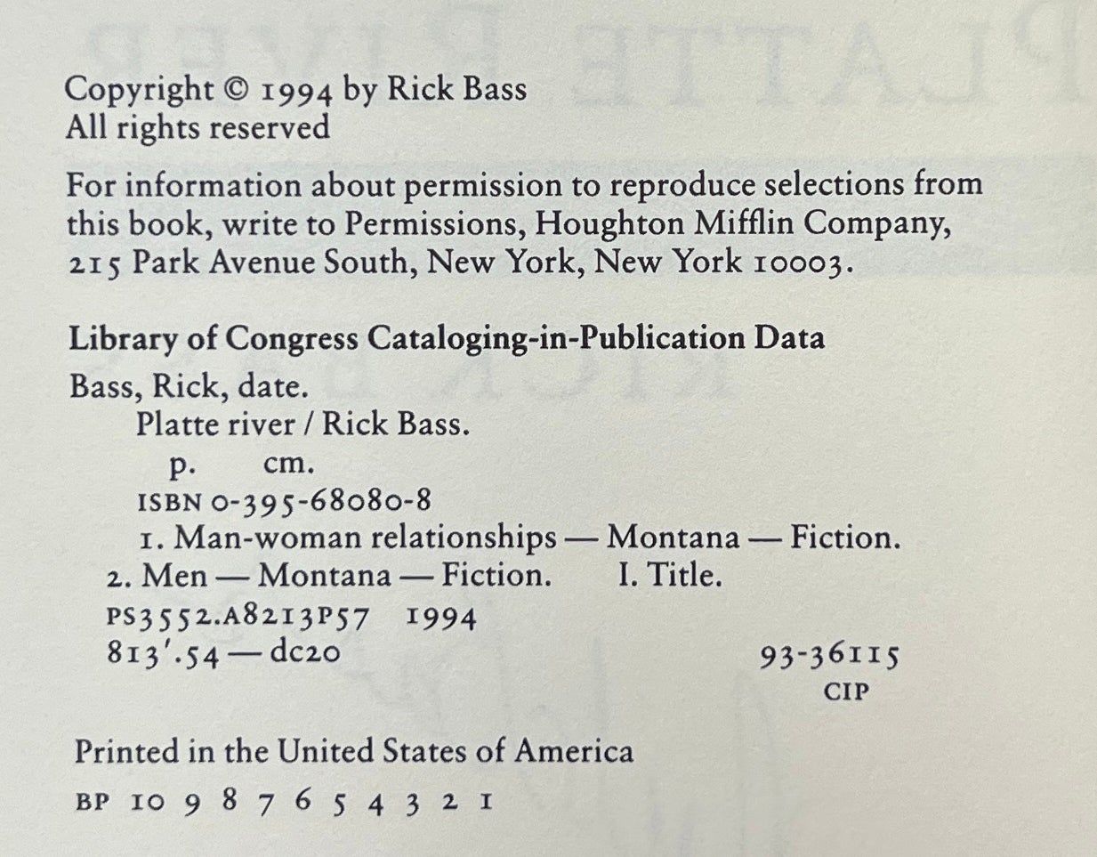 Boston: Houghton Mifflin Company, 1994. First Edition. Hardcover. Fine/Fine. Signed by Bass on the title page. Fine in a Fine jacket, unclipped ($19.95). Quarter grey cloth with grey paper on the boards. Square and firmly bound, clean internally. A collection of three novellas set in Montana.