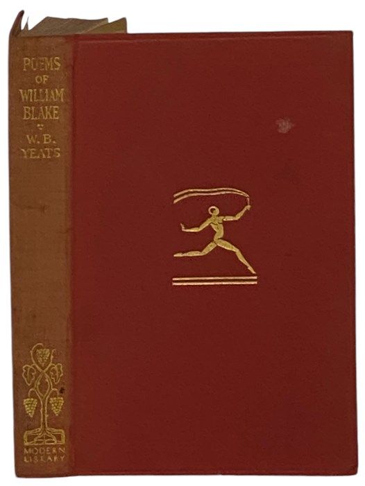 New York: The Modern Library, 1929. Reissue. Hard Cover. Good/No Jacket. 0x0x0. 1929-30 printing of Toledano 091.1, binding 5, yellow Bernhard endpapers. Lacks jacket. Spine faded, light stain on top of fore edge, a couple other small spots on boards and top edge, ink name and date on front endpaper. xli, 278 pp. Red coth, gilt titles. A selection of poems taken from Poetical Sketches, Songs of Innocence, Songs of Experience, Ideas of Good and Evil, The Prophetic Books, and Prose Fragments, with an introduction by William Butler Yeats.
