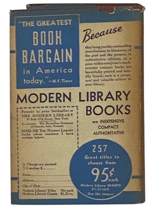 New York: The Modern Library, 1936. Reissue. Hard Cover. Very Good/Good. 7x5x1. 1936-39 printing of Toledano 212.1, binding/jacket style 7g, orange Rockwell Kent endpapers, $0.95 jacket price, 257 titles on jacket verso. Jacket toned (especially spine), jacket edges rubbed with minimal loss from corners. xi, 342, [5] pp. Eminent Victorians by English writer, biographer, Bloomsbury group member, and literary critic Lytton Strachey, was originally published in 1918. The work consists of biographies of four leading figures from the Victorian era. Its fame rests on the irreverence and wit Strachey brought to bear on three men and a woman who had until then been regarded as heroes: Cardinal Manning, Florence Nightingale, Thomas Arnold, and General Gordon (although Nightingale is actually praised and her reputation was enhanced). The book shows its other subjects in a less than flattering light; for instance, the intrigues of Cardinal Manning against Cardinal Newman.
