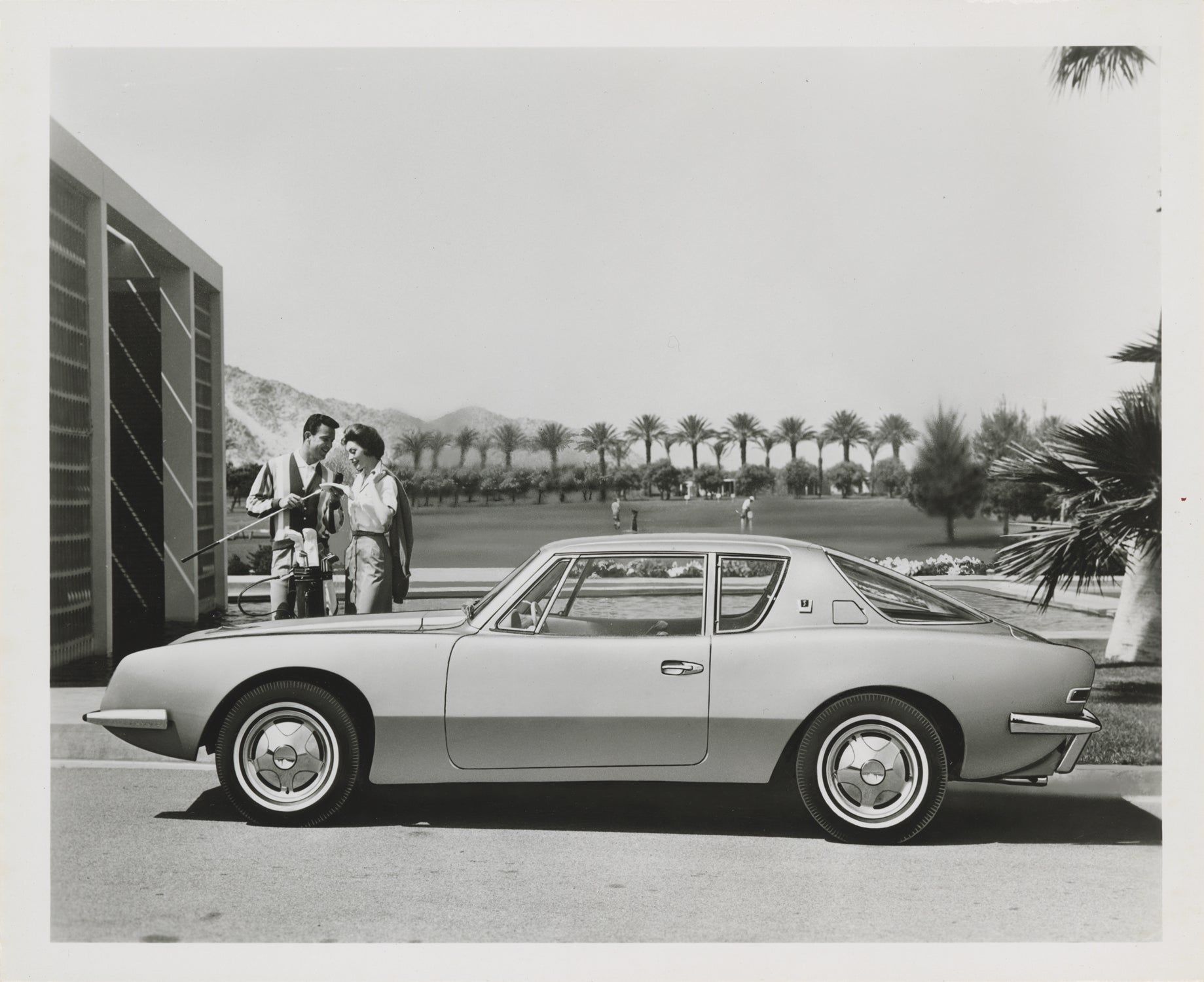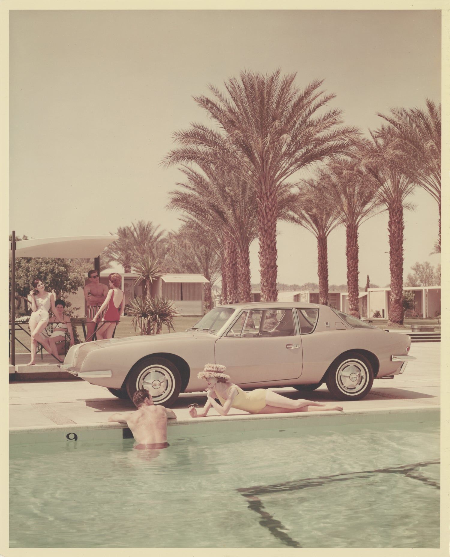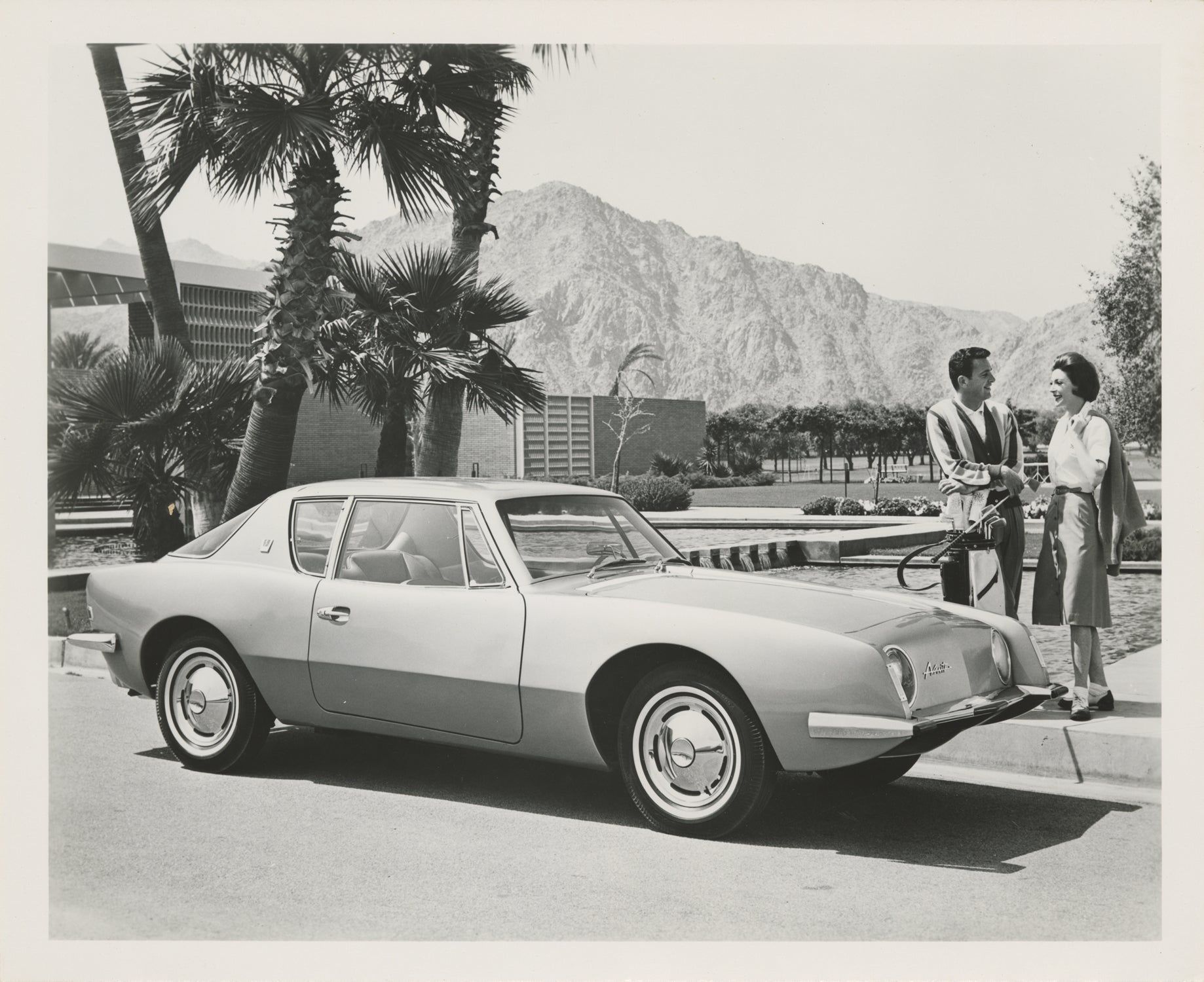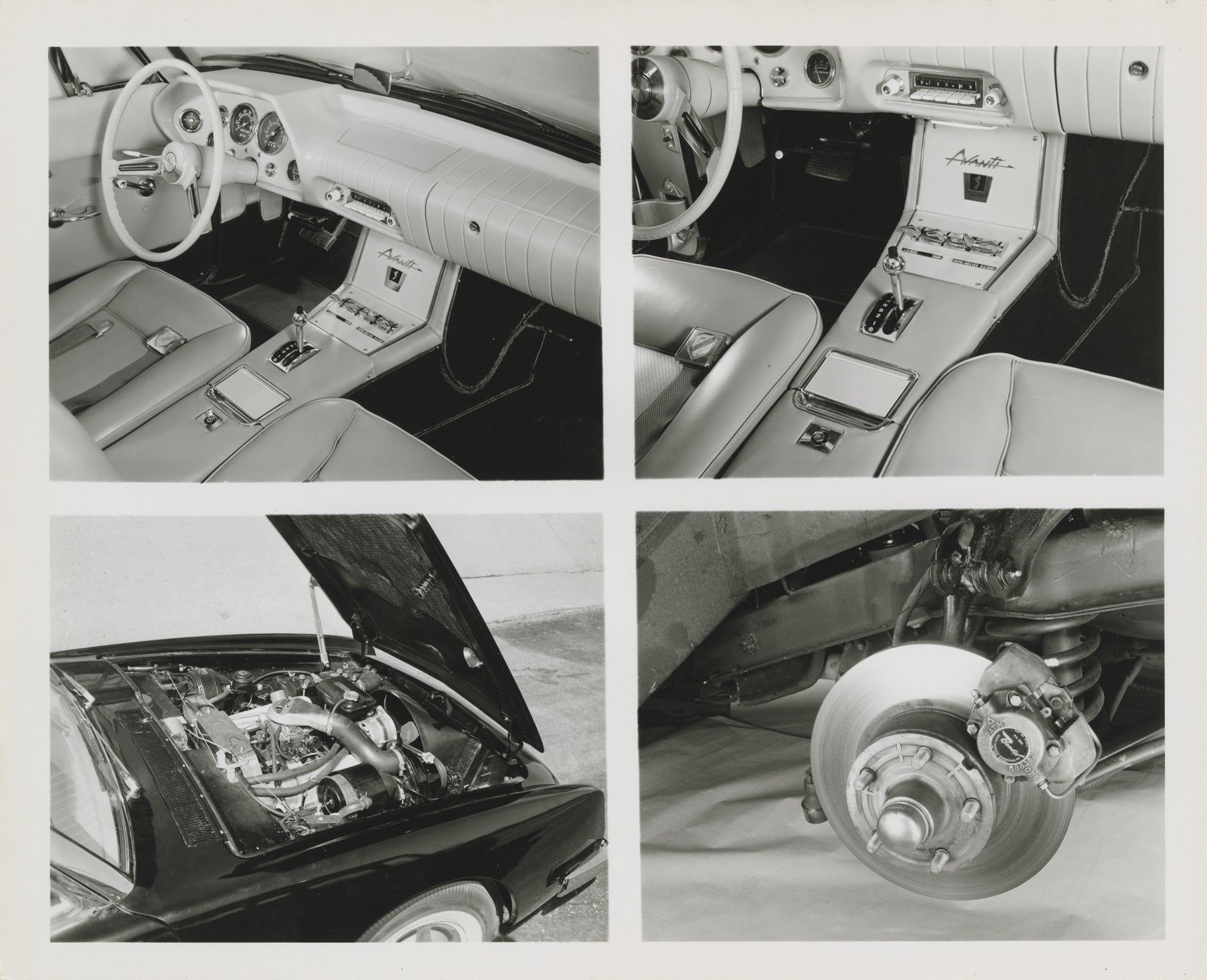 South Bend, IN: Studebaker, 1962. Collection of nine vintage publicity photographs of the Studebaker Avanti, including four double-weight color photographs and five black and white photographs, two of which are compilation photographs of the interior and details. The pool-side photograph, found in the collection, is of note as being from the same photo-shoot as the cover photograph of the June 1962 magazine "Palm Springs Life: The Magazine of the Desert Empire," which featured a cover article on the Avanti, "Avanti — Desert Designed Car."