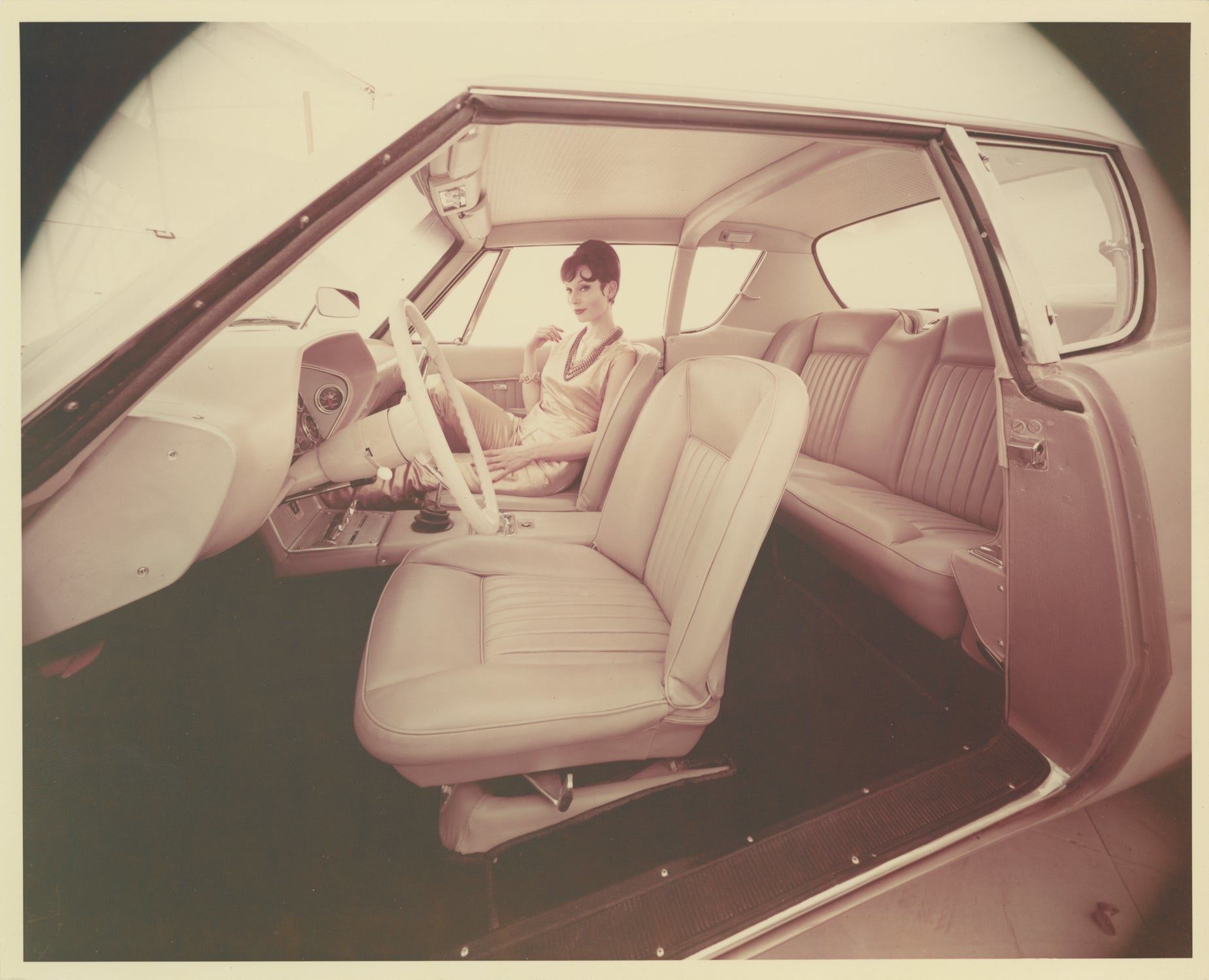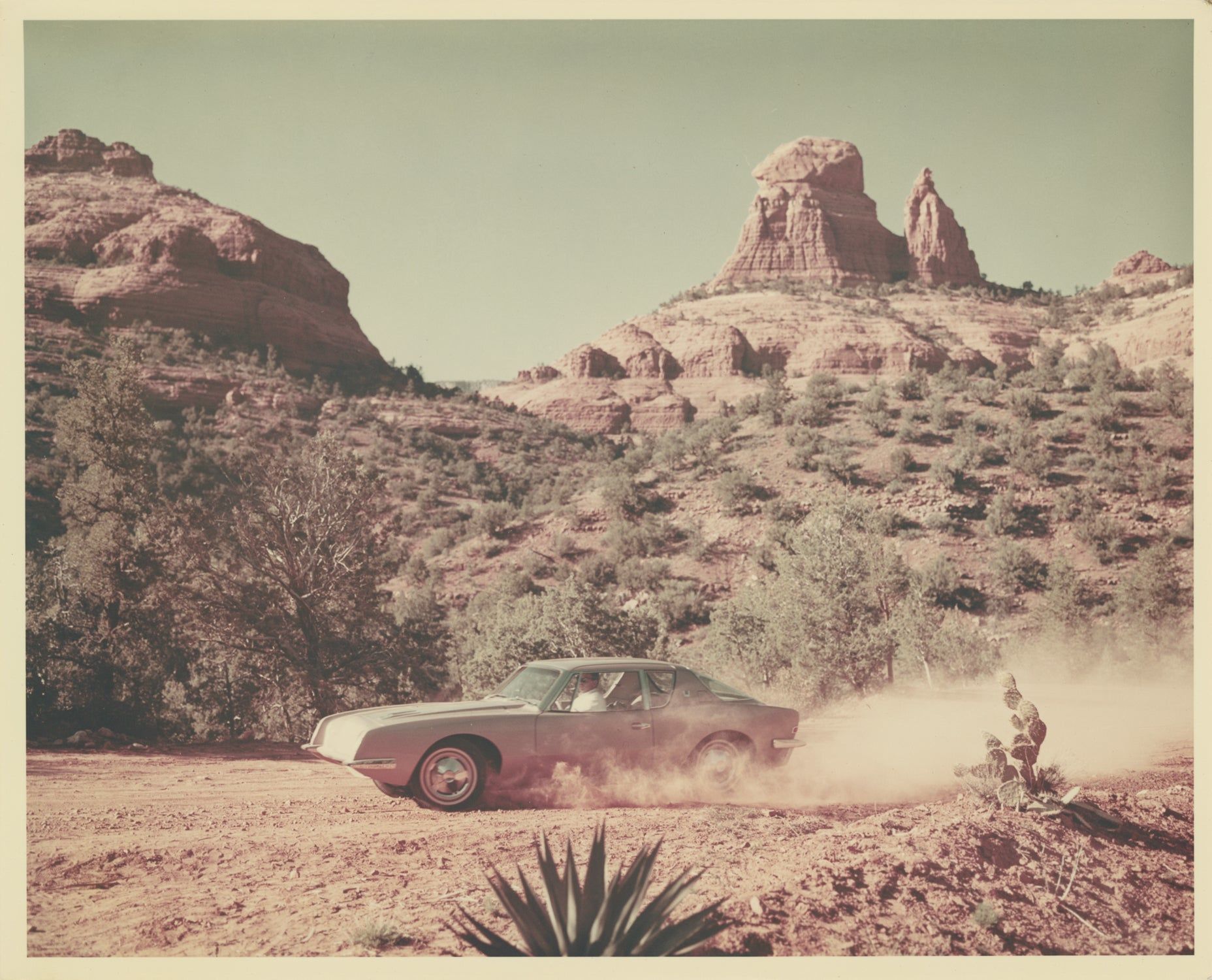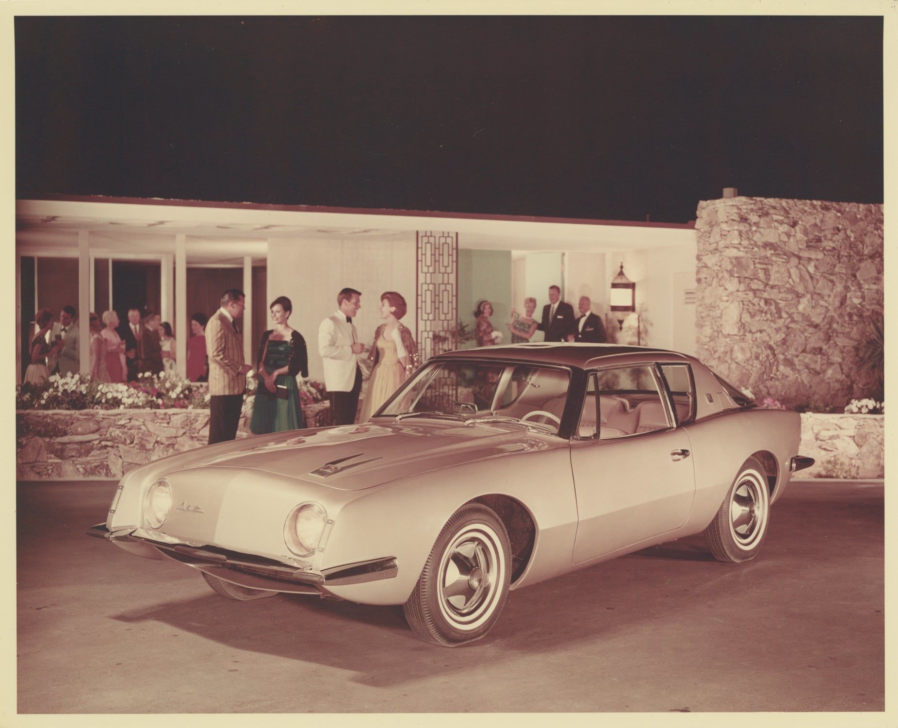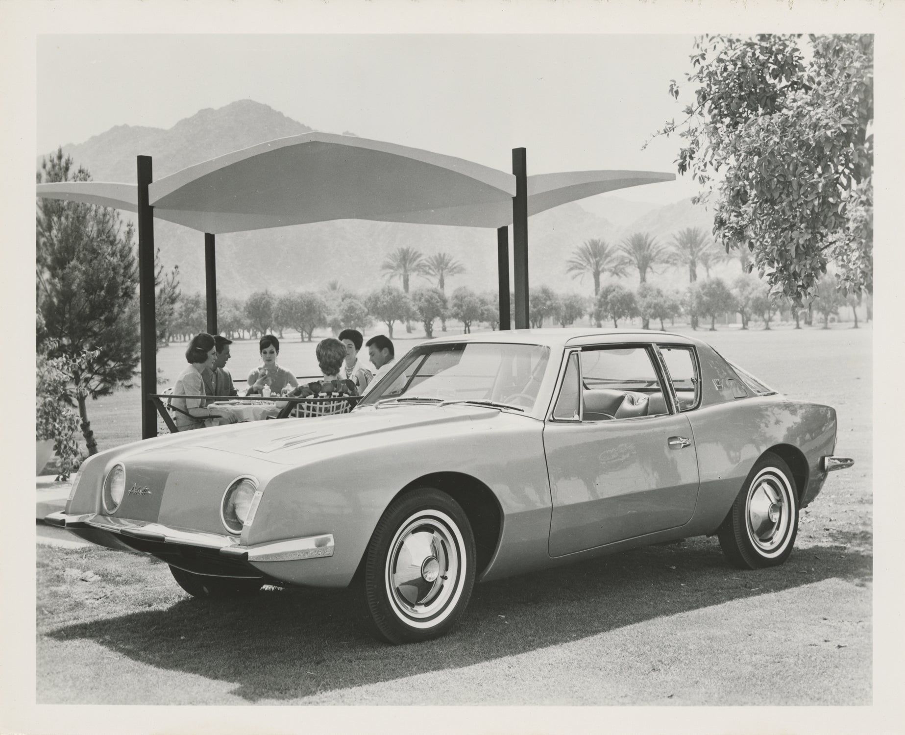 South Bend, IN: Studebaker, 1962. Collection of nine vintage publicity photographs of the Studebaker Avanti, including four double-weight color photographs and five black and white photographs, two of which are compilation photographs of the interior and details. The pool-side photograph, found in the collection, is of note as being from the same photo-shoot as the cover photograph of the June 1962 magazine "Palm Springs Life: The Magazine of the Desert Empire," which featured a cover article on the Avanti, "Avanti — Desert Designed Car."