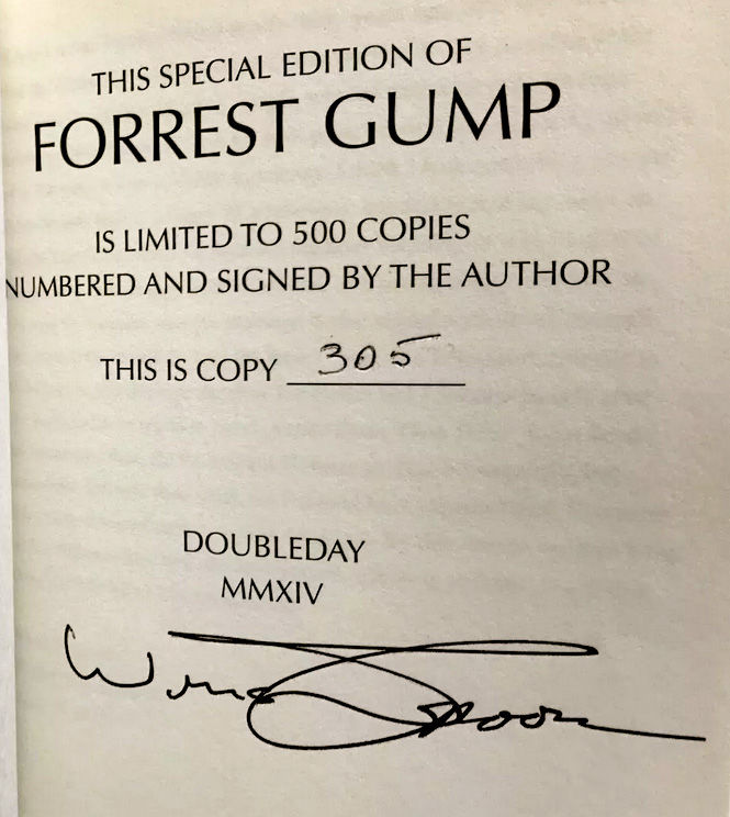 [New York]: Doubleday, 2014. Commemorative Edition. Hardcover. Fine in a Fine slipcase. Cloth in slipcase. Copy #305 of 500 SIGNED by the author on the limitation page. A reissue of this title made, of course, into the very popular film starring Tom Hanks. Includes a new introduction by Groom.