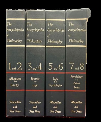 New York: Macmillan Publishing Co., Inc. & The Free Press, 1972. Reprint. Hardcover. Very Good. 529; 571; 521; 544pp. Quarto [26cm]. Each volume is bound in navy cloth, with title stamped in gilt on spine and front board. Corners are bumped. Sporadic rubbing to boards. The spine of 7 & 8 has been heavily bumped at head. The cloth is split, exposing the binding. A thorough reference guide, with topics from Abbagnamo to Zubiri.