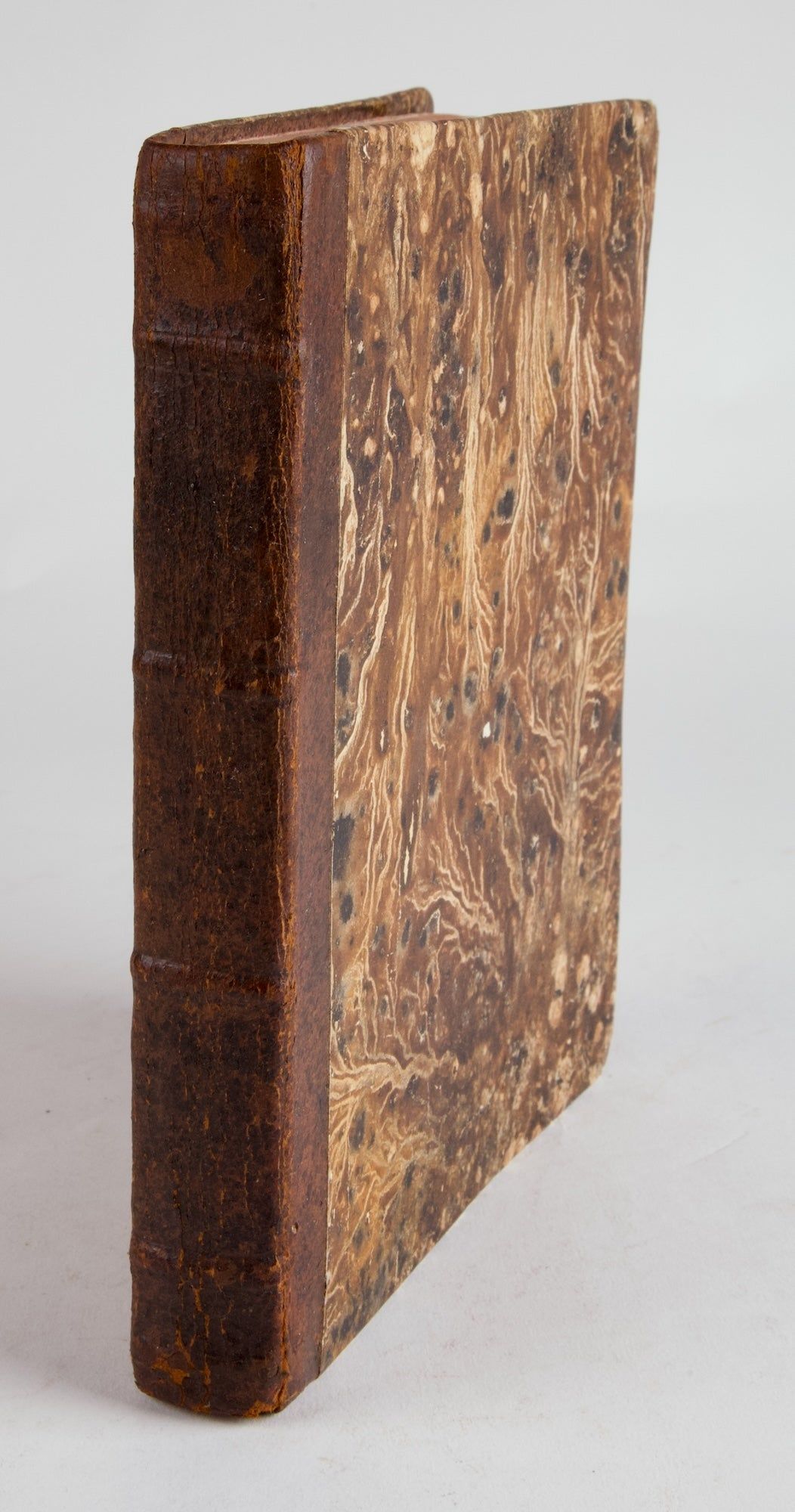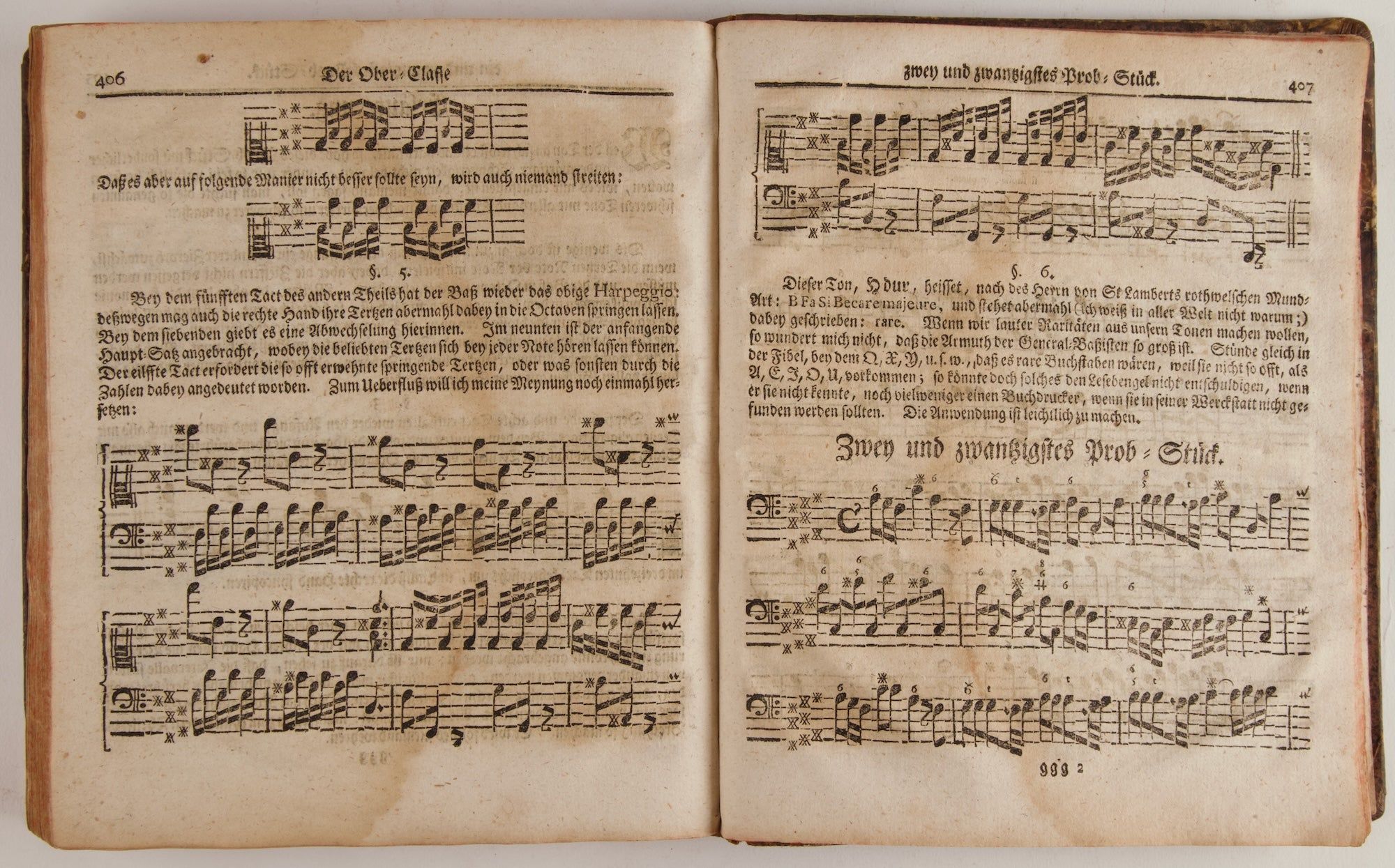 Hamburg: Johann Christoph Kissners Buchladen, 1731. Quarto. Dark brown leather-backed marbled boards, red speckled edges. 1f. (recto blank, verso frontispiece), 1f. (recto title, verso blank), 18 preliminary leaves, 460 pp., with "Register" to pp. 442-459). With numerous typeset musical examples, including 2 folding plates (pp. 242-243, with pp. 241 and 244 blank, as issued). Occasional woodcut running heads and decorative head- and tailpieces.