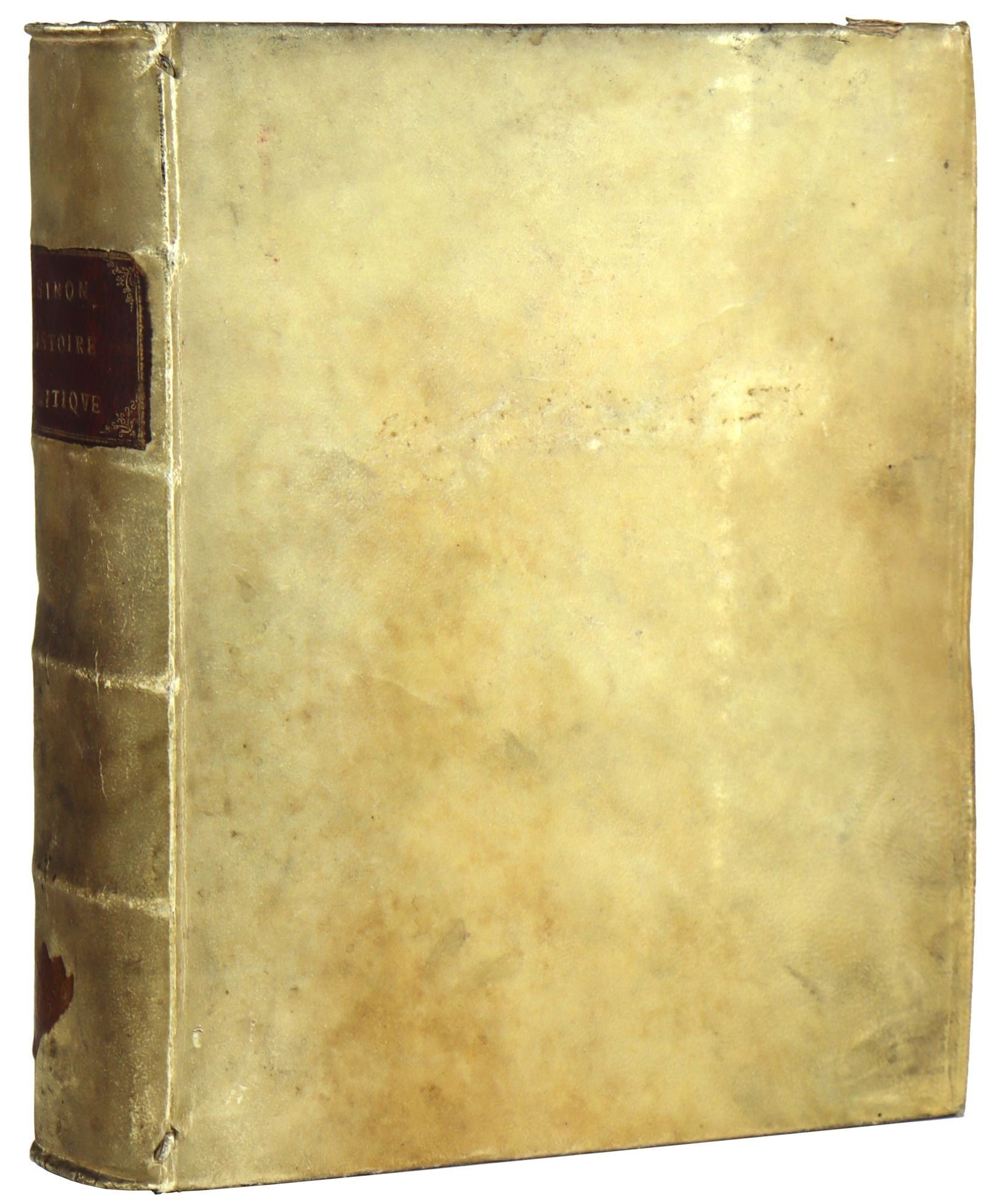 Significant and controversial study of the Old Testament by the French priest and Oratorian Richard Simon (1638-1712). Originally published in Paris after having past the censors, Simon's argument that Moses could not have been the author of most of the works attributed to him gained the attention of Jacques-Benigne Bossuet, tutor of the Dauphin, who obtained a decree from the Royal Council. Subsequently the entire first printing was seized and burned. Undeterred, the work travelled north and went through several substantial printings in Rotterdam and Amsterdam.