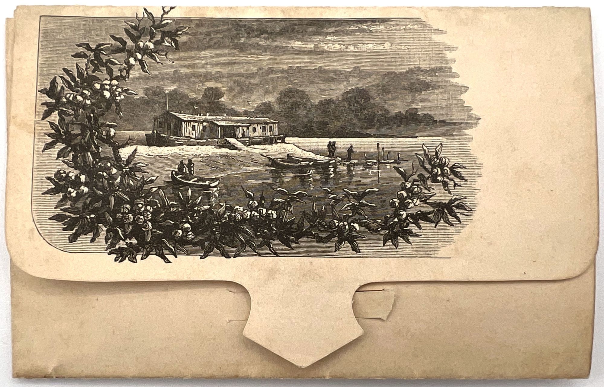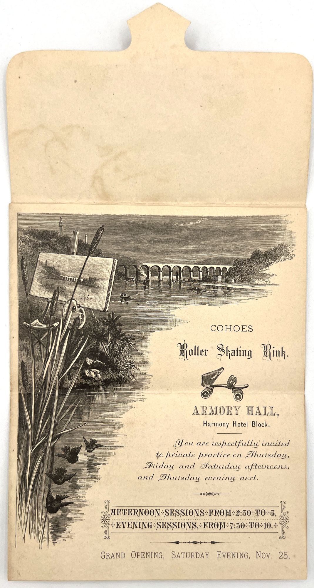 Cohoes, New York, 1890. Very good. Toned, minor dust soiling, small tear to flap where envelope is fastened.. An attractive folding invitation to a private roller skating session at a new roller skating rink in Cohoes, New York. Illustrated with a bucolic scene of a pond with artist's easel, and also a fishing scene on the upper flap. Promotes the "Grand Opening" of the rink on the evening of November 25th. Measures 3.25" by 5" folded.