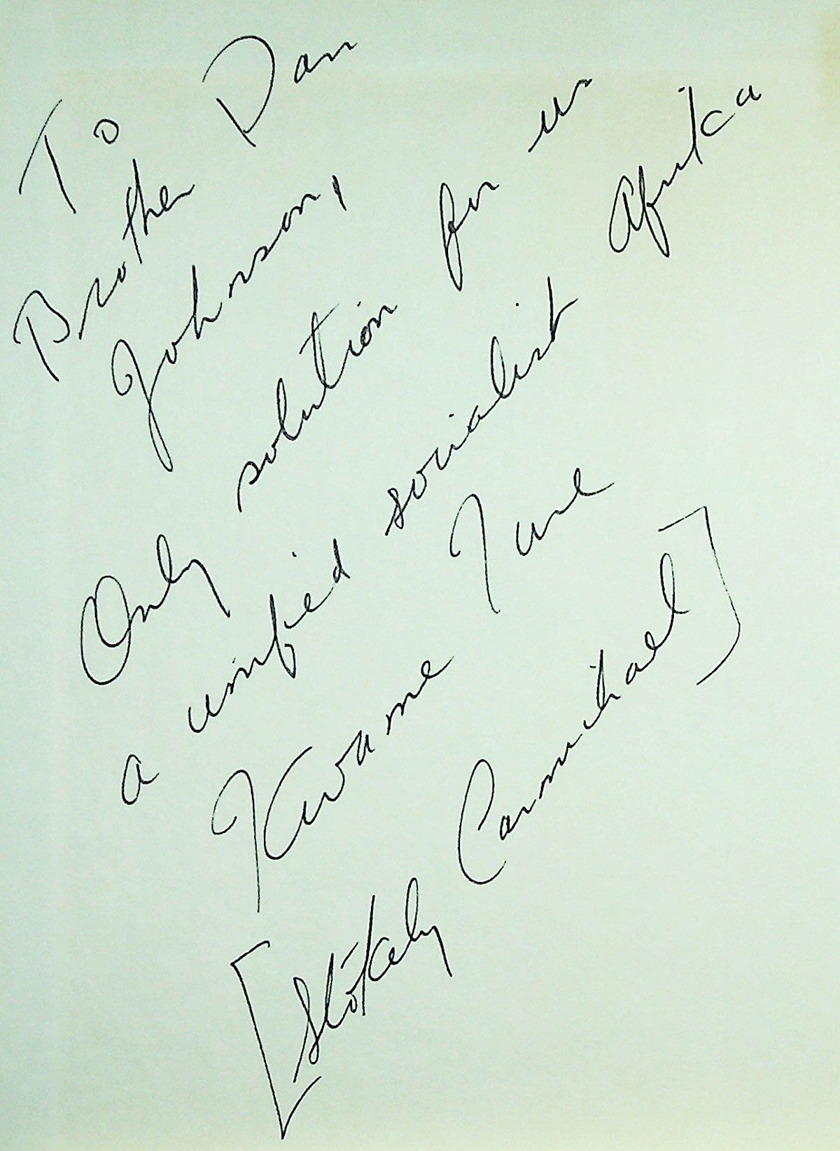 New York: Random House, 1971. First Edition. First Printing. Octavo (21.5cm); black cloth, titled in copper on spine, with pictorial elements embossed onto front cover; dustjacket; xxii,229,[5]pp. Inscribed by the author on the front pastedown: "To Brother Dan Johnson / Only solution for us / a unified socialist Afrika / Kwame Ture / [Stokely Carmichael]. Touch of offsetting to gutter at front endpaper, else Fine in a Near Fine dustjacket, unclipped (priced $6.95), with some gentle sunning to spine.