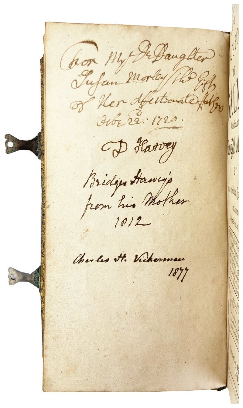 Front front flyleaf verso adorned with four ownership inscriptions: "For my Daughter Susan Morley [?] the Gift of Her Affectionate Father / Octr. 22, 1720"; D. Harvey (undated); "Bridges (?) Harvey's from his Mother / 1812"; and Charles H. Vickermore, 1877.