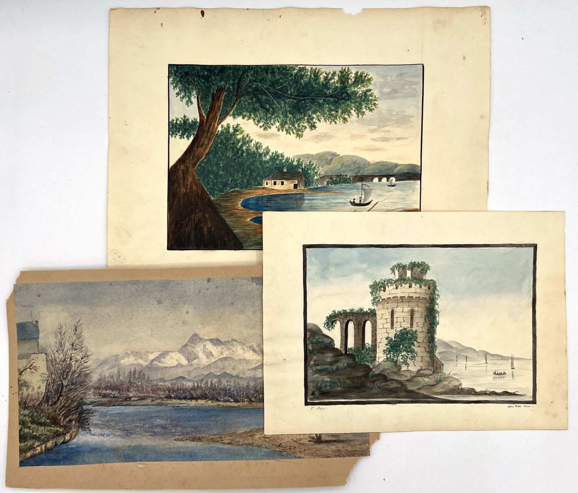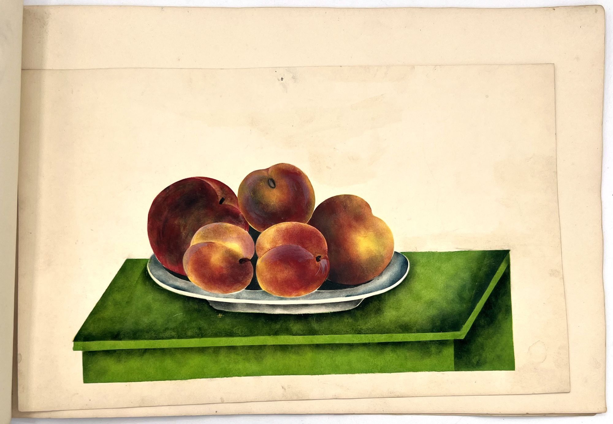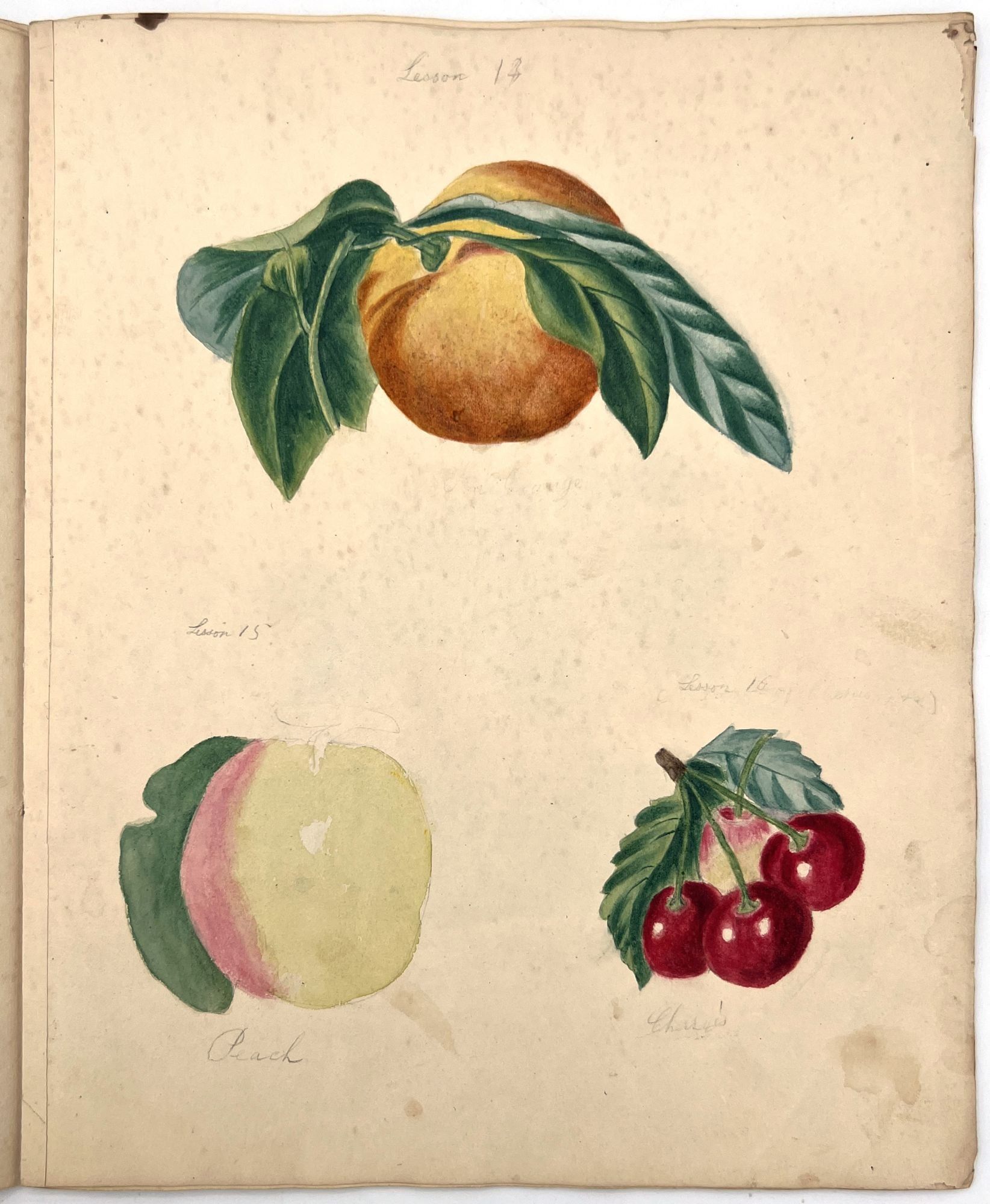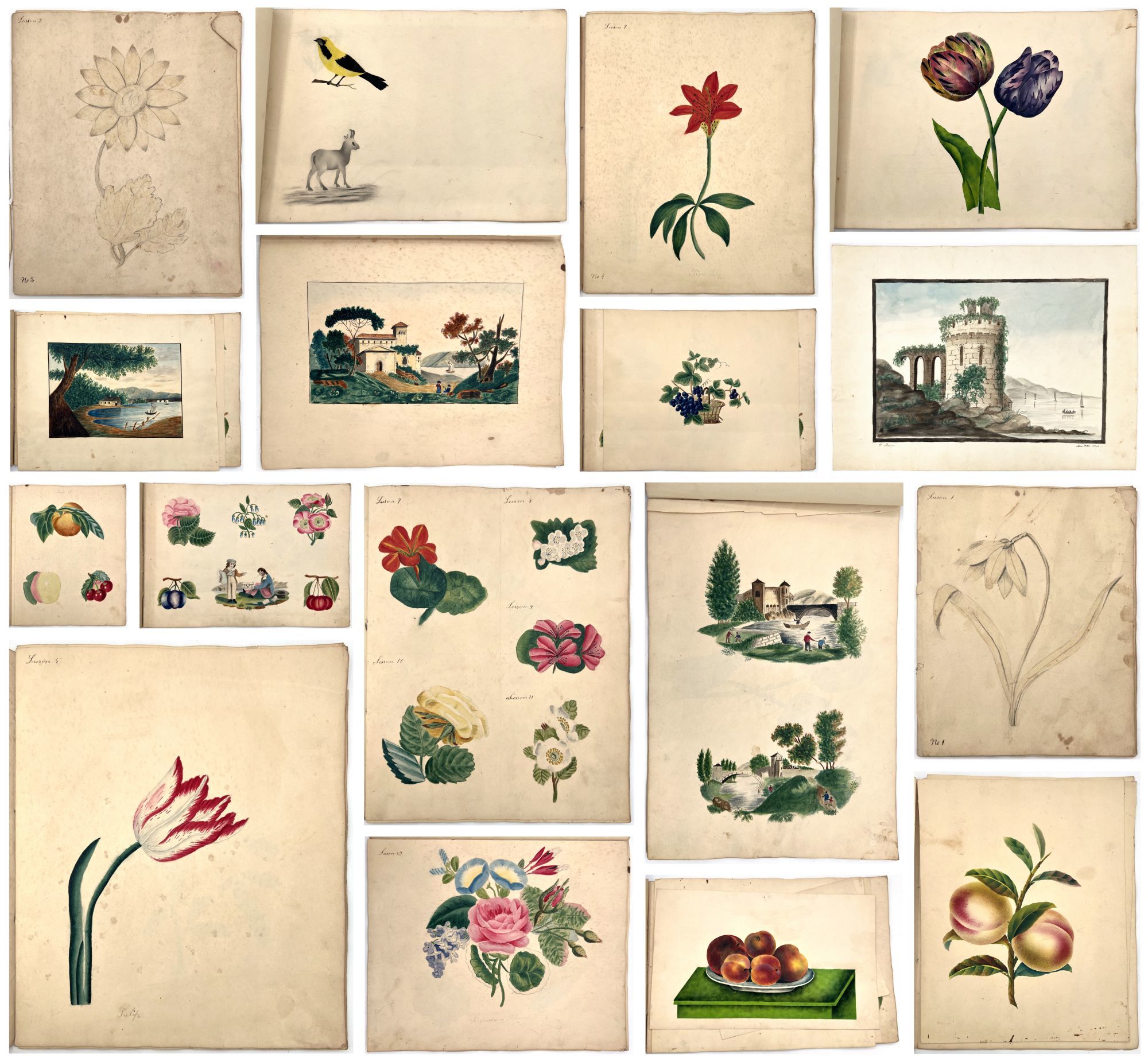 [Untitled sketchbook of botanical drawings and paintings by E. Slater. Portland, Maine, c.1850]. Unbound gathering of 16 blank leaves, with approx. eighteen (18) pencil sketches and watercolor/gouache paintings, mainly of botanical subjects (e.g. tiger lily, fruit) and with one very accomplished landscape depicting an Italian (?) villa against mountains and lake. Also includes three (3) scrap pieces of paper with paintings of similar subjects, for a total of twenty-one (21) pieces. Most of the botanicals are labeled in ink or pencil with a lesson number (e.g. "Lesson 2").
