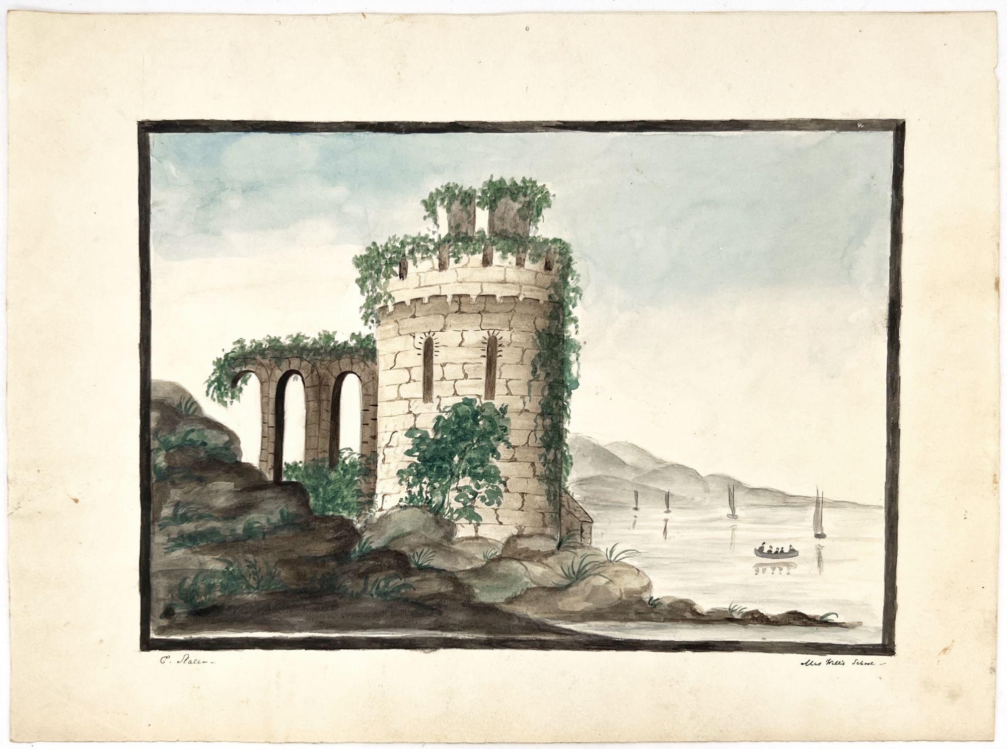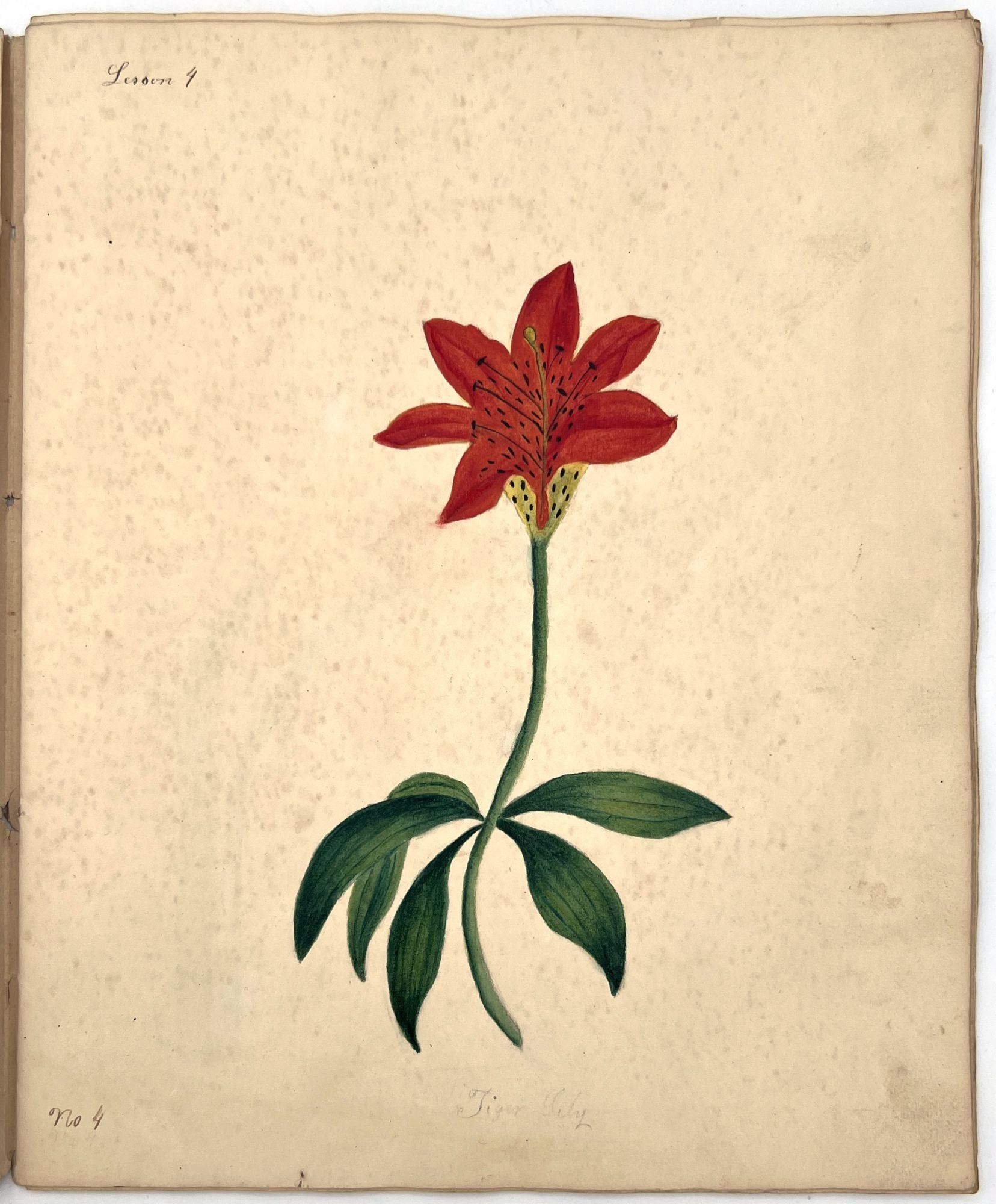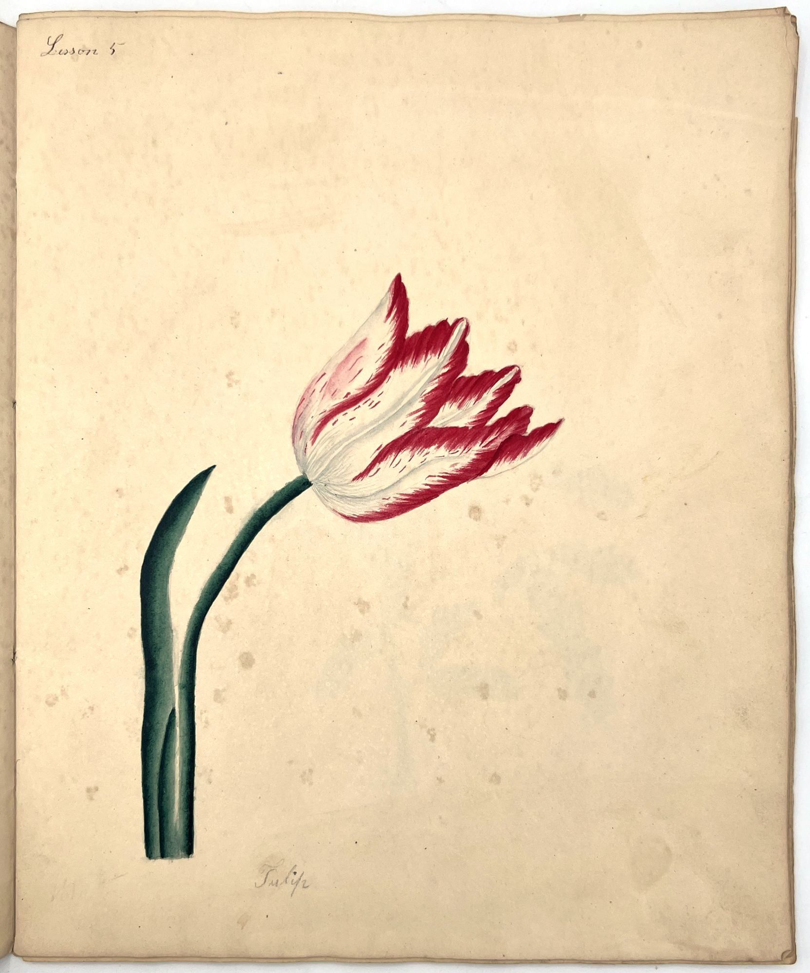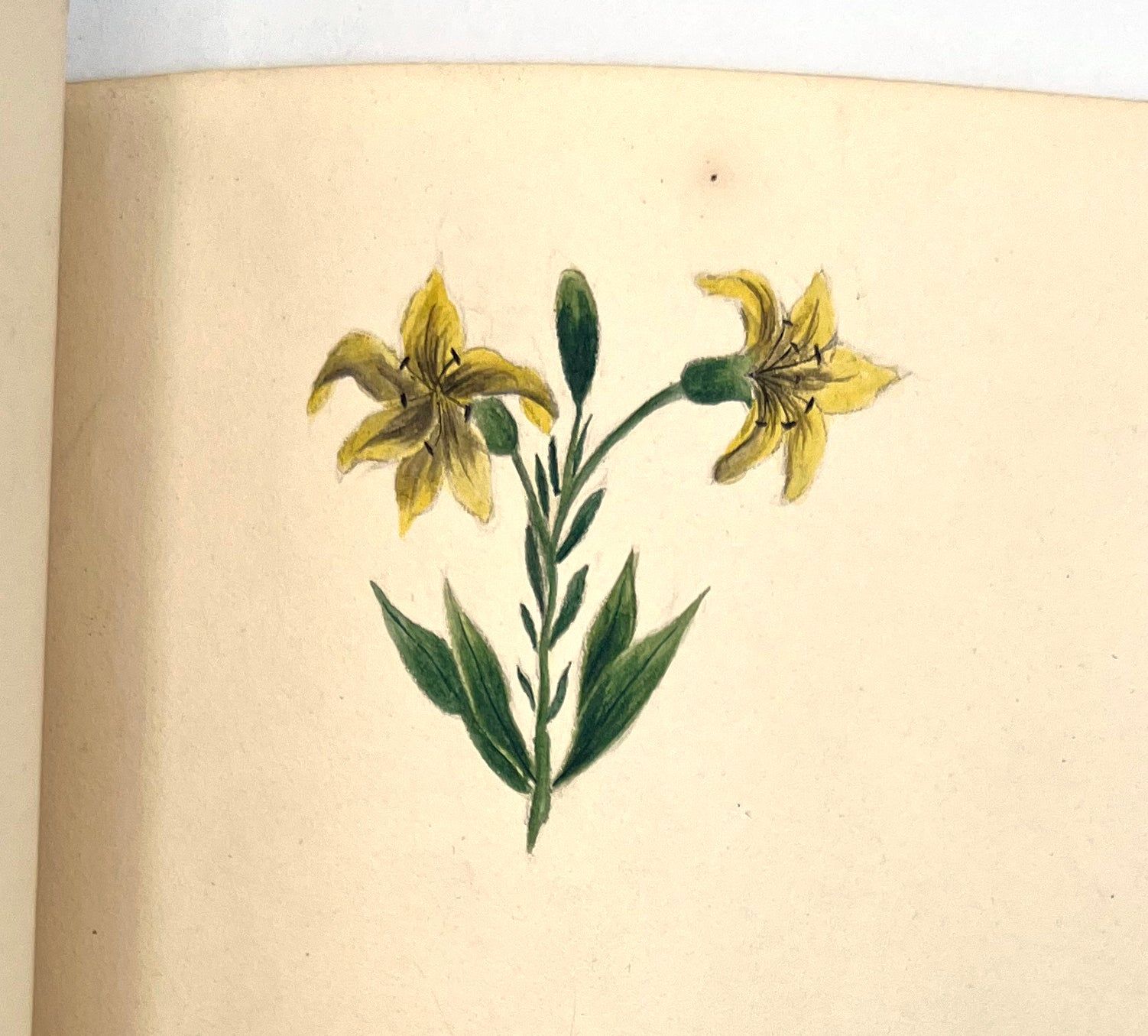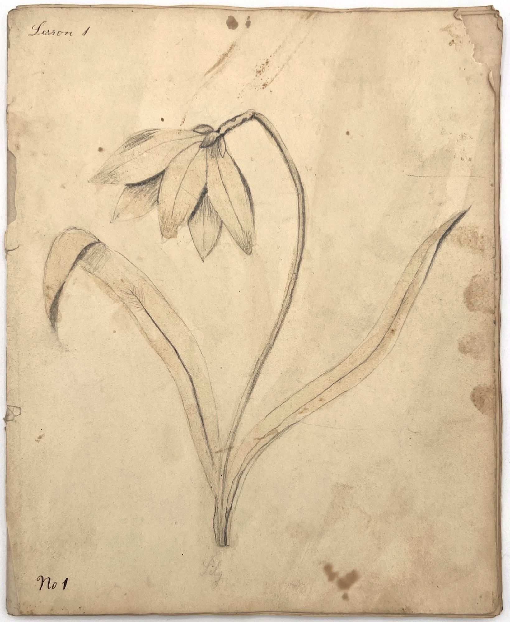 [Untitled sketchbook of botanical drawings and paintings by E. Slater. Portland, Maine, c.1850]. Unbound gathering of 16 blank leaves, with approx. eighteen (18) pencil sketches and watercolor/gouache paintings, mainly of botanical subjects (e.g. tiger lily, fruit) and with one very accomplished landscape depicting an Italian (?) villa against mountains and lake. Also includes three (3) scrap pieces of paper with paintings of similar subjects, for a total of twenty-one (21) pieces. Most of the botanicals are labeled in ink or pencil with a lesson number (e.g. "Lesson 2").