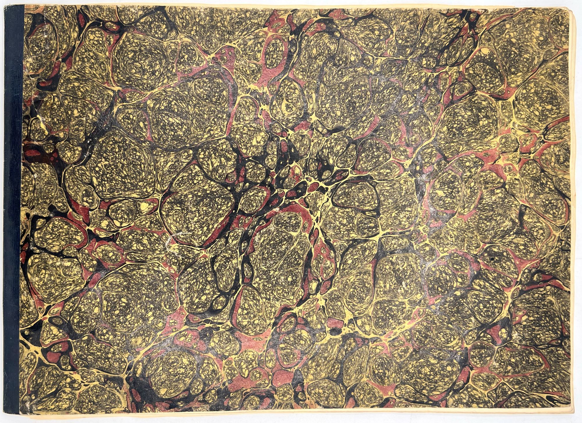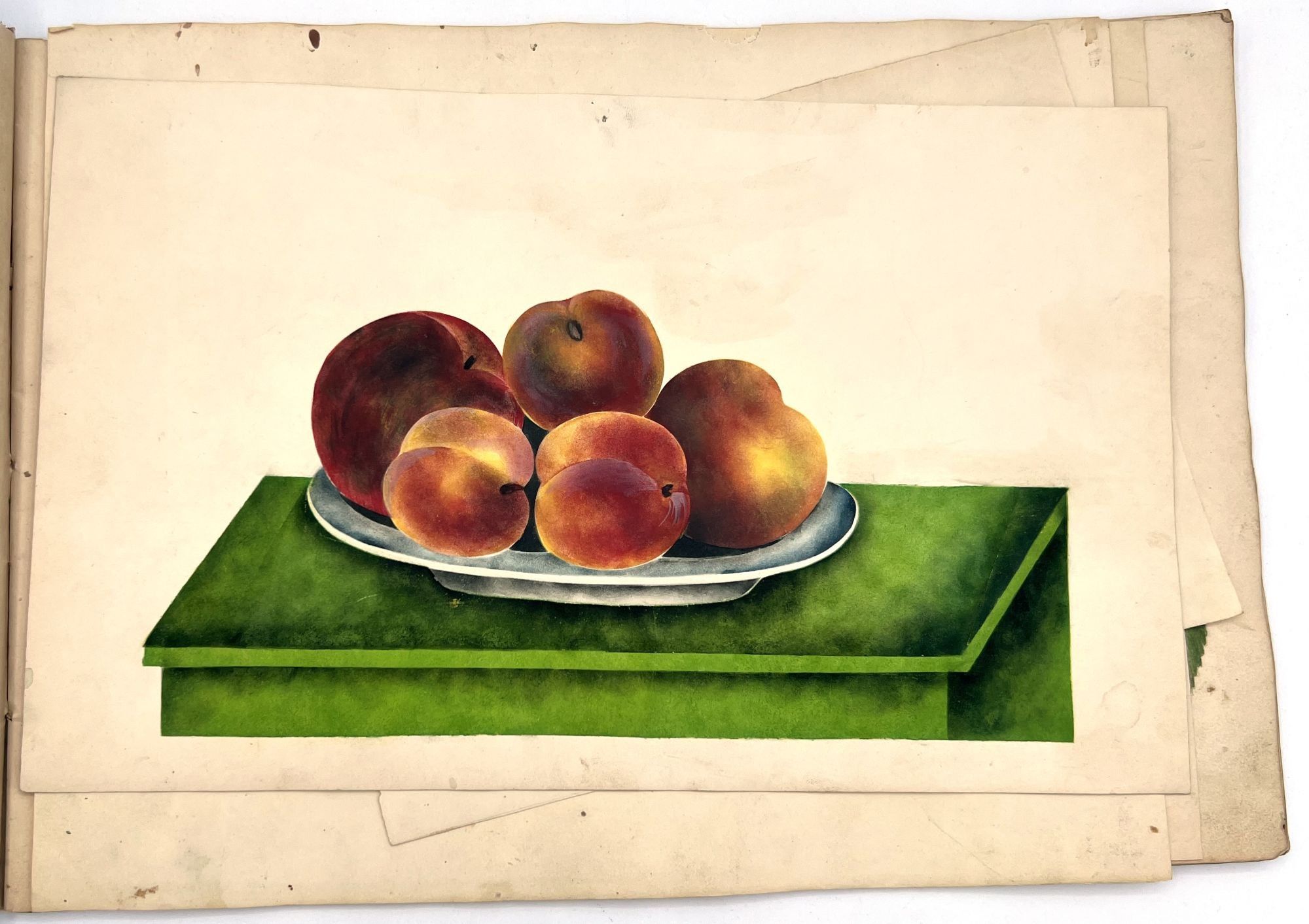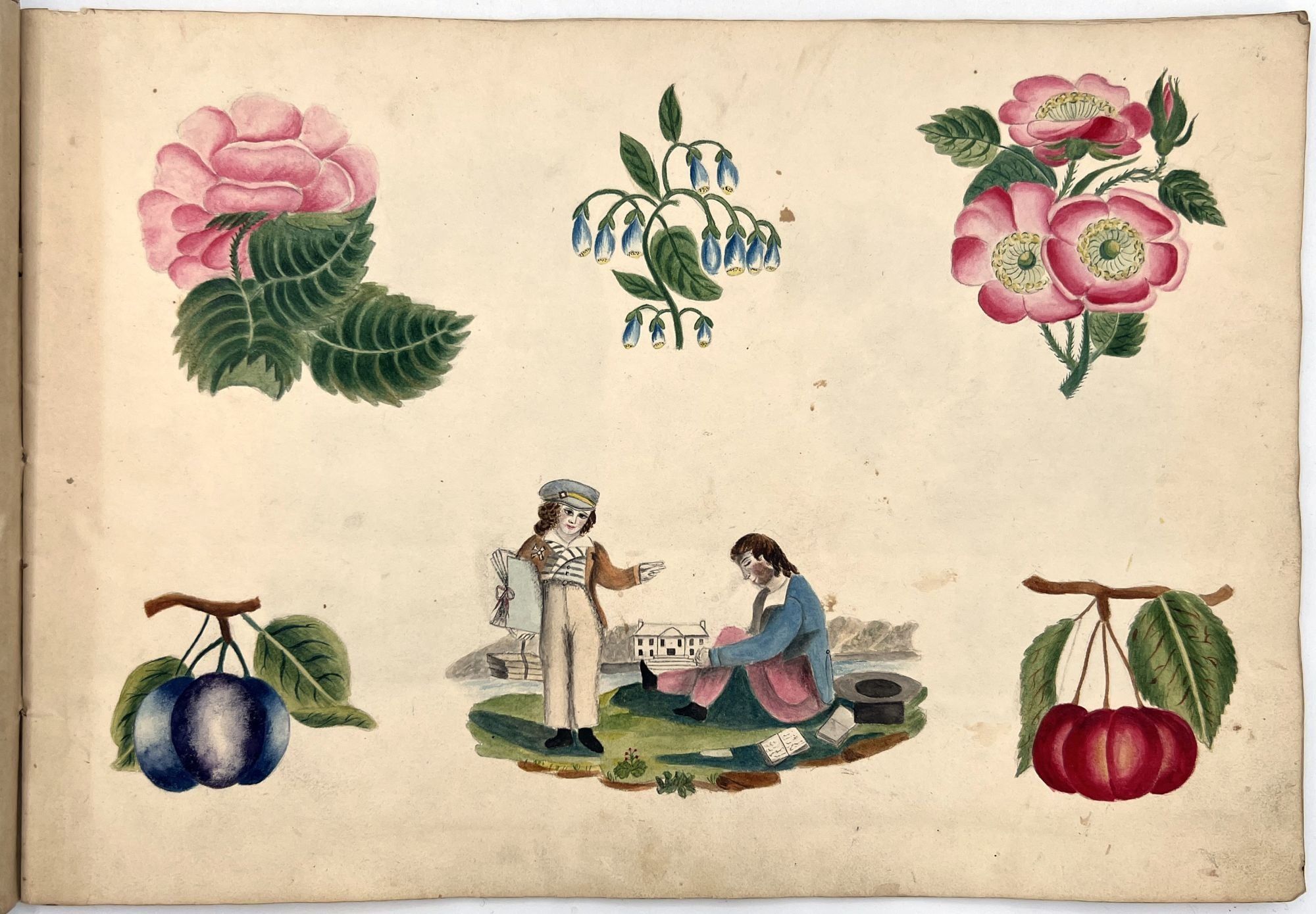 [Untitled sketchbook of botanical drawings and paintings by E. Slater. Portland, Maine, c.1850]. Blank sketchbook (9" by 13"), approx. ten blank leaves with approx. four (4) inserted scraps/leaves from other sketchbooks, in original marbled wrappers back in black leather. Sketchbook contains approx. six (6) paintings in gouache or watercolor with pencil, with majority of leaves blank. Subjects include still life of fruit, landscapes with pastoral scenery. One particularly nice loose painting attributed in ink to "E. Staten" in lower left-hand corner of Romantic/pastoral European ruins.