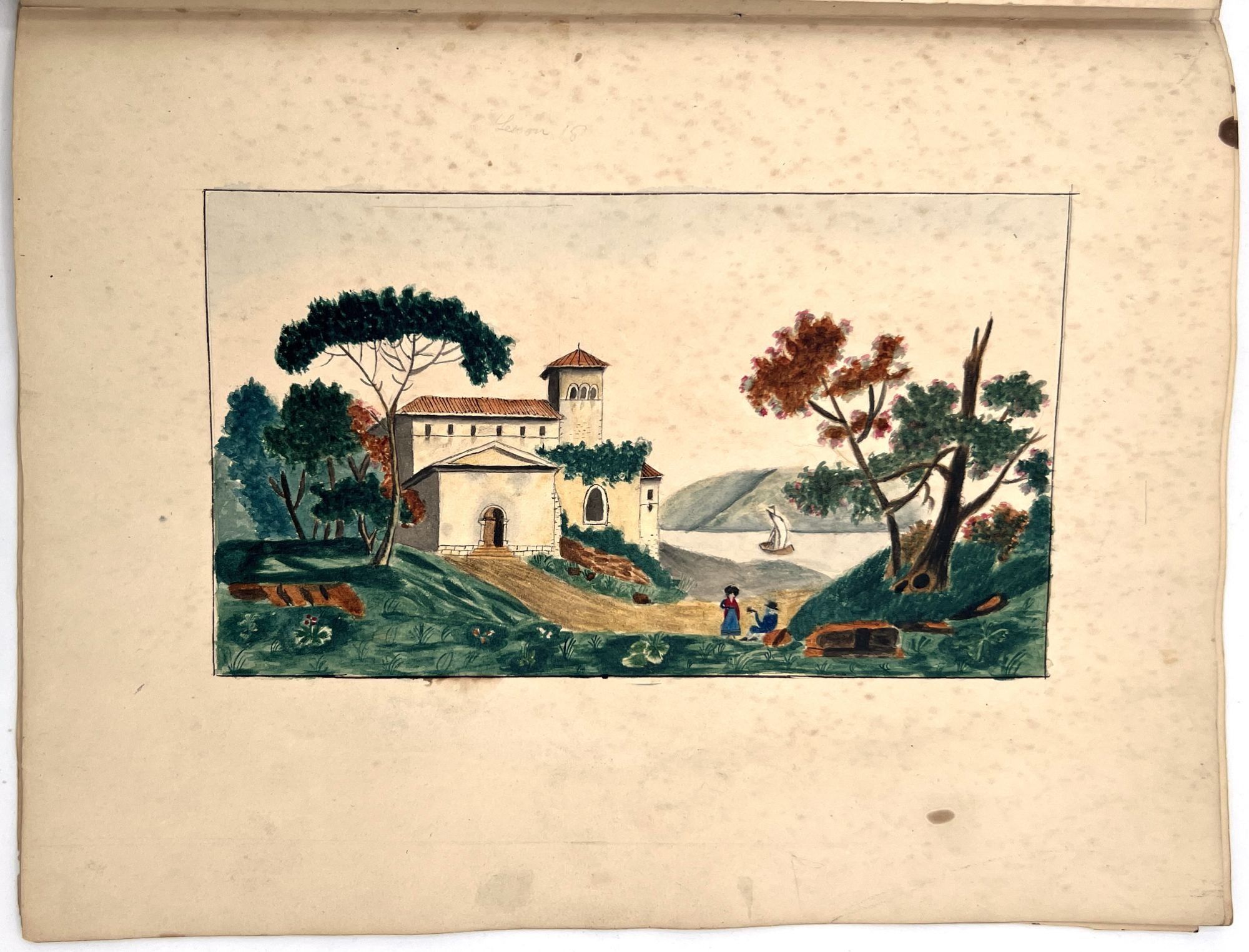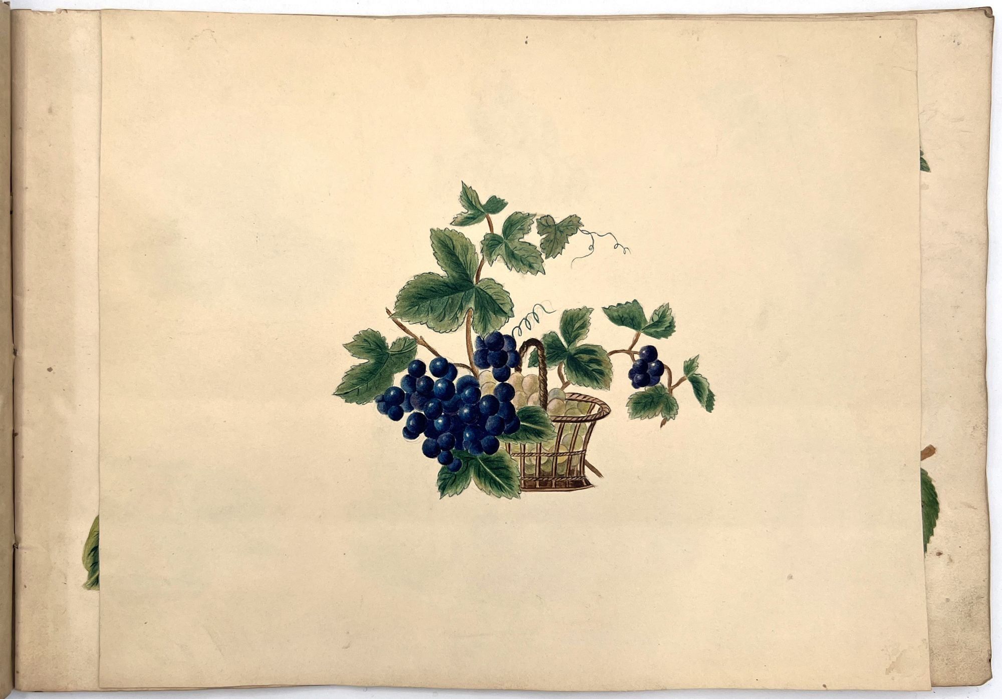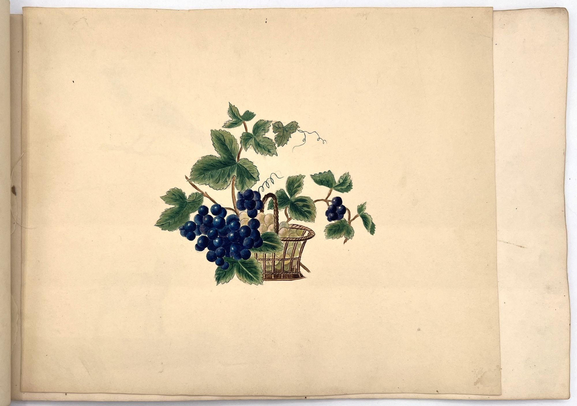 [Untitled sketchbook of botanical drawings and paintings by E. Slater. Portland, Maine, c.1850]. Blank sketchbook (9" by 13"), approx. ten blank leaves with approx. four (4) inserted scraps/leaves from other sketchbooks, in original marbled wrappers back in black leather. Sketchbook contains approx. six (6) paintings in gouache or watercolor with pencil, with majority of leaves blank. Subjects include still life of fruit, landscapes with pastoral scenery. One particularly nice loose painting attributed in ink to "E. Staten" in lower left-hand corner of Romantic/pastoral European ruins.