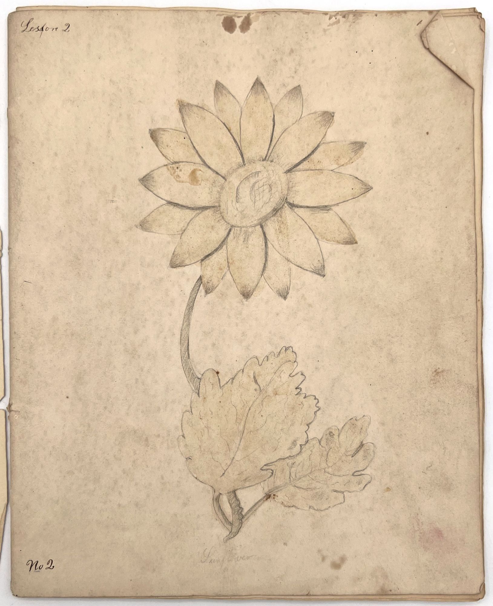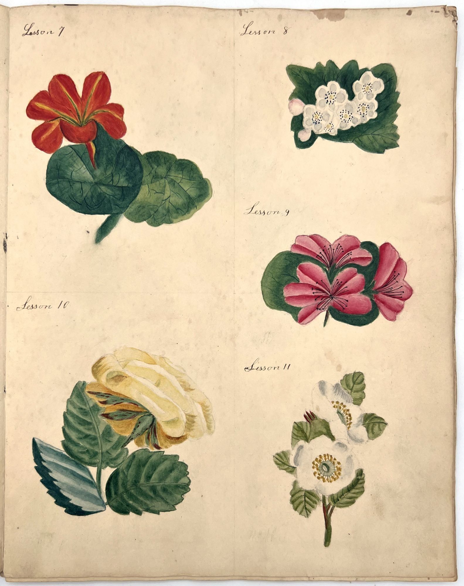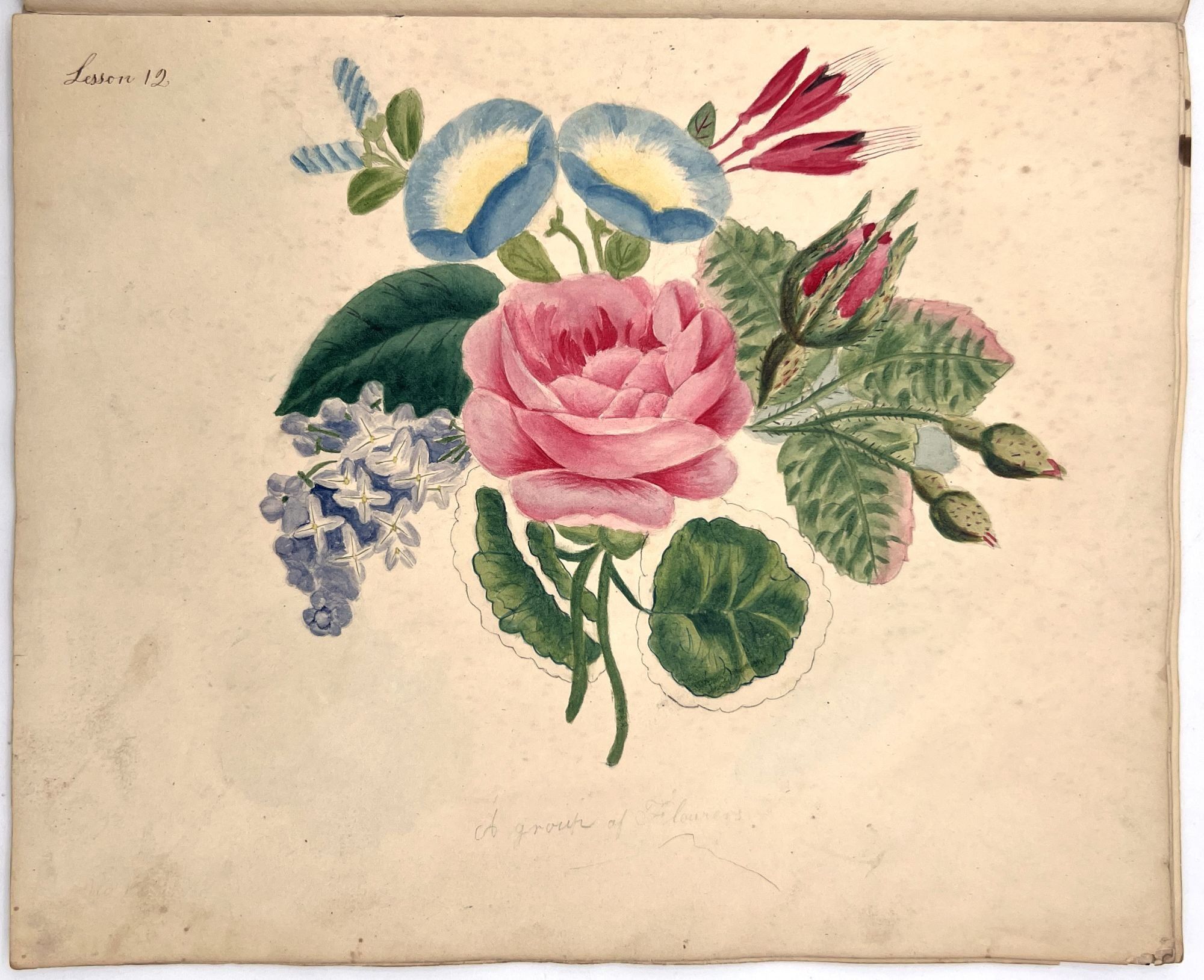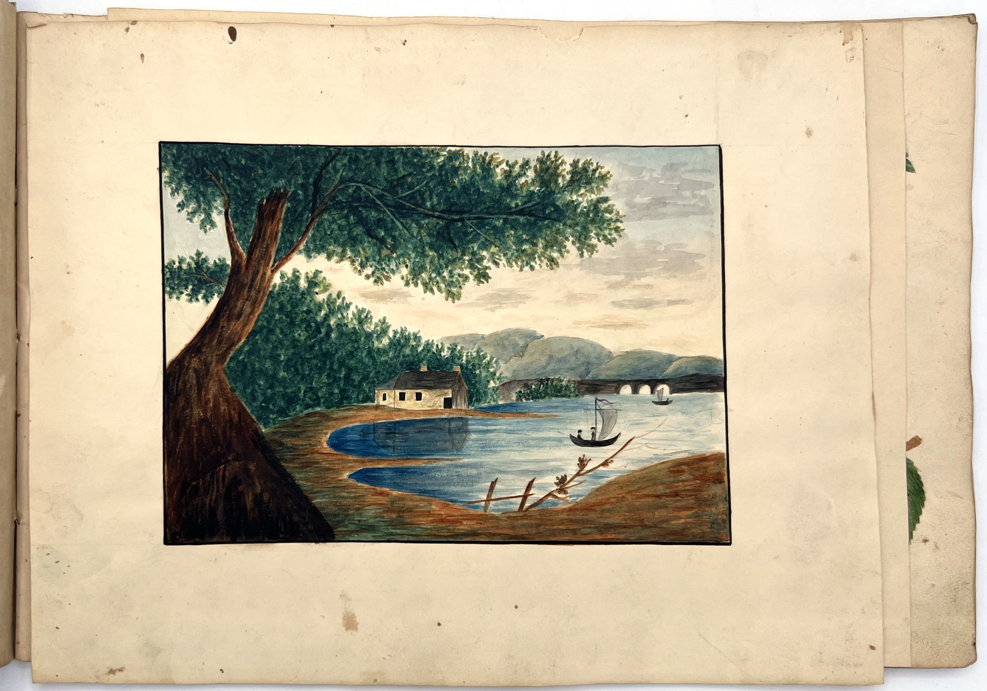 Portland, Maine, 1850. Good to very good. Some toning, dust soiling, short tears or nicks. Sewing a little loose. Minor wear.. A fine group of artwork completed by a student for her lessons at Mrs. L.K. Wells' High School for Misses in Portland, Maine (also referred to as the "Park Street Boarding and Day School for Young Ladies", at 36 Park Street). Subjects offered at the school included modern languages, needle work, music, English, and, of course, art and drawing. The student, who identifies herself on some of these pieces as "E. Slater", shows clear improvement over the course of the drawings, going from basic pencil drawings of flowers to complex and finely detailed pastoral landscapes. Also of note is her distinctive style of working with watercolor and gouache that, coupled with what appears to be stenciling, effectively mimics chromolithography in a unique and very beautiful manner in some of the pieces. The student (or perhaps, her teacher's) chosen subjects appear to be largely botanical, tying the artist to a long tradition of women and girls creating herbaria. Interesting to see the clear progression of her artwork, which gains detail, insight, and skill as she practices. The artwork is housed in two albums: