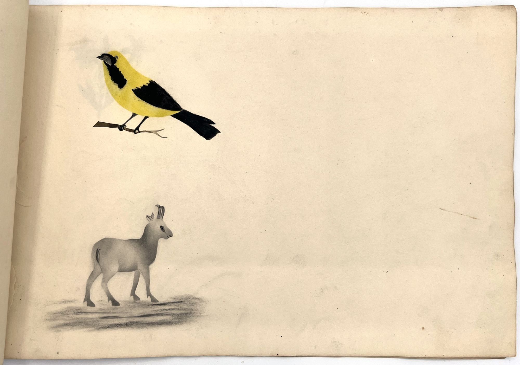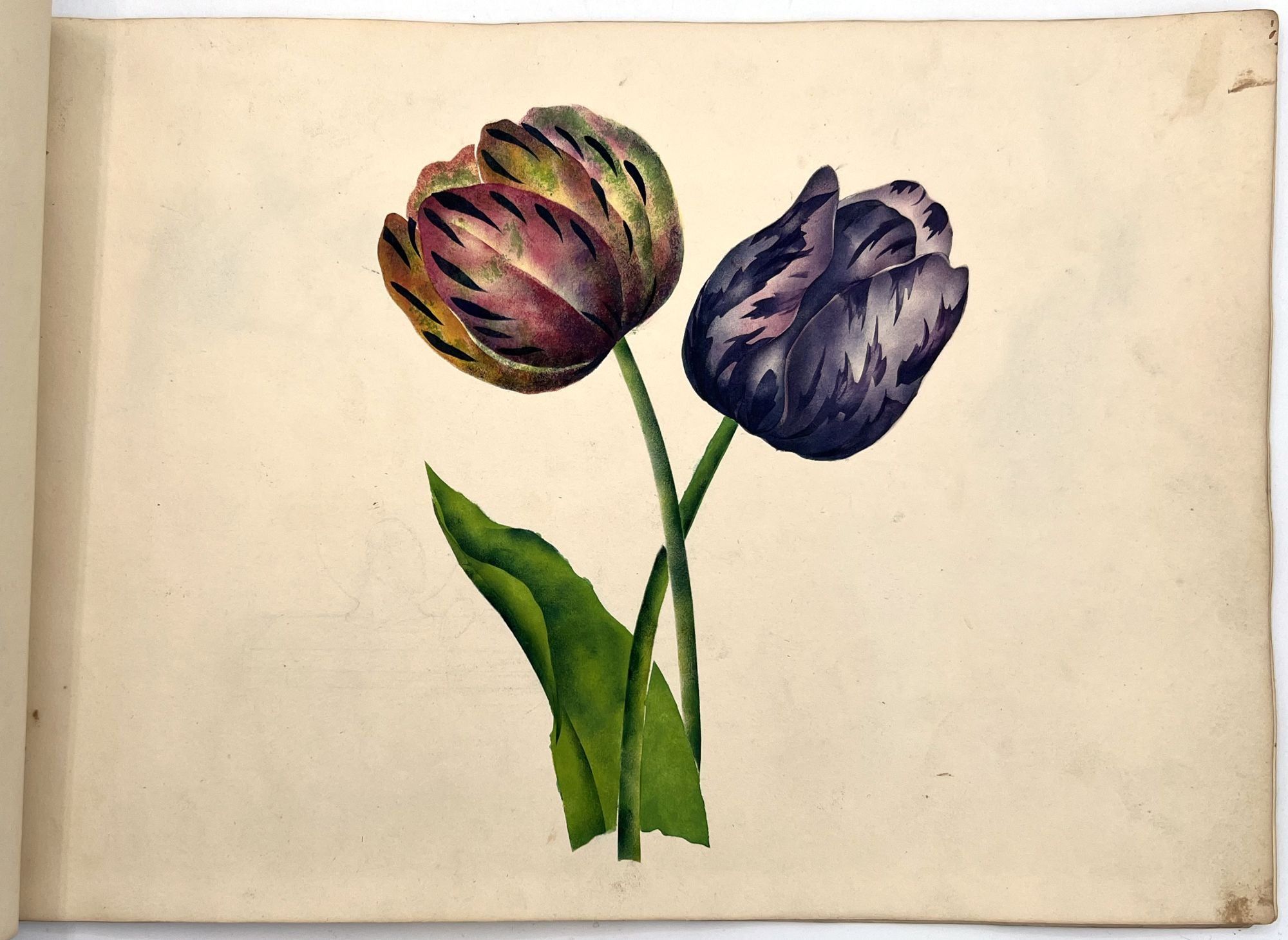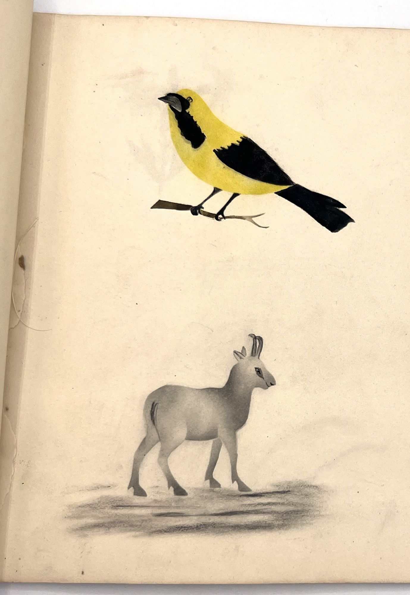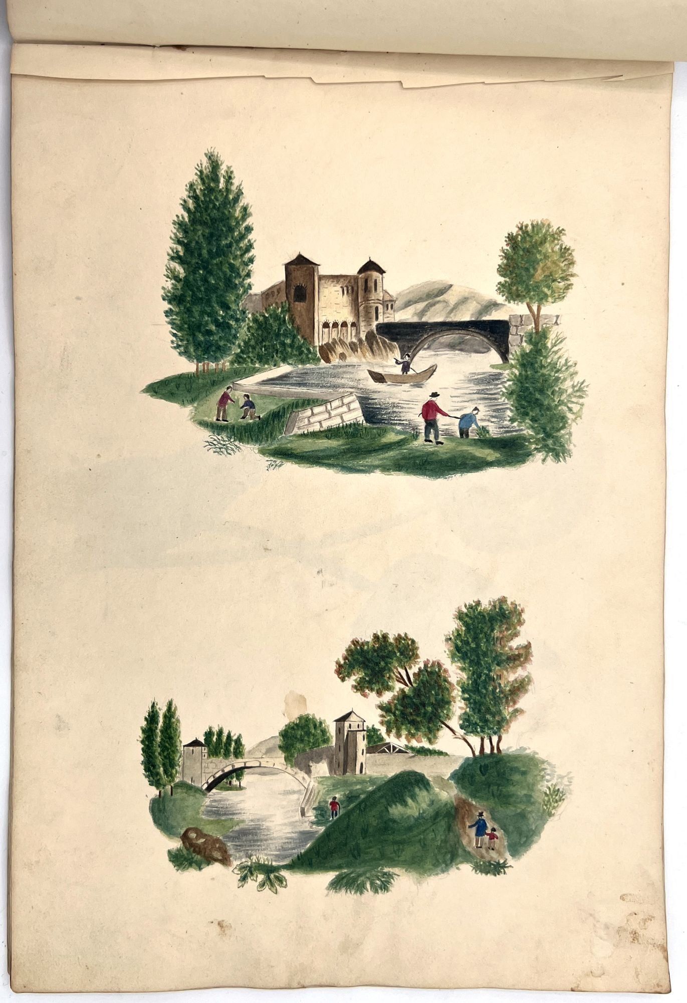 Portland, Maine, 1850. Good to very good. Some toning, dust soiling, short tears or nicks. Sewing a little loose. Minor wear.. A fine group of artwork completed by a student for her lessons at Mrs. L.K. Wells' High School for Misses in Portland, Maine (also referred to as the "Park Street Boarding and Day School for Young Ladies", at 36 Park Street). Subjects offered at the school included modern languages, needle work, music, English, and, of course, art and drawing. The student, who identifies herself on some of these pieces as "E. Slater", shows clear improvement over the course of the drawings, going from basic pencil drawings of flowers to complex and finely detailed pastoral landscapes. Also of note is her distinctive style of working with watercolor and gouache that, coupled with what appears to be stenciling, effectively mimics chromolithography in a unique and very beautiful manner in some of the pieces. The student (or perhaps, her teacher's) chosen subjects appear to be largely botanical, tying the artist to a long tradition of women and girls creating herbaria. Interesting to see the clear progression of her artwork, which gains detail, insight, and skill as she practices. The artwork is housed in two albums: