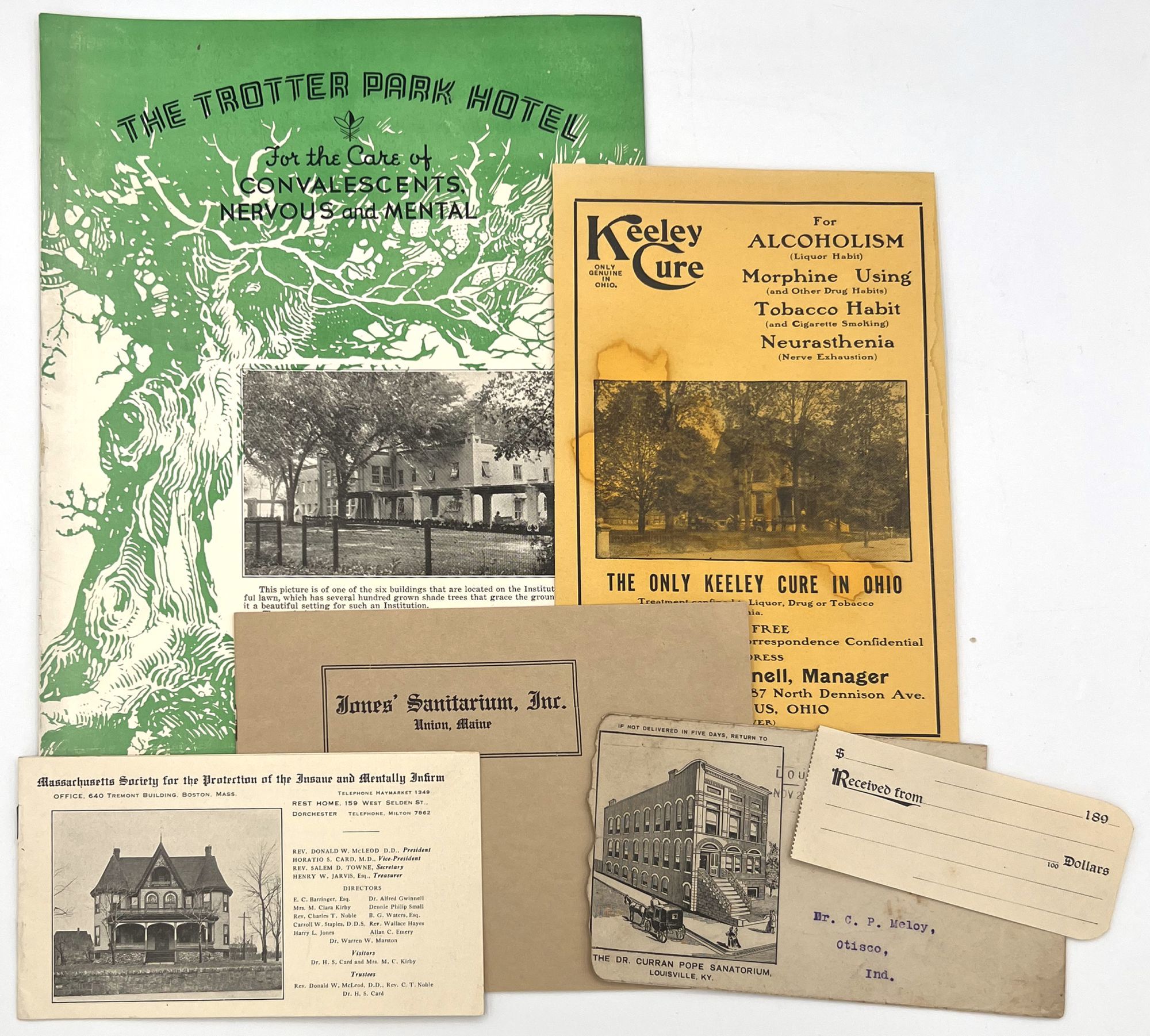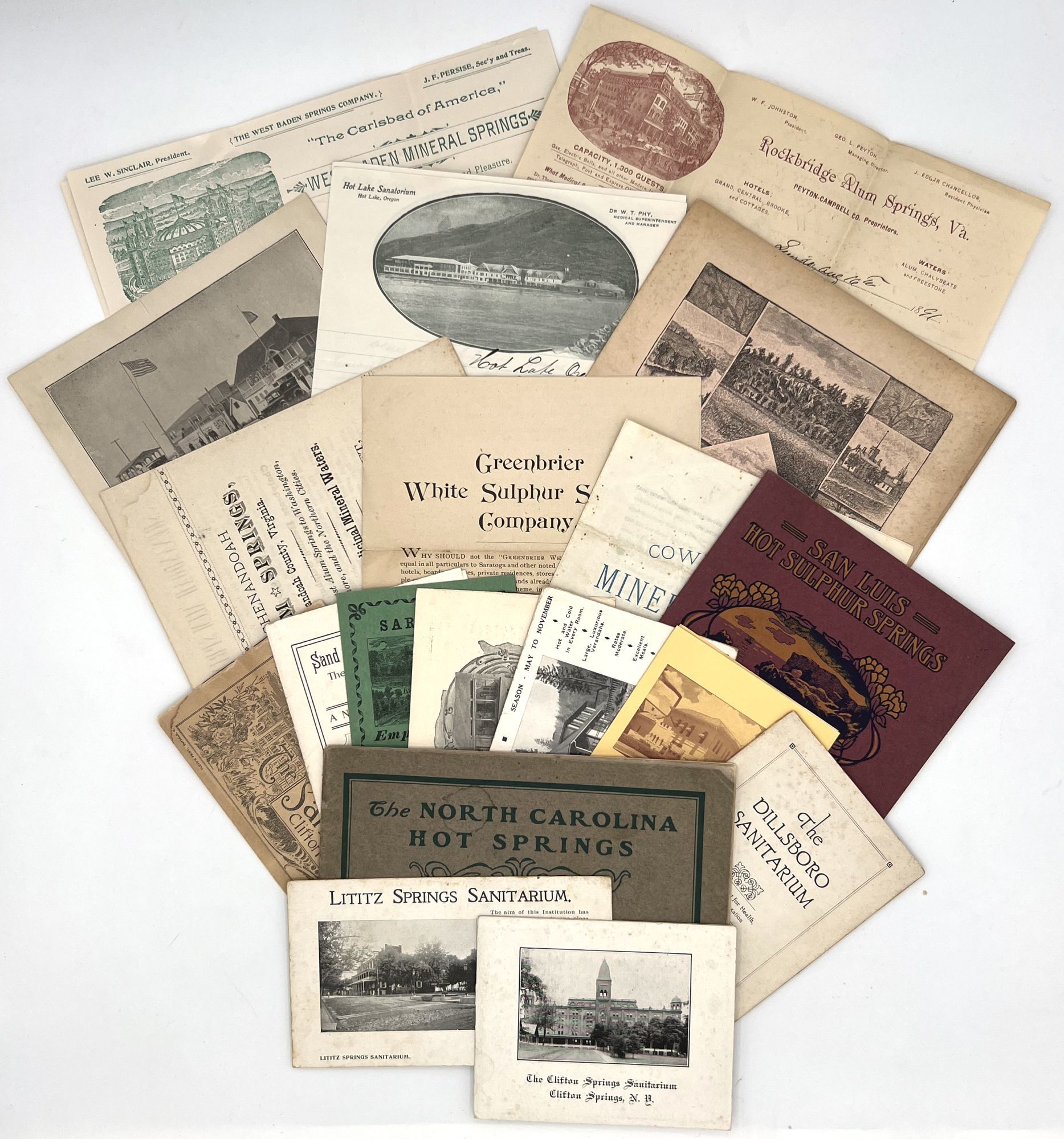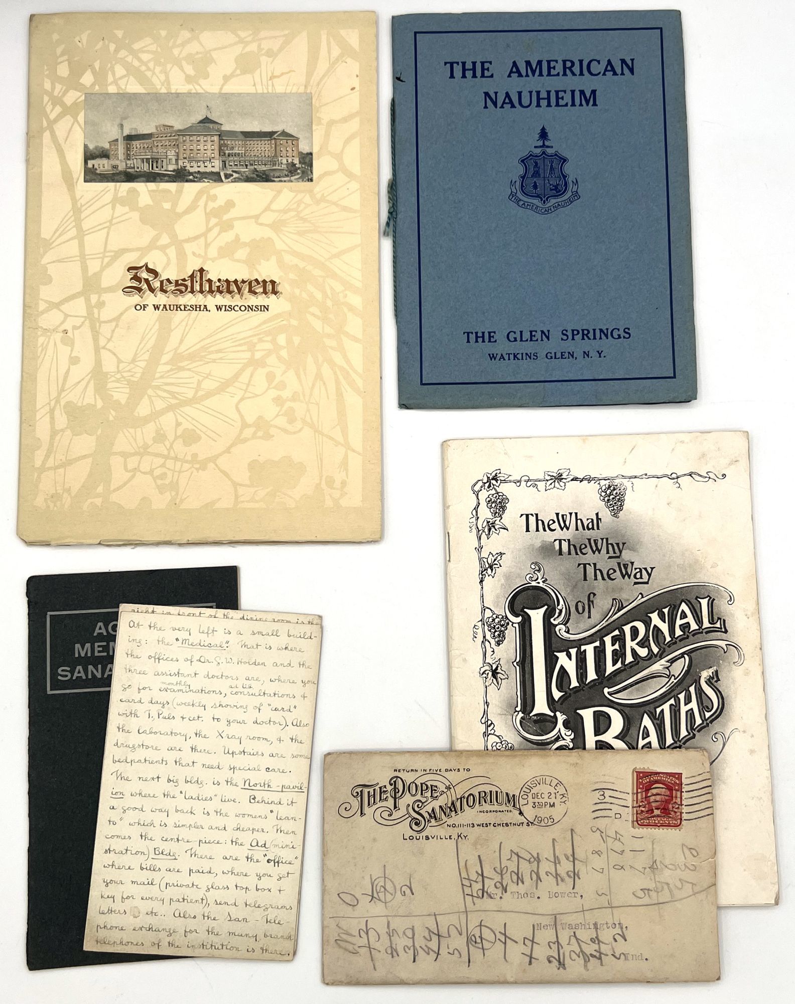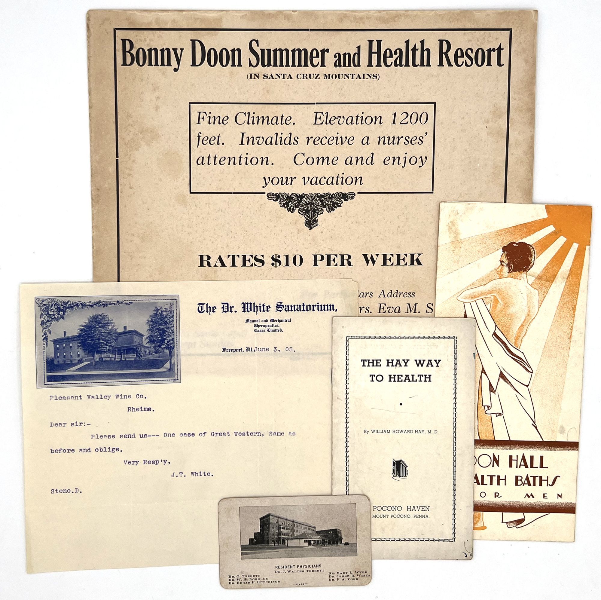 1936. Very good overall. A collection of materials from 46 different facilities claiming to improve health. Dating from 1857 through 1936. Includes facilities in 20 different states across the country. The materials have been grouped as follows: