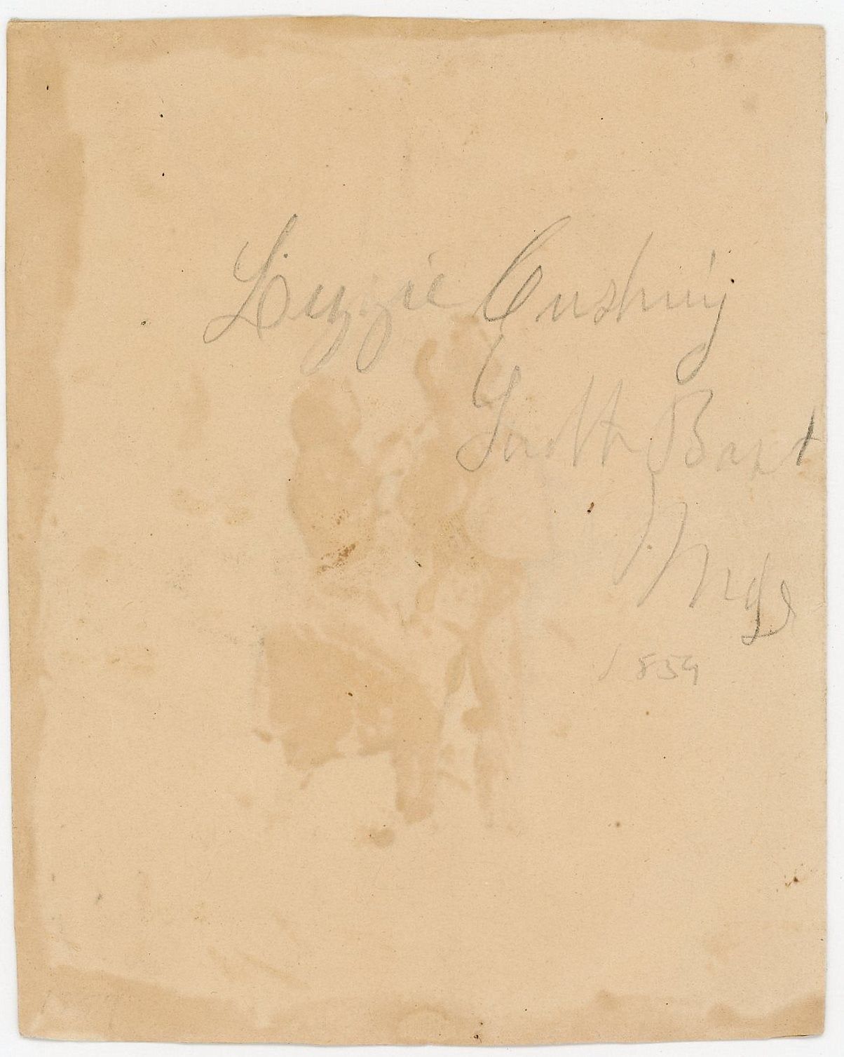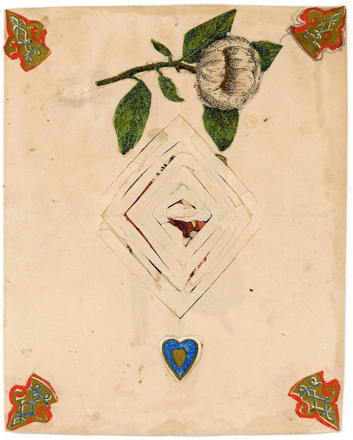 Some separations on cobweb. Age wear.. A 4.75" by 3.75" handmade paper valentine, presumably created by a child. Applied scrap cutouts to the boards and beneath the cut paper cobweb or beehive valentine. Image beneath depicts boy and girl embracing. Lizzie Cushing South Bend Ind. 1859 penciled on verso. Two pieces of paper have been glued together to create this card. A great starter project for a budding paper engineer.