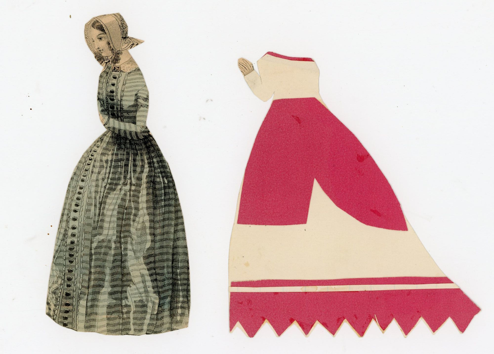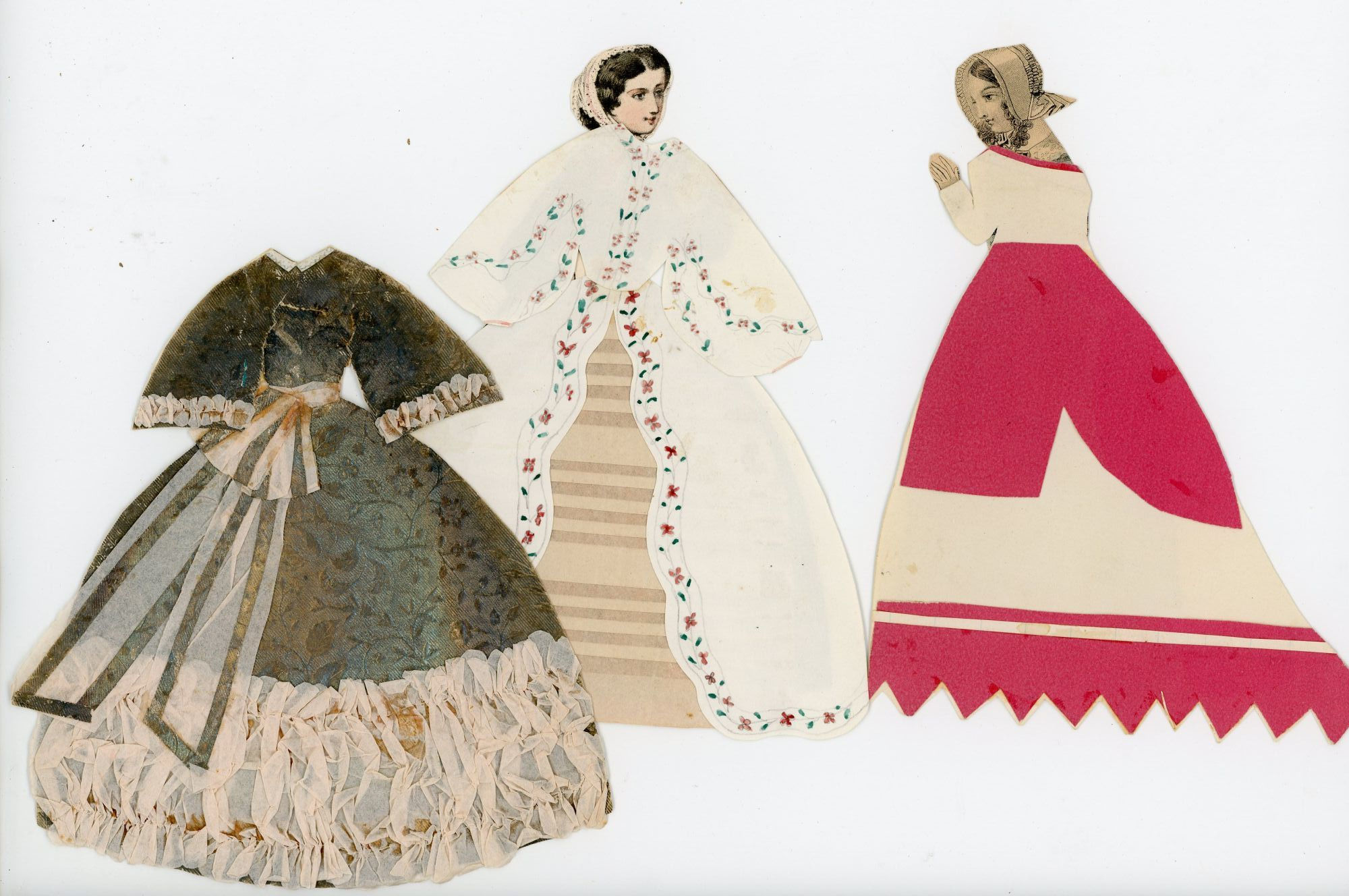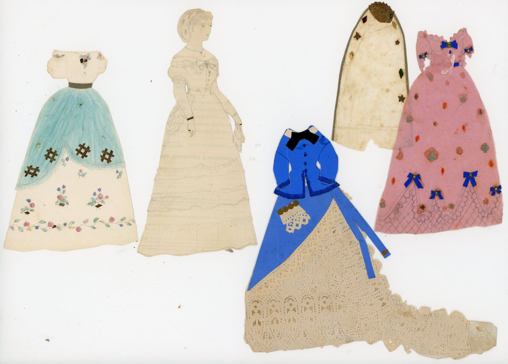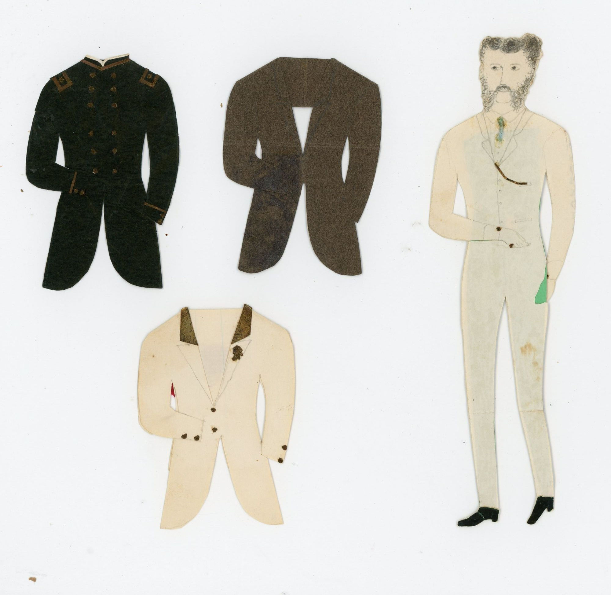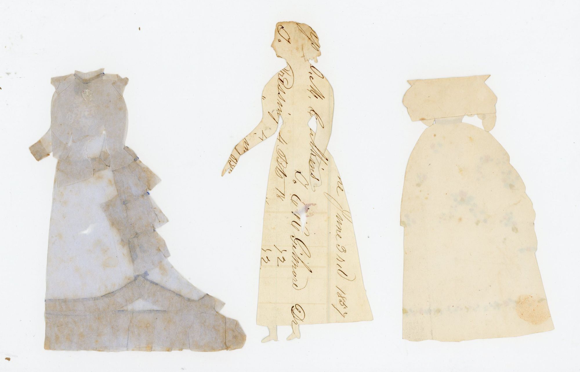 1857. Minimal wear.. A collection including five (5) pencil drawn paper dolls and two (2) cutouts from Godey's or Peterson's. The four (4) of the female dolls have complimentary gowns hand decorated with watercolor floral trim. Each also has at least one additional costume from plain and pleated tissue paper with adornments. There are two (2) male dolls; one with an applied paper suit, the other with three (3) hand decorated suit coats. The handmade dolls are created on recycled ledger paper - the manuscript date on the reverse of one doll reads 1857. Most of the handmade dolls have fine detail on the doll itself as well as the costumes. Additionally the arms are cutaway from the sides of the dolls to allow proper placement of costumes. Of particular note is the magazine cut-out with the no arms quite naive handmade paper dress with with the dolls hand applied at the end of the costume sleeve. Probably one of the child's earliest works, but with an attention to detail even early in the process. Fine depiction of fashion of the time. Charming costumes.