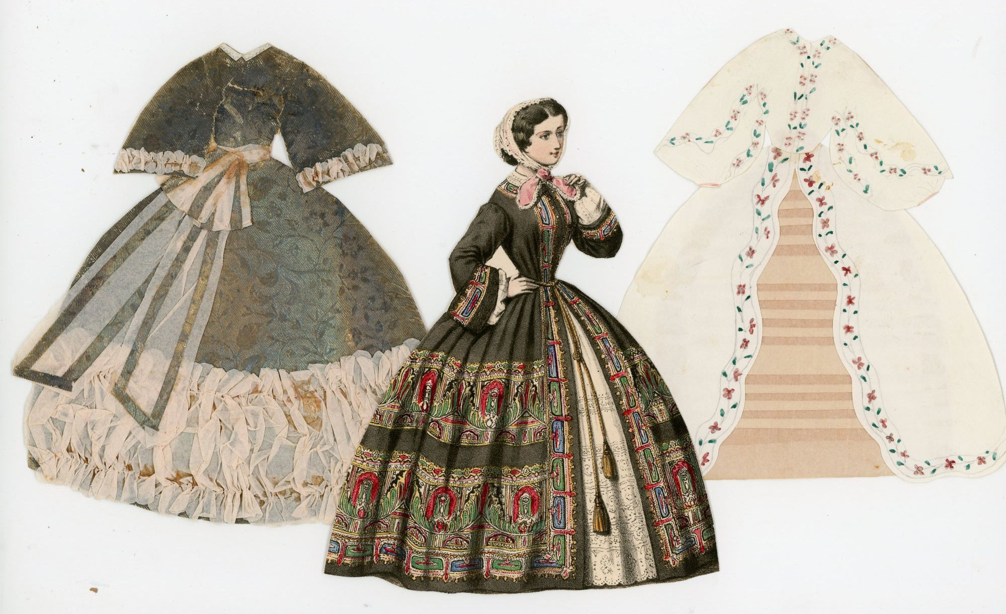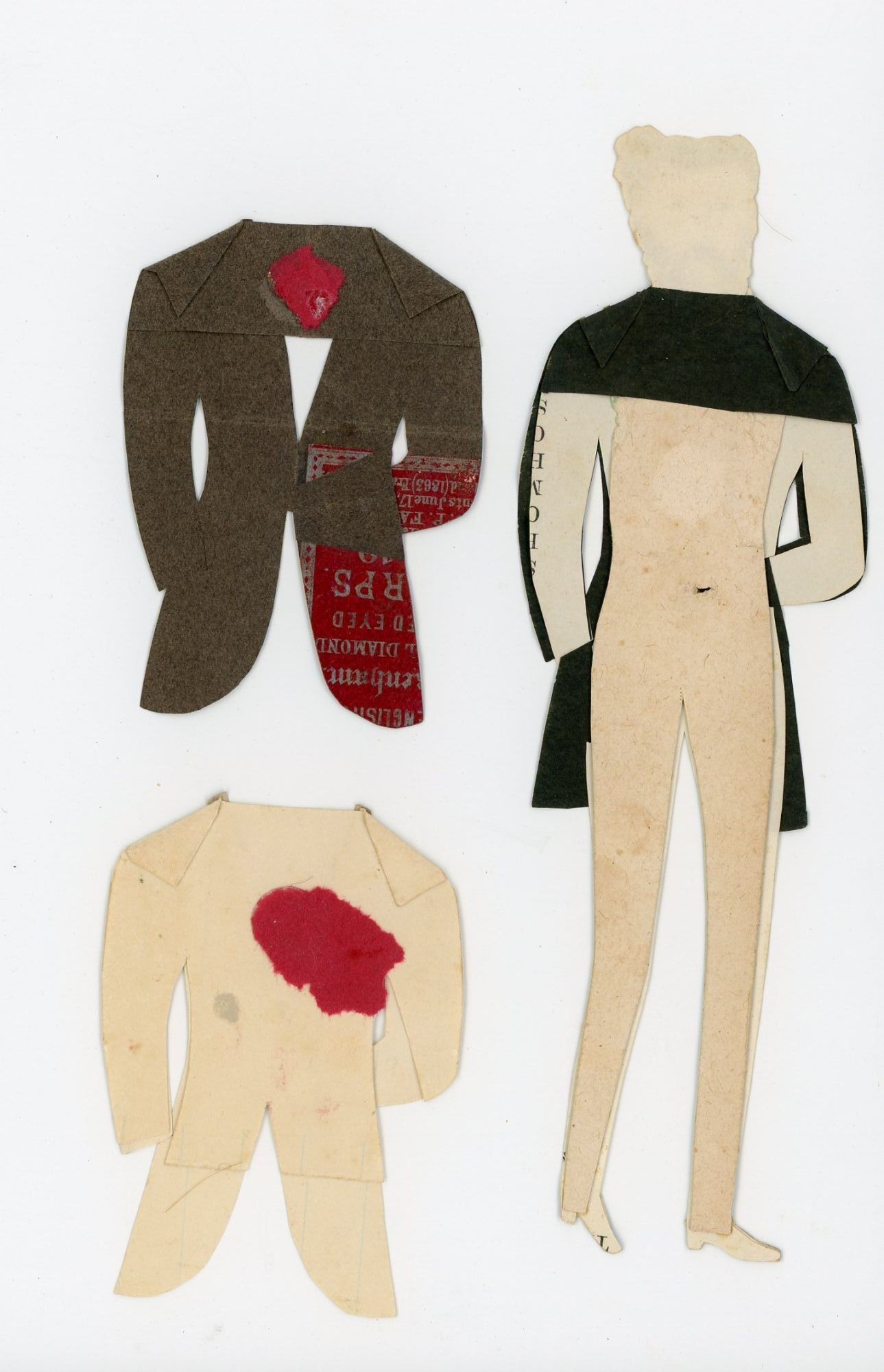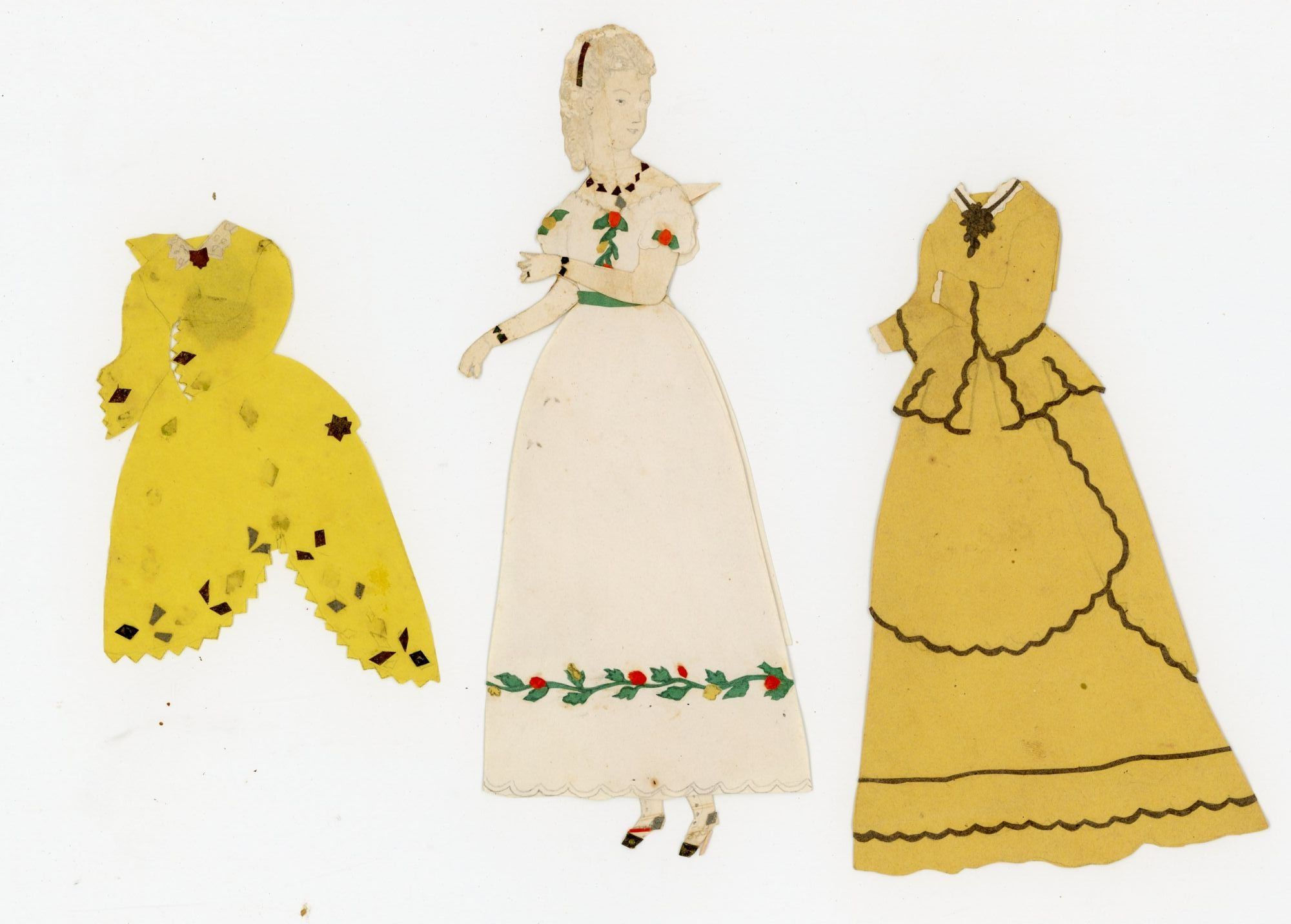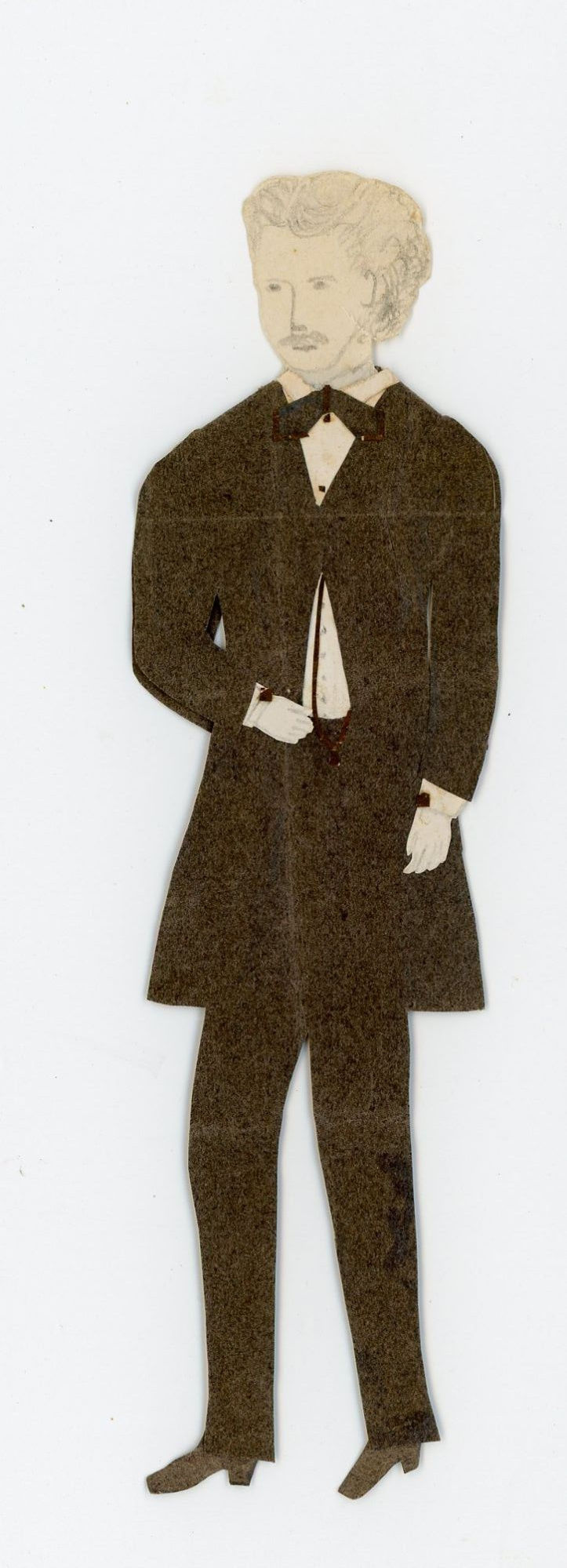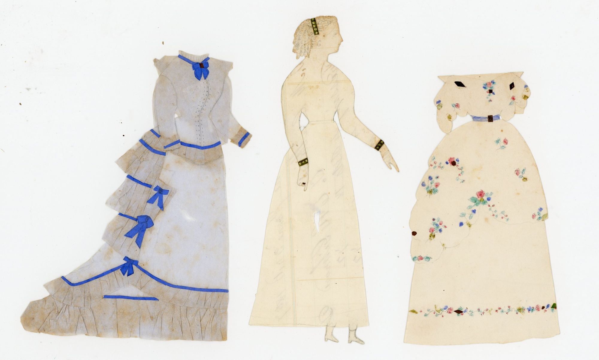 1857. Minimal wear.. A collection including five (5) pencil drawn paper dolls and two (2) cutouts from Godey's or Peterson's. The four (4) of the female dolls have complimentary gowns hand decorated with watercolor floral trim. Each also has at least one additional costume from plain and pleated tissue paper with adornments. There are two (2) male dolls; one with an applied paper suit, the other with three (3) hand decorated suit coats. The handmade dolls are created on recycled ledger paper - the manuscript date on the reverse of one doll reads 1857. Most of the handmade dolls have fine detail on the doll itself as well as the costumes. Additionally the arms are cutaway from the sides of the dolls to allow proper placement of costumes. Of particular note is the magazine cut-out with the no arms quite naive handmade paper dress with with the dolls hand applied at the end of the costume sleeve. Probably one of the child's earliest works, but with an attention to detail even early in the process. Fine depiction of fashion of the time. Charming costumes.