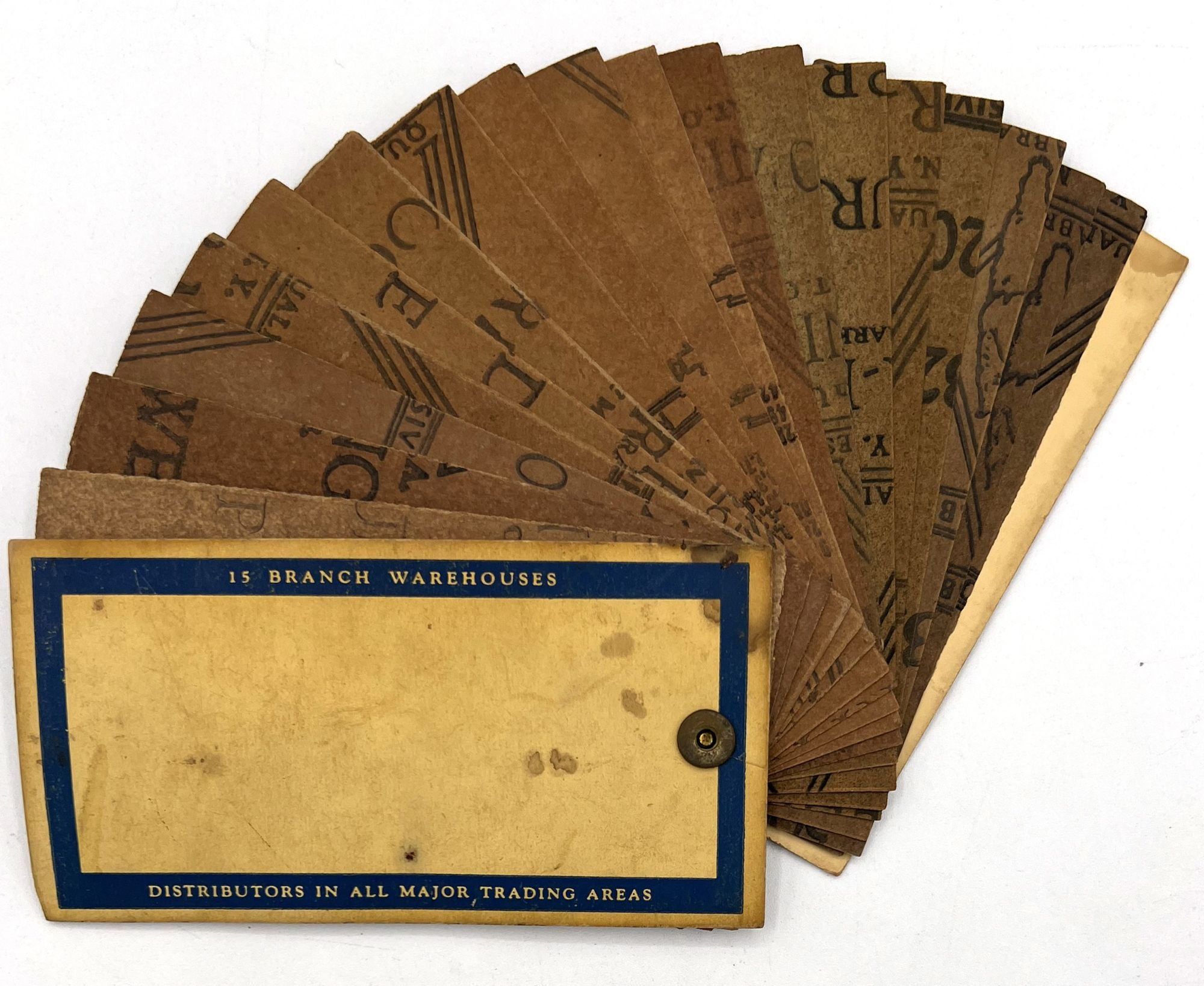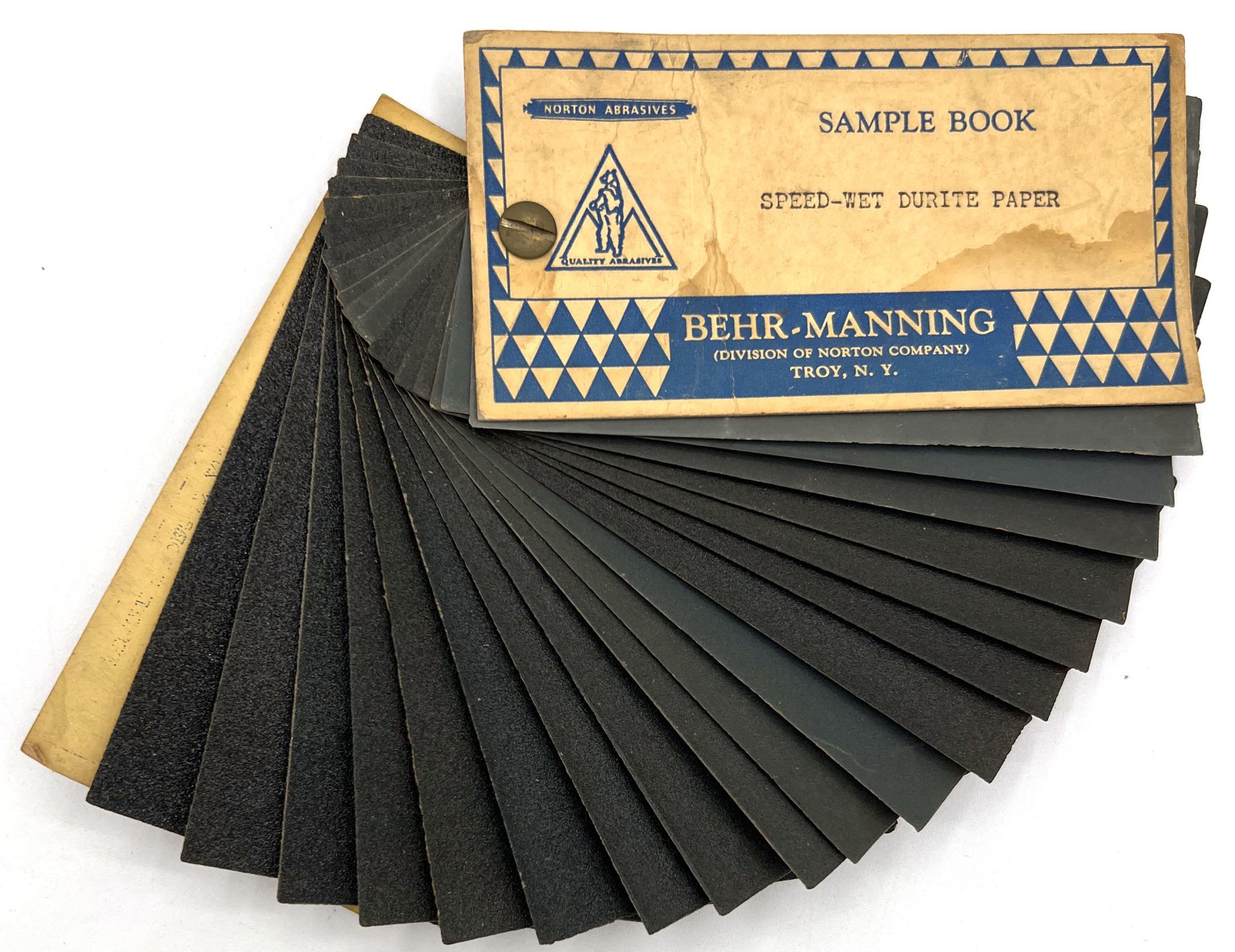 Troy, New York: Behr-Manning, 1935. A sandpaper sample book produced by the Behr-Manning company, makers of "quality abrasives" and sharpening stones. This sample book contains approx. eighteen (18) sandpapers organized by grit, ranging from extremely fine coarse for use in a variety of projects. This set ranges from to 80 to 600 grit, each labeled on the verso, and is marked as part of their "Speed-Wet Durite Paper" series. Secured in left-hand margin with strong metal grommet, with original paper card wrappers printed in blue. Measures approx. 2.75" by 5.25