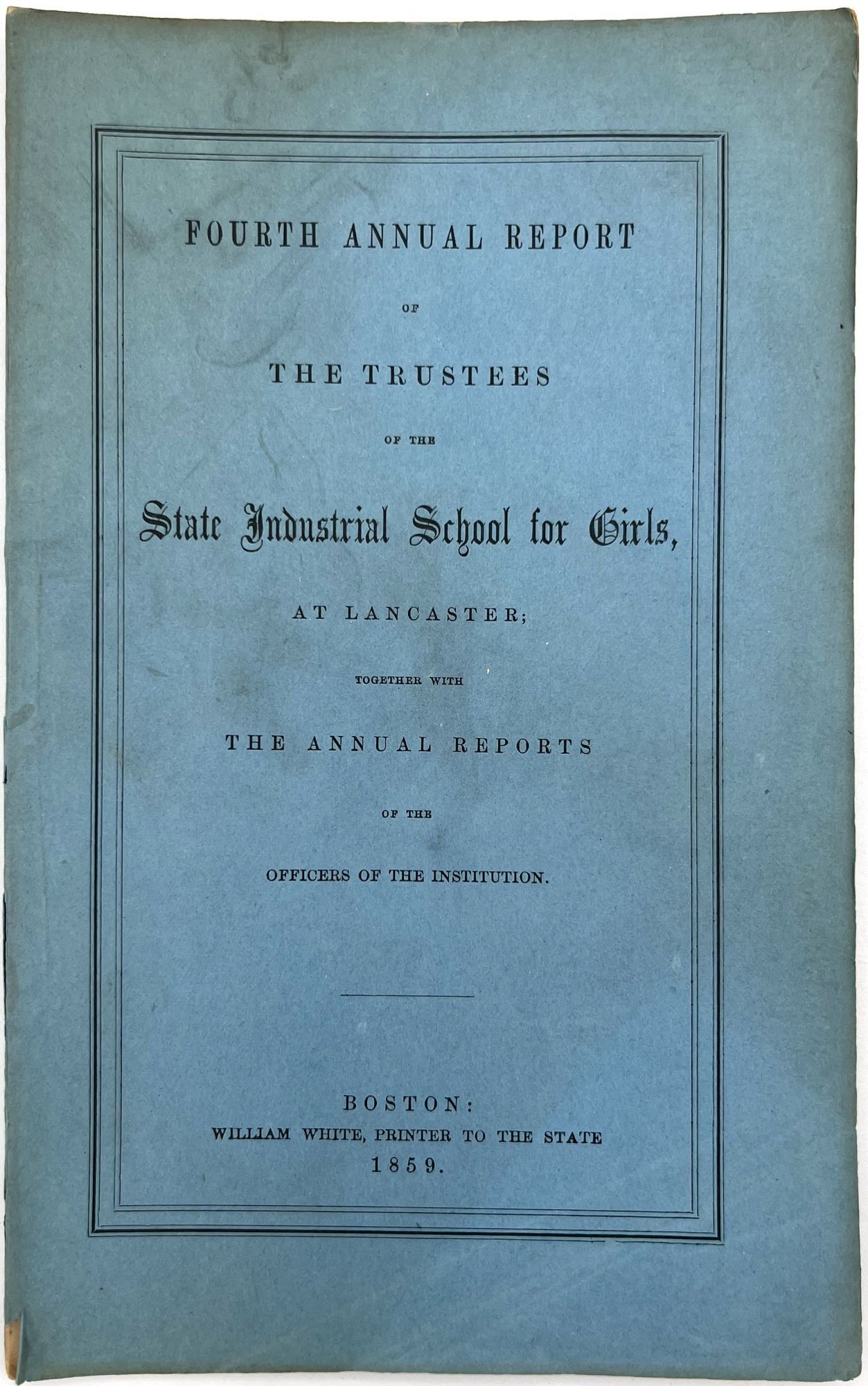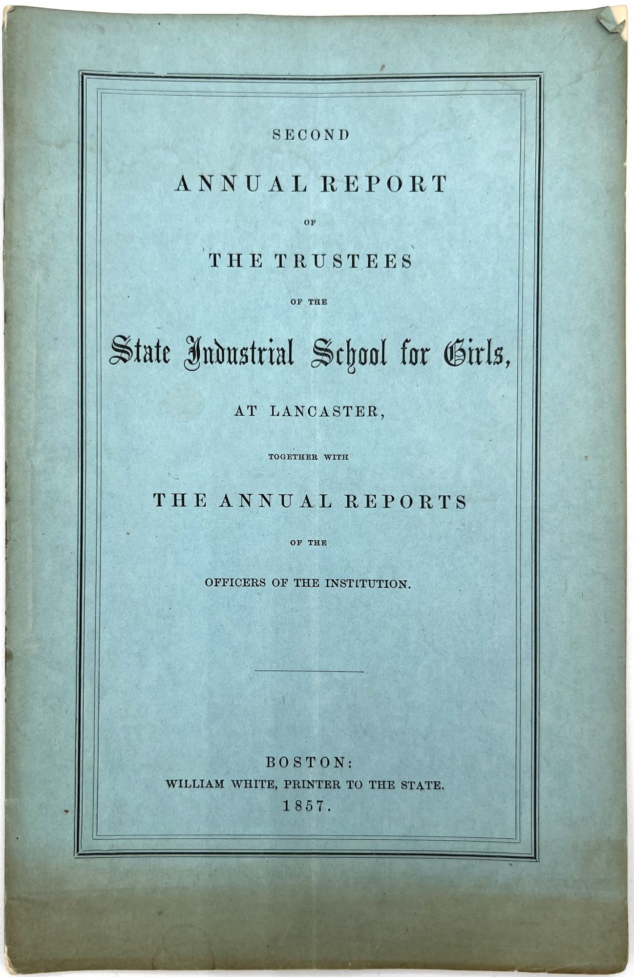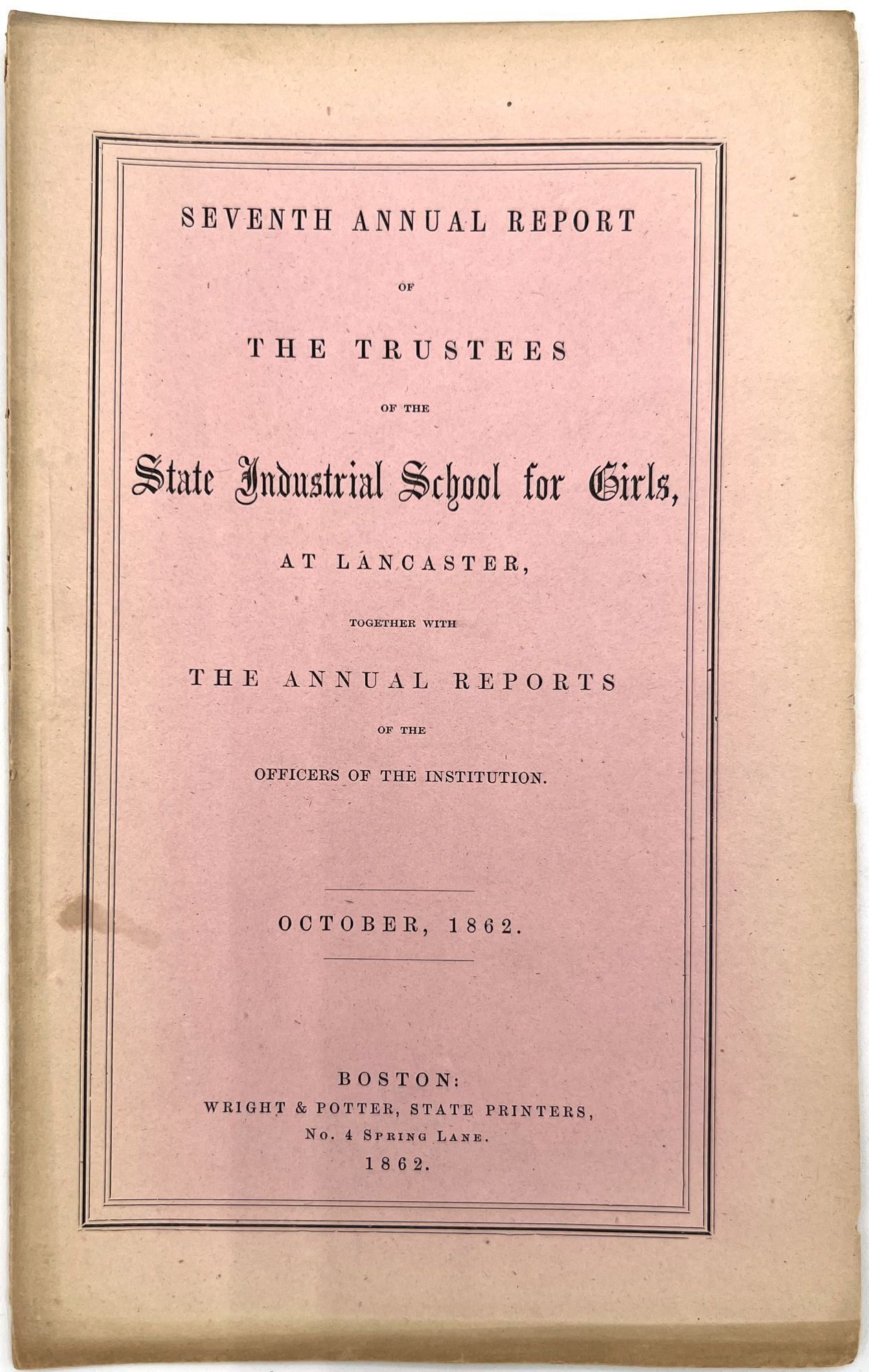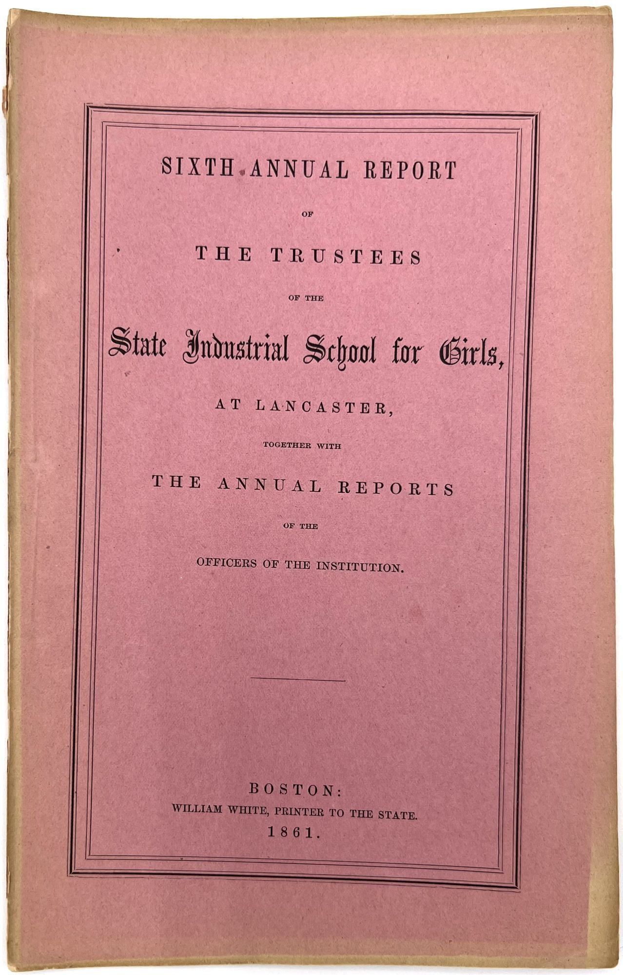 Boston, Massachusetts: William White, Printer to the State, 1879. Very good. Minor flaws include toning, sunning, chipping, dust soiling, offsetting, minor short tears. Final report possibly lacking wrappers.. A large run of twenty-two (22) Annual Reports of the Trustees of the State Industrial School for Girls at Lancaster, ranging in date from 1857 to 1879. Includes nos. 1-4, 6-14, 16-23, and 26. The Lancaster Industrial School for Girls was the first school for delinquent girls in Massachusetts dedicated to reform and rehabilitation rather than incarceration and punishment. The first annual report provides a good example of the kinds of content in all of the reports; it includes the following: a general overview of the school's aims, as well as information on expenses and inventory; age and demographics; discipline and behavior management; descriptions of other similar reform institutions with similar aims; and a "Farmer's Report" reporting on the state of the school's farm. Among the demographic groups mentioned are: Irish, Scotch, Italian, French, white, and "colored" children; includes stats on which students are literate, lack parents, and attended Sabbath School. A valuable resource for researching reform schools for and juvenile crime among girls in Massachusetts in the second half of the 19th century. Each report is a single vol. measuring approx. 9.25" by 5.75", with approx. 28 pp. At least one has a frontispiece (most do not). Ink inscriptions of previous owners on a couple of the reports: "Elizabeth C. Putnam", "Town of Sutton", and "Rev. A. Hill, D.D.