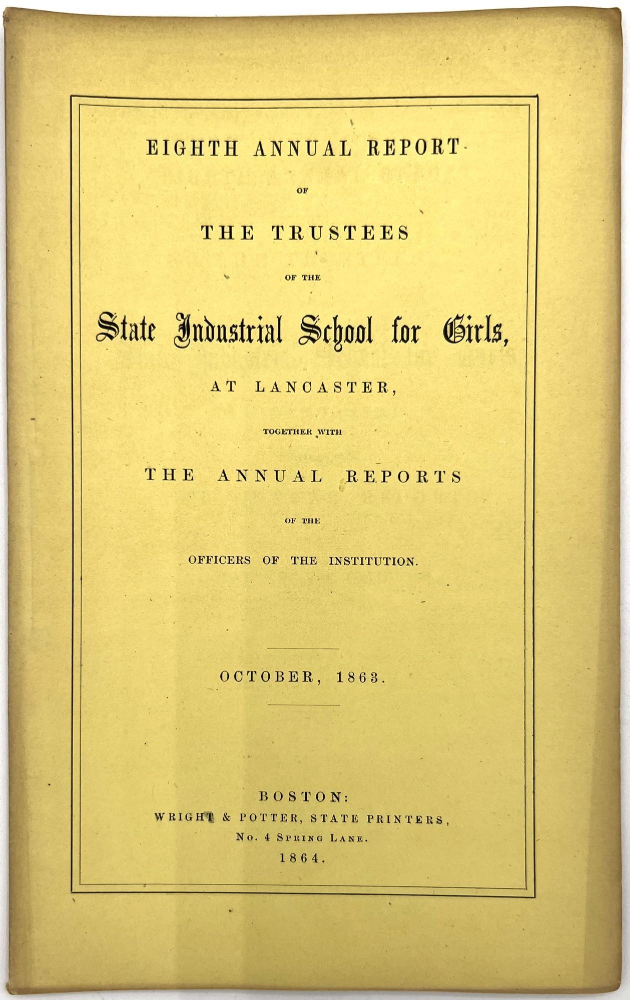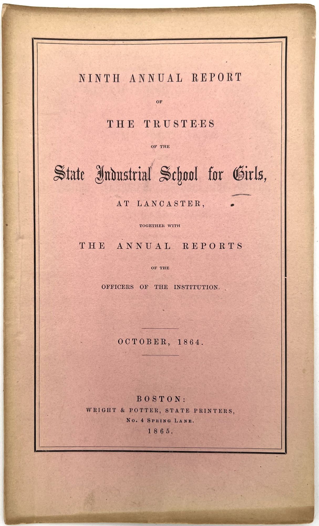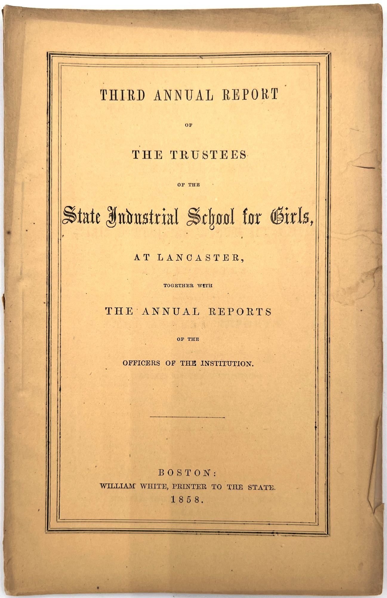 Boston, Massachusetts: William White, Printer to the State, 1879. Very good. Minor flaws include toning, sunning, chipping, dust soiling, offsetting, minor short tears. Final report possibly lacking wrappers.. A large run of twenty-two (22) Annual Reports of the Trustees of the State Industrial School for Girls at Lancaster, ranging in date from 1857 to 1879. Includes nos. 1-4, 6-14, 16-23, and 26. The Lancaster Industrial School for Girls was the first school for delinquent girls in Massachusetts dedicated to reform and rehabilitation rather than incarceration and punishment. The first annual report provides a good example of the kinds of content in all of the reports; it includes the following: a general overview of the school's aims, as well as information on expenses and inventory; age and demographics; discipline and behavior management; descriptions of other similar reform institutions with similar aims; and a "Farmer's Report" reporting on the state of the school's farm. Among the demographic groups mentioned are: Irish, Scotch, Italian, French, white, and "colored" children; includes stats on which students are literate, lack parents, and attended Sabbath School. A valuable resource for researching reform schools for and juvenile crime among girls in Massachusetts in the second half of the 19th century. Each report is a single vol. measuring approx. 9.25" by 5.75", with approx. 28 pp. At least one has a frontispiece (most do not). Ink inscriptions of previous owners on a couple of the reports: "Elizabeth C. Putnam", "Town of Sutton", and "Rev. A. Hill, D.D.
