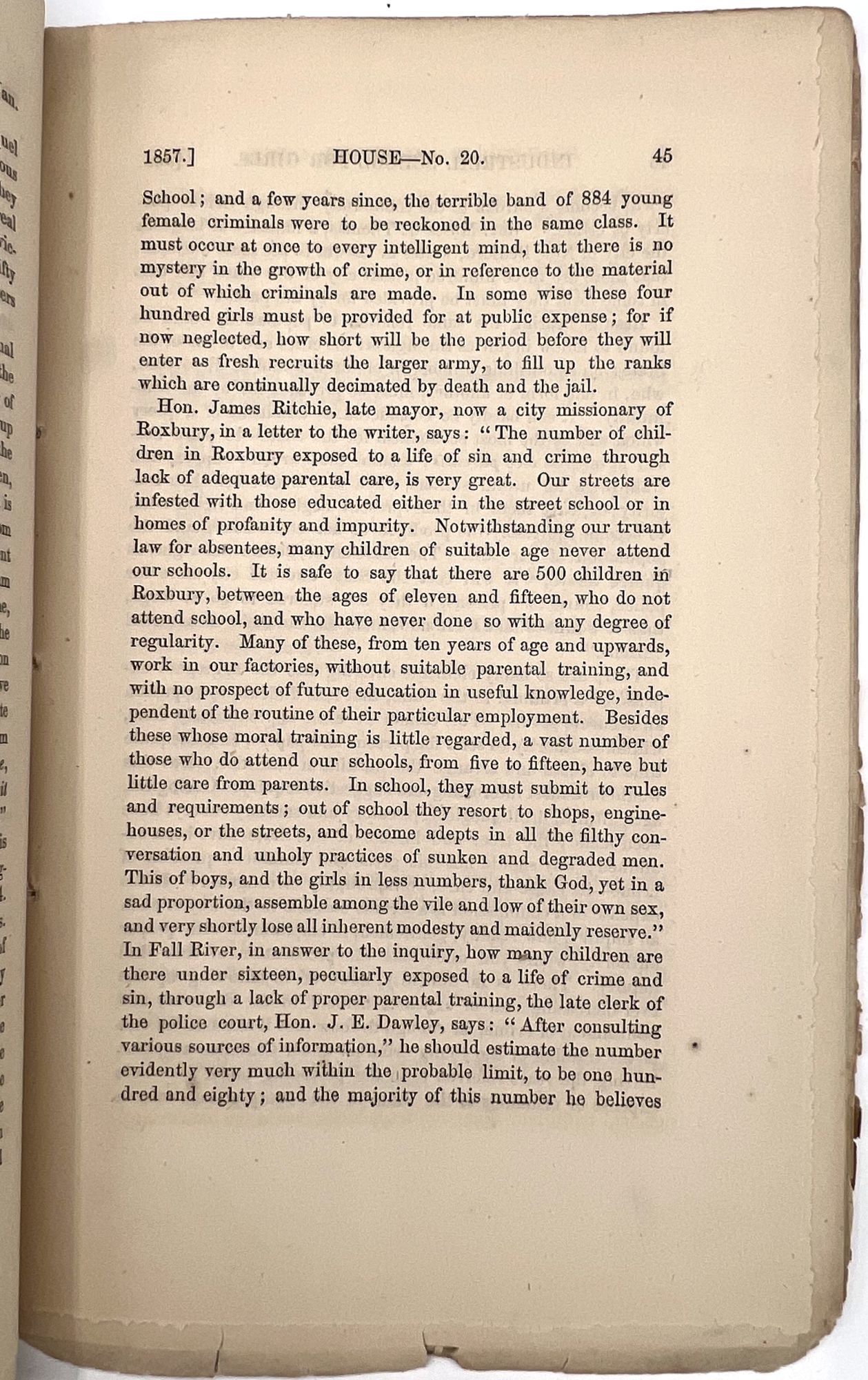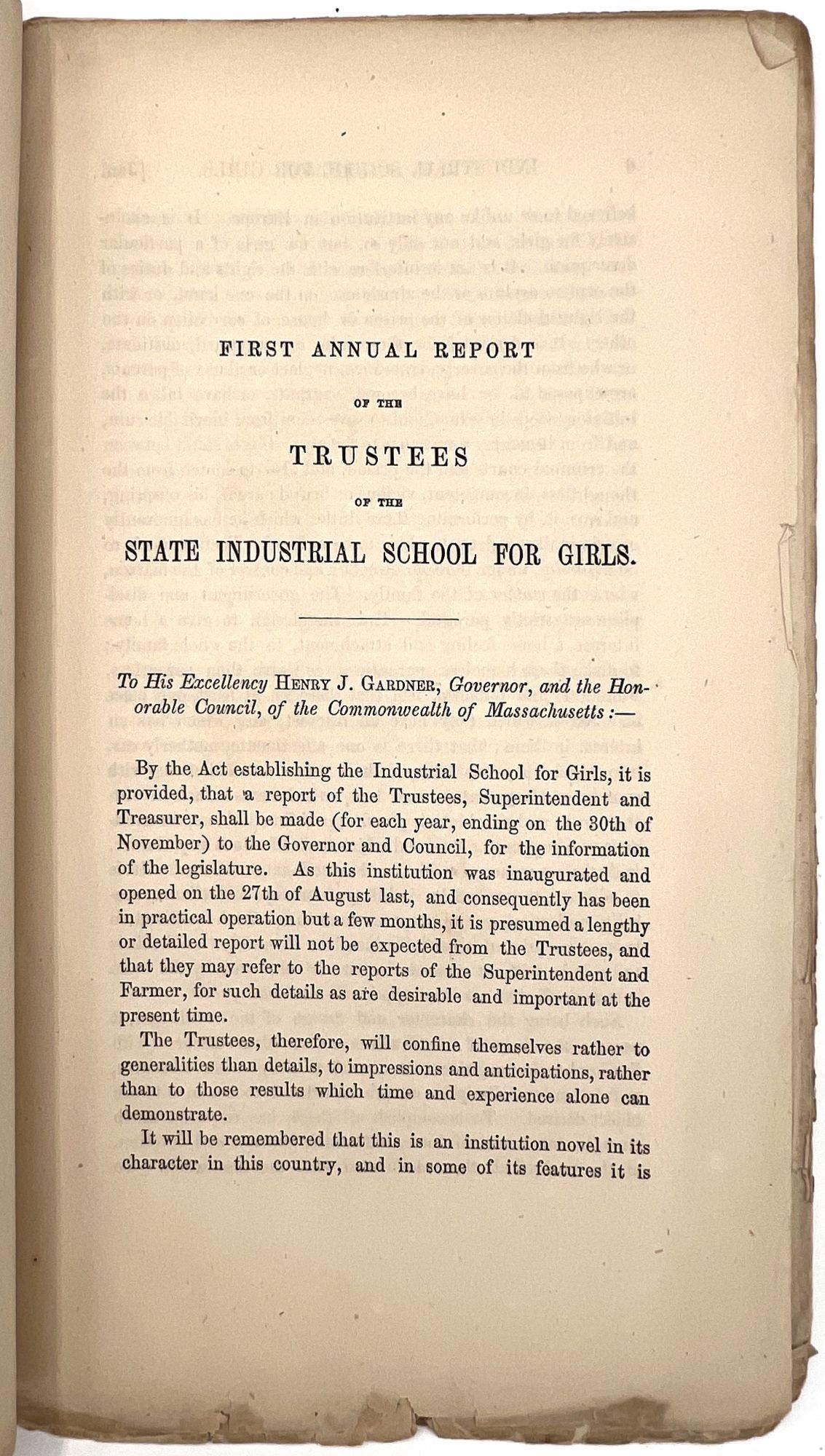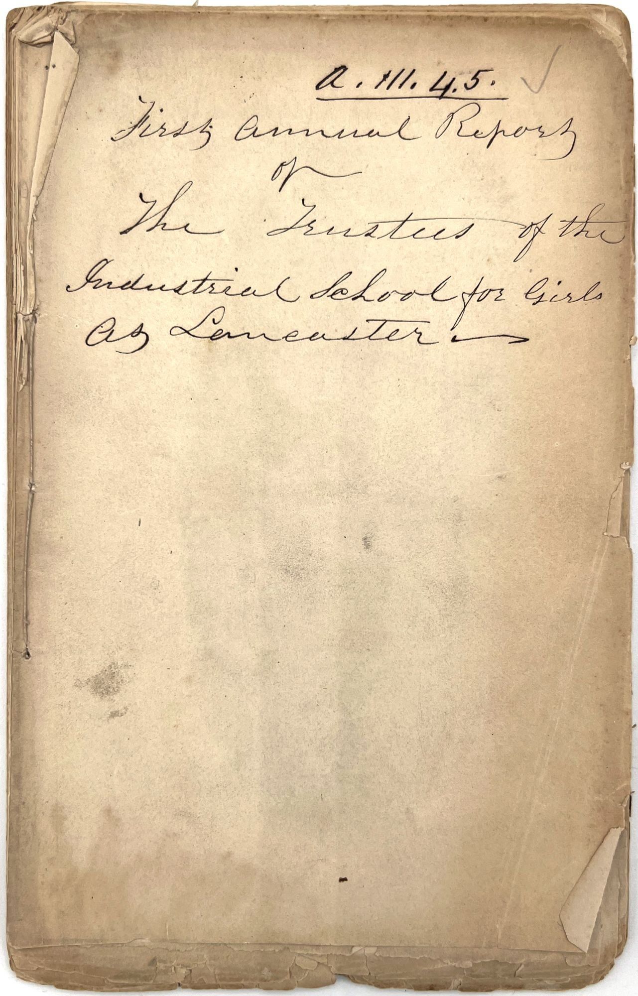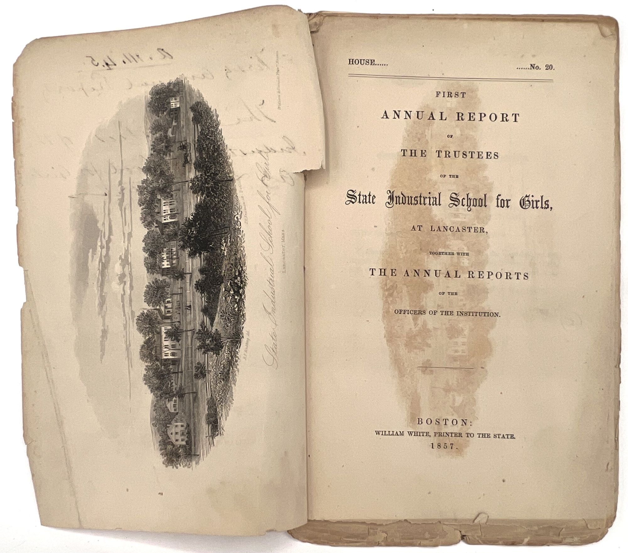 Boston, Massachusetts: William White, Printer to the State, 1879. Very good. Minor flaws include toning, sunning, chipping, dust soiling, offsetting, minor short tears. Final report possibly lacking wrappers.. A large run of twenty-two (22) Annual Reports of the Trustees of the State Industrial School for Girls at Lancaster, ranging in date from 1857 to 1879. Includes nos. 1-4, 6-14, 16-23, and 26. The Lancaster Industrial School for Girls was the first school for delinquent girls in Massachusetts dedicated to reform and rehabilitation rather than incarceration and punishment. The first annual report provides a good example of the kinds of content in all of the reports; it includes the following: a general overview of the school's aims, as well as information on expenses and inventory; age and demographics; discipline and behavior management; descriptions of other similar reform institutions with similar aims; and a "Farmer's Report" reporting on the state of the school's farm. Among the demographic groups mentioned are: Irish, Scotch, Italian, French, white, and "colored" children; includes stats on which students are literate, lack parents, and attended Sabbath School. A valuable resource for researching reform schools for and juvenile crime among girls in Massachusetts in the second half of the 19th century. Each report is a single vol. measuring approx. 9.25" by 5.75", with approx. 28 pp. At least one has a frontispiece (most do not). Ink inscriptions of previous owners on a couple of the reports: "Elizabeth C. Putnam", "Town of Sutton", and "Rev. A. Hill, D.D.