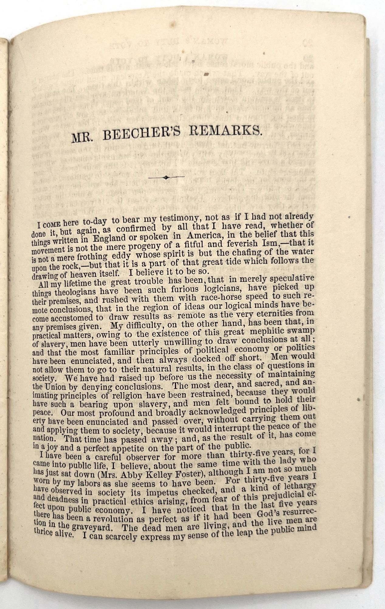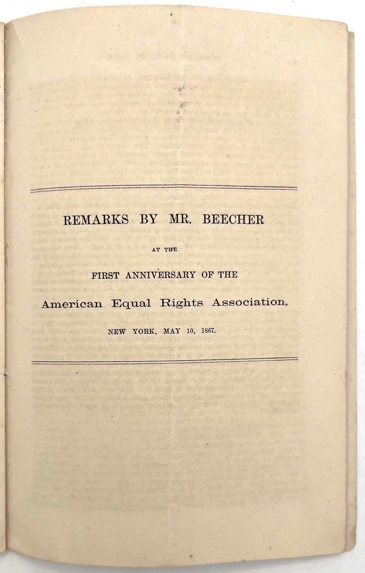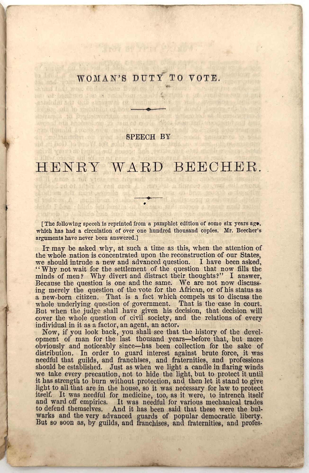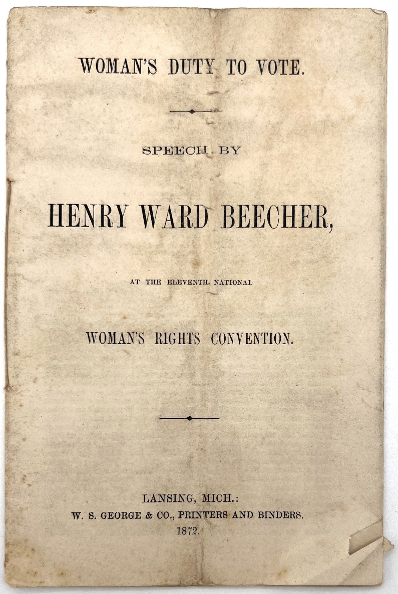 Lansing, Michigan: W.S. George & Co., Printers and Binders, 1872. Good. Toned with dust soiling, creasing, short tears.. Second edition of a speech given by Henry Ward Beecher on the importance of women's suffrage at the eleventh national Woman's Rights Convention. Beecher (1813-1887) was an Americna clergyman and outspoken abolitionist who became a women's suffrage advocate in the 1867 during his ultimately unsuccessful bid to become delegate to the New York Constitutional Convention of 1867 to 1868 on a suffrage platform. He was subsequently elected the first president of the American Woman Suffrage Association (AWSA). Single vol. (7.25" by 4.75"), pp. 22, [2], sewn in original printed self wrps. 1 copy of this edition on WorldCat (Aug. 2024). 90+ copies of earlier (first) 1867 edition on WorldCat (Aug. 2024).