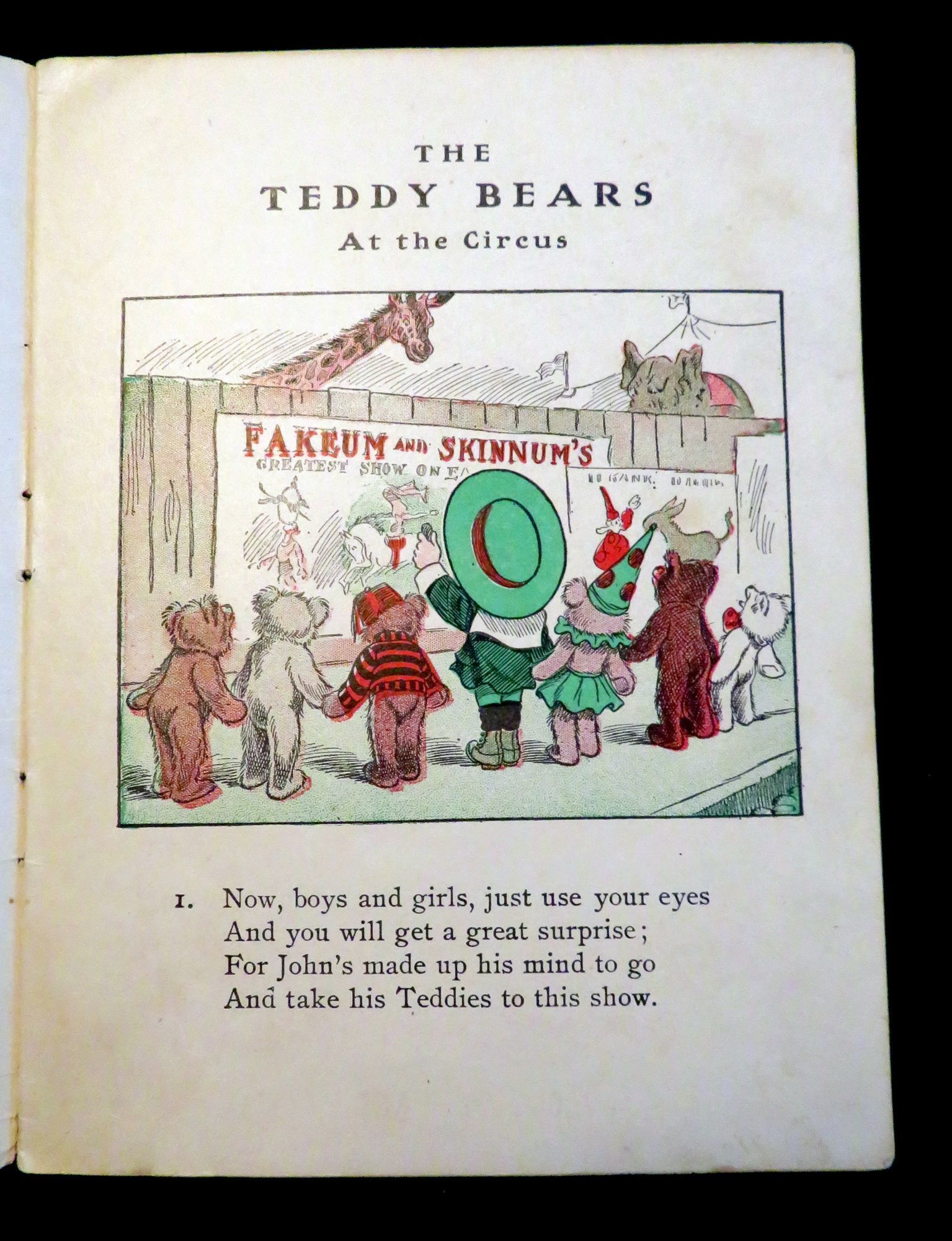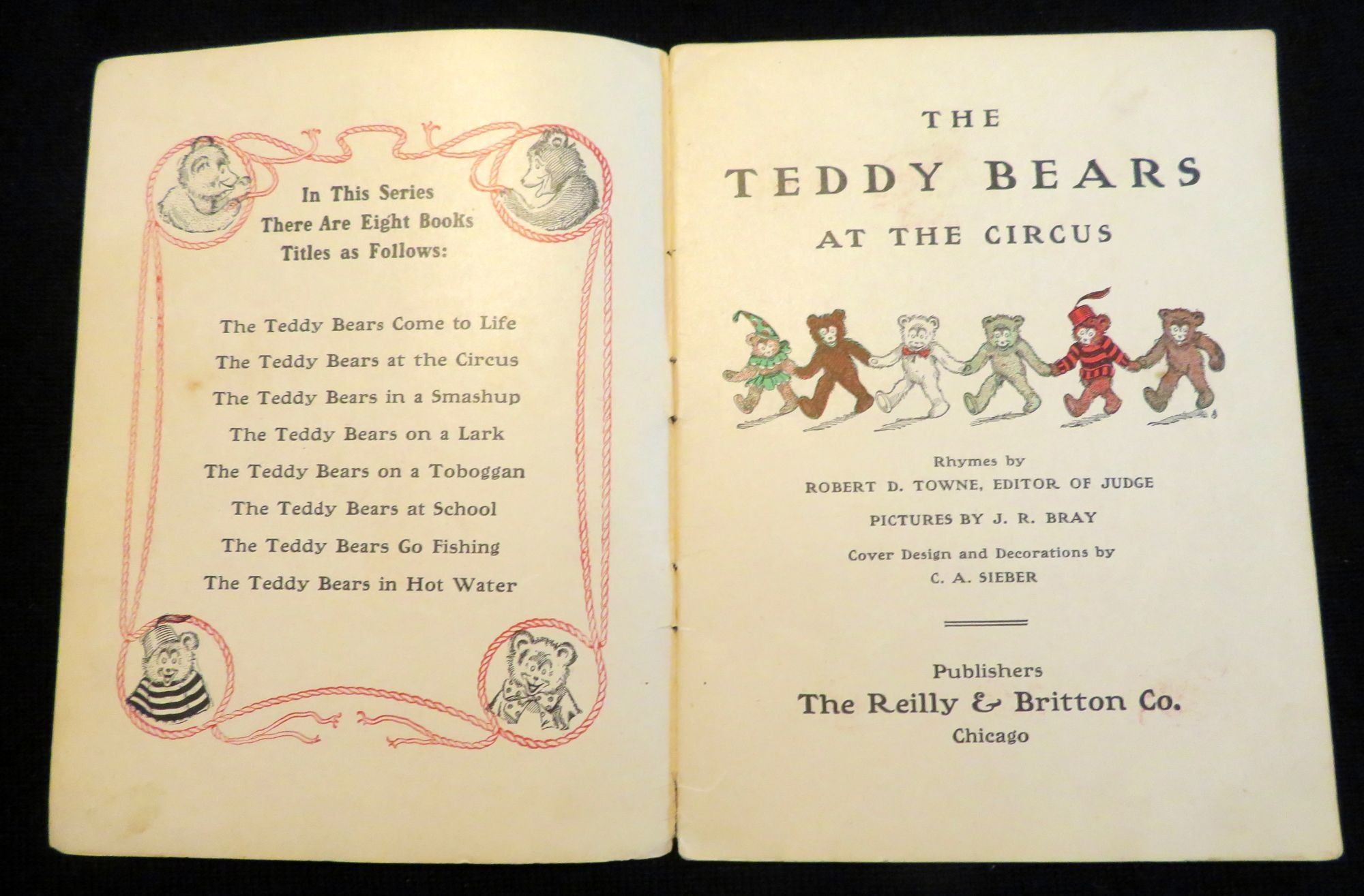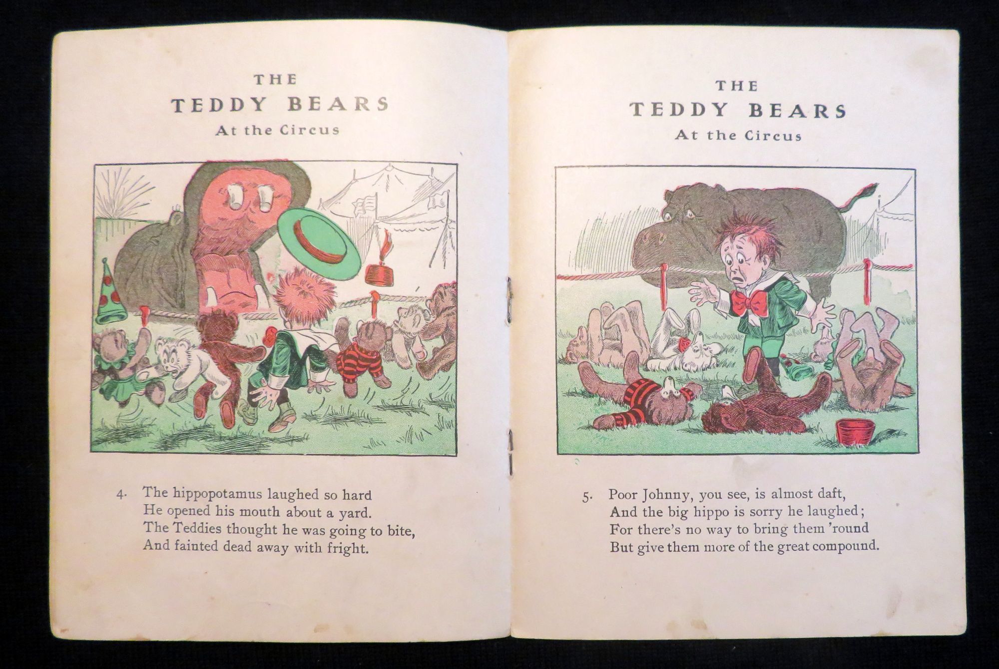 Chicago, IL: Reilly & Britton Co, 1907. General wear. Minor stain along right edge of front cover.. The Teddy Bear Books is series consisting of eight (8) books that tell the adventures a young boy named John and his group of six anthropomorphic teddy bears. The Teddy Bear at the Circus appears to be the second book in the series, which is sometimes called The Teddy Bears on Parade. The book is told in a series of rhyming couplets, with a stanza on each page and a corresponding whimsical color illustration. The book was published by the permission of the Judge Company. Additionally, while J. R. Bray is listed as the illustrator, the cover design and decorations were done by C. A. Sieber. 12 pgs. Illustrated covers. Staple binding. Measures 6.7"5 by 5". .