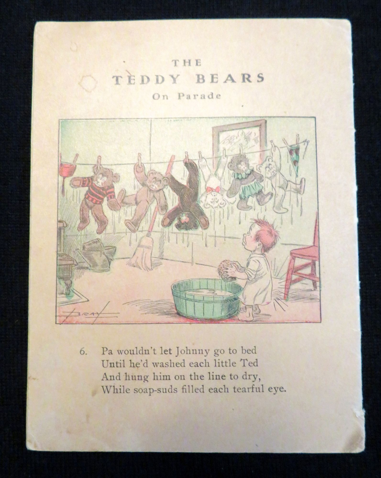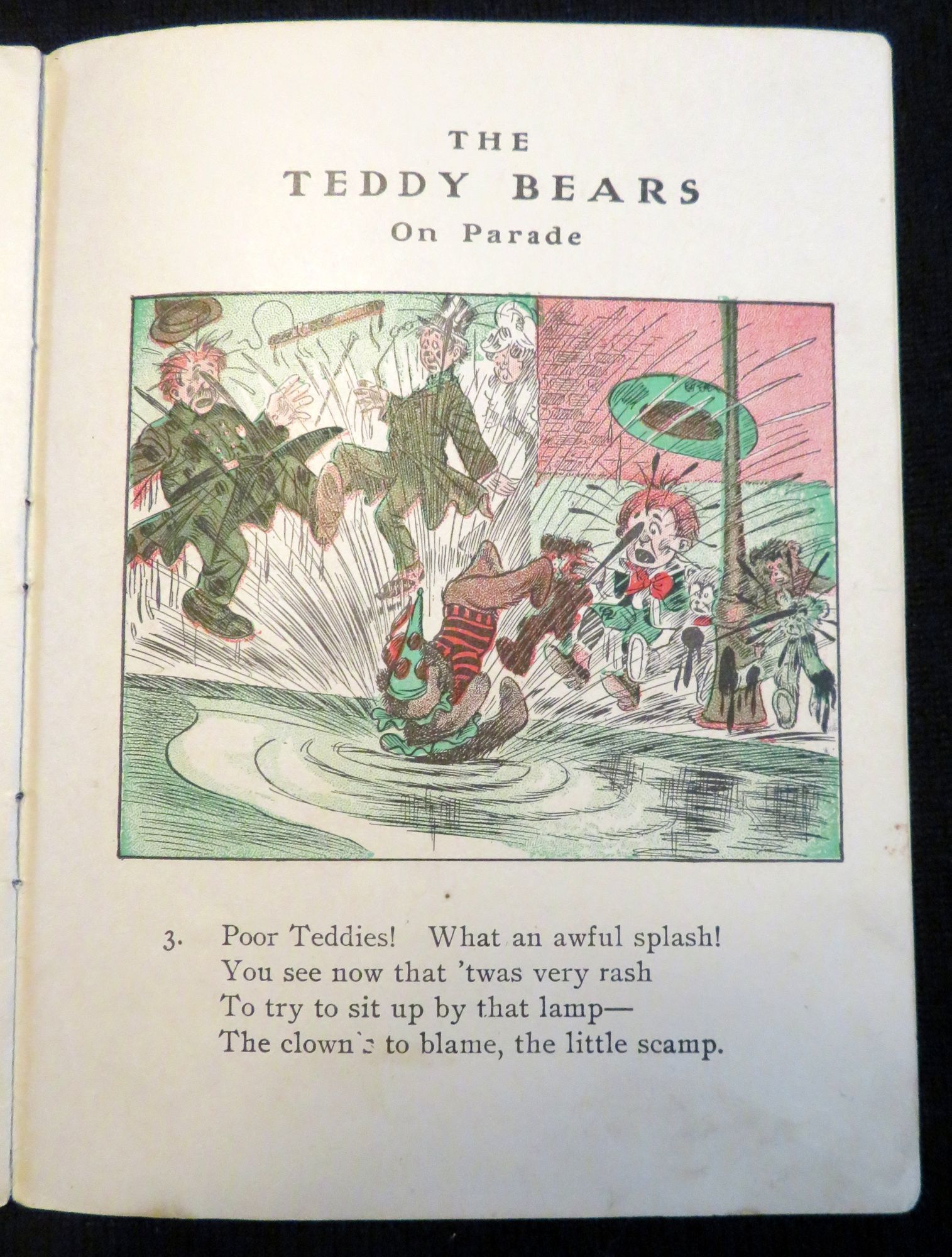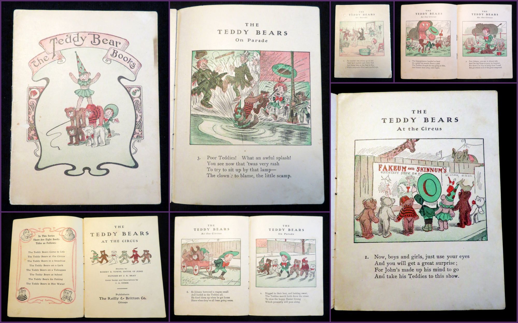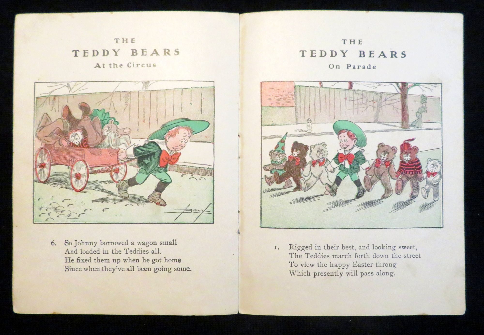 Chicago, IL: Reilly & Britton Co, 1907. General wear. Minor stain along right edge of front cover.. The Teddy Bear Books is series consisting of eight (8) books that tell the adventures a young boy named John and his group of six anthropomorphic teddy bears. The Teddy Bear at the Circus appears to be the second book in the series, which is sometimes called The Teddy Bears on Parade. The book is told in a series of rhyming couplets, with a stanza on each page and a corresponding whimsical color illustration. The book was published by the permission of the Judge Company. Additionally, while J. R. Bray is listed as the illustrator, the cover design and decorations were done by C. A. Sieber. 12 pgs. Illustrated covers. Staple binding. Measures 6.7"5 by 5". .
