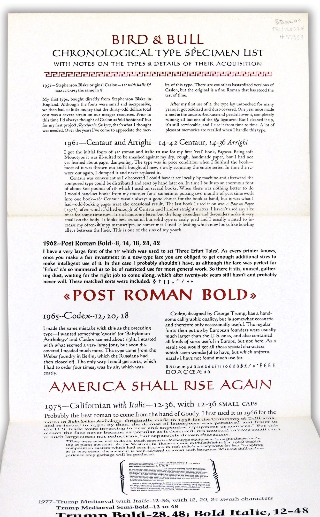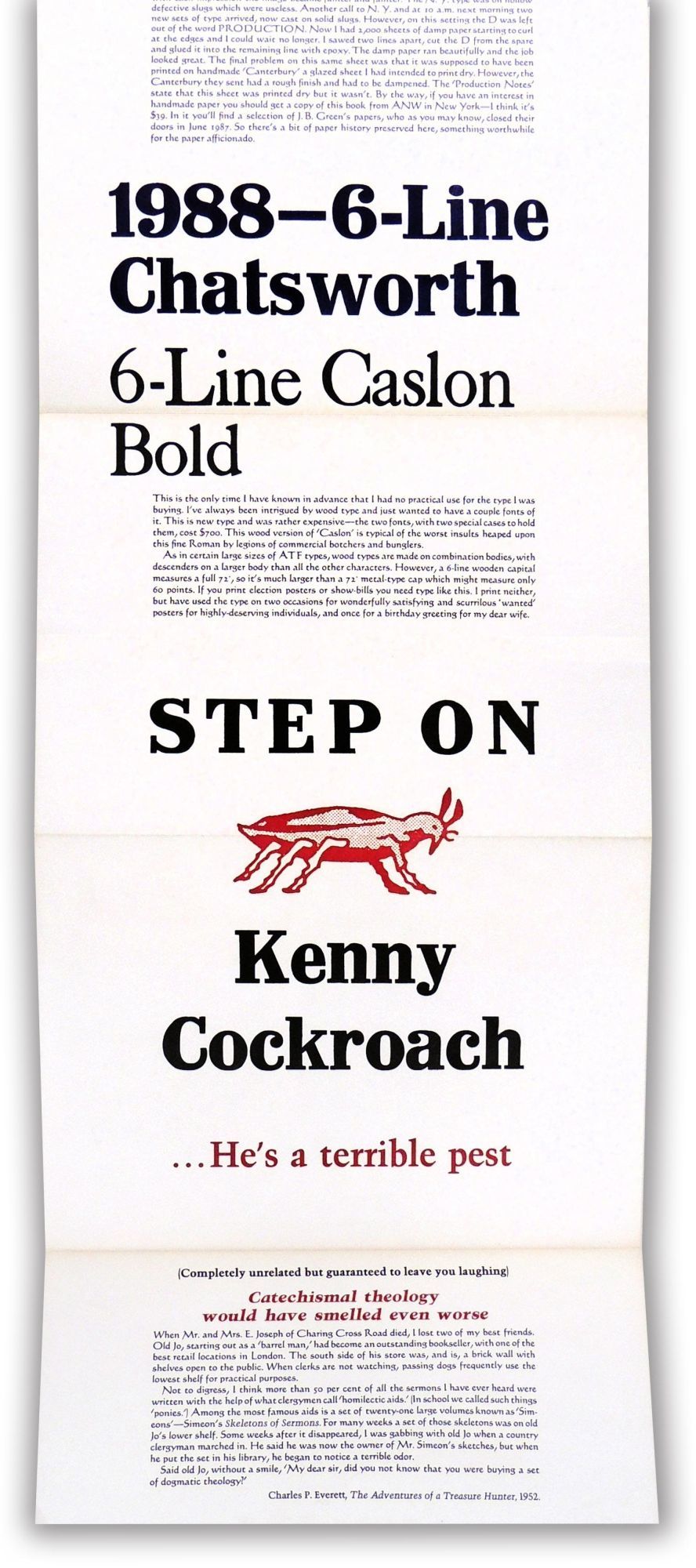 [Newtown, PA]: Bird & Bull Press, 1988. Fine. A rarity from the esteemed Bird & Bull Press. None in commerce, at auction, or in OCLC. This is an engaging and informative item from the press and its proprietor Henry Morris. It is a fold-out sheet of cream paper with Henry Morris describing his acquisition of many of his types, starting with his first type, Stephenson Blake original Caslon, that was acquired in 1958. He continues with types purchased in the 1960s, 1970s, and 1980s. Each description and notes are printed with the type it writes about. The final section is from 1988 using the first wood types, Chatsworth and Caslon Bold, that he had ever bought. He ends first with an image of a cockroach with text saying "Step on Kenny Cockroach...He's a terrible pest." And finally he prints something he describes as completely unrelated but guaranteed to leave you laughing - a quote from Charles P. Everett's The Adventures of a Treasure Hunter, 1952. Morris clearly enjoyed putting this type specimen list together. It is a wonderful example of fine printing and of the humor and dedication of Henry Morris to his press. There is no colophon stating the number of copies printed. When unfolded, this opens to 90 inches. In fine condition with a light crease to the corner of the last page. PRI/120224.