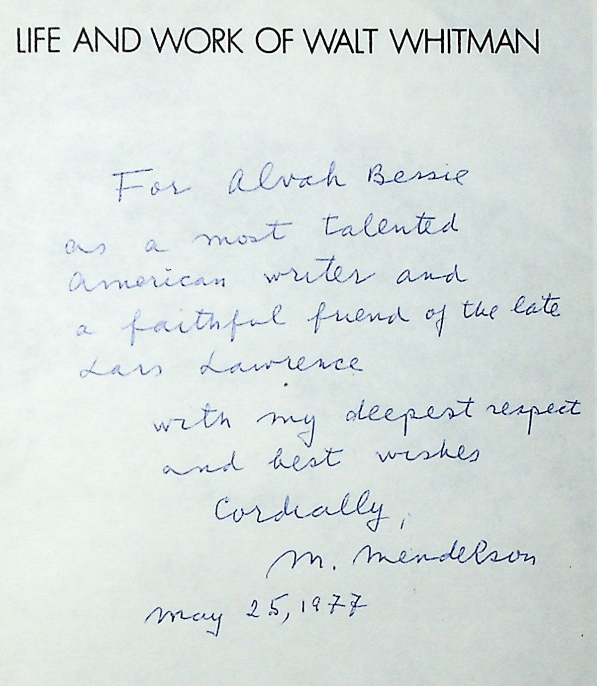 Concludes with Russian bibliography of Whitman's works, and name index section. The inscribed copy of Alvah Bessie, one of the Hollywood Ten, whose writing focused on Spain and the Soviet Union. Mendelson's works uncommon signed. [82388].
