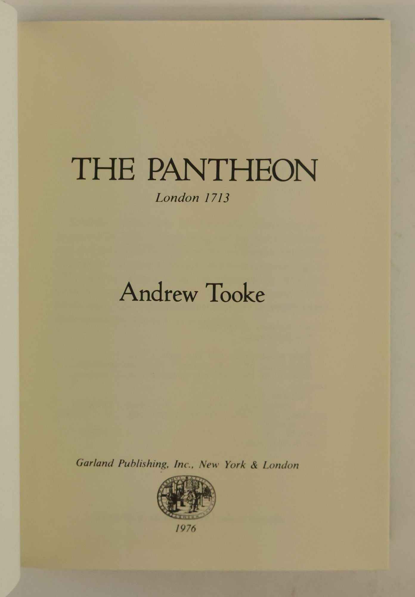 New York and London: Garland Publishing, Inc, 1976. Facsimile Edition. Hardcover. Octavo, [14], 405, [39] pages. In Very Good condition. Bound in full blue cloth with silver titling to spine. Very light shelf wear to lower edge of boards; very light bumping to head of spine. Top edge of text block somewhat dusty; lower edge of text block lightly rubbed. Part of the Garland series THE RENAISSANCE AND THE GODS, containing a facsimile of the London 1713 edition of Tooke's THE PANTHEON. Based on a copy in the Bodleian Library. Shelved in Room G. 1389164. Special Collections.