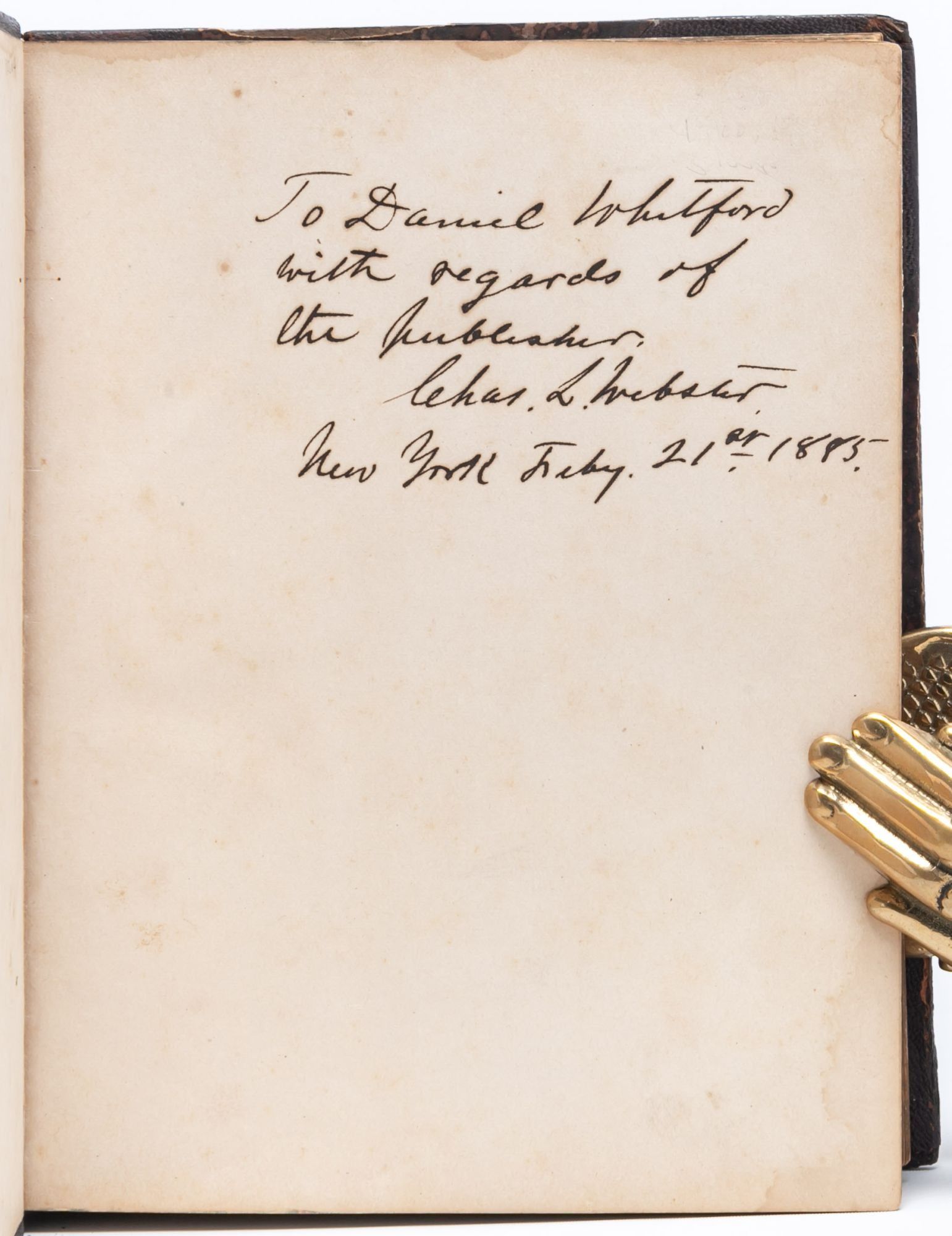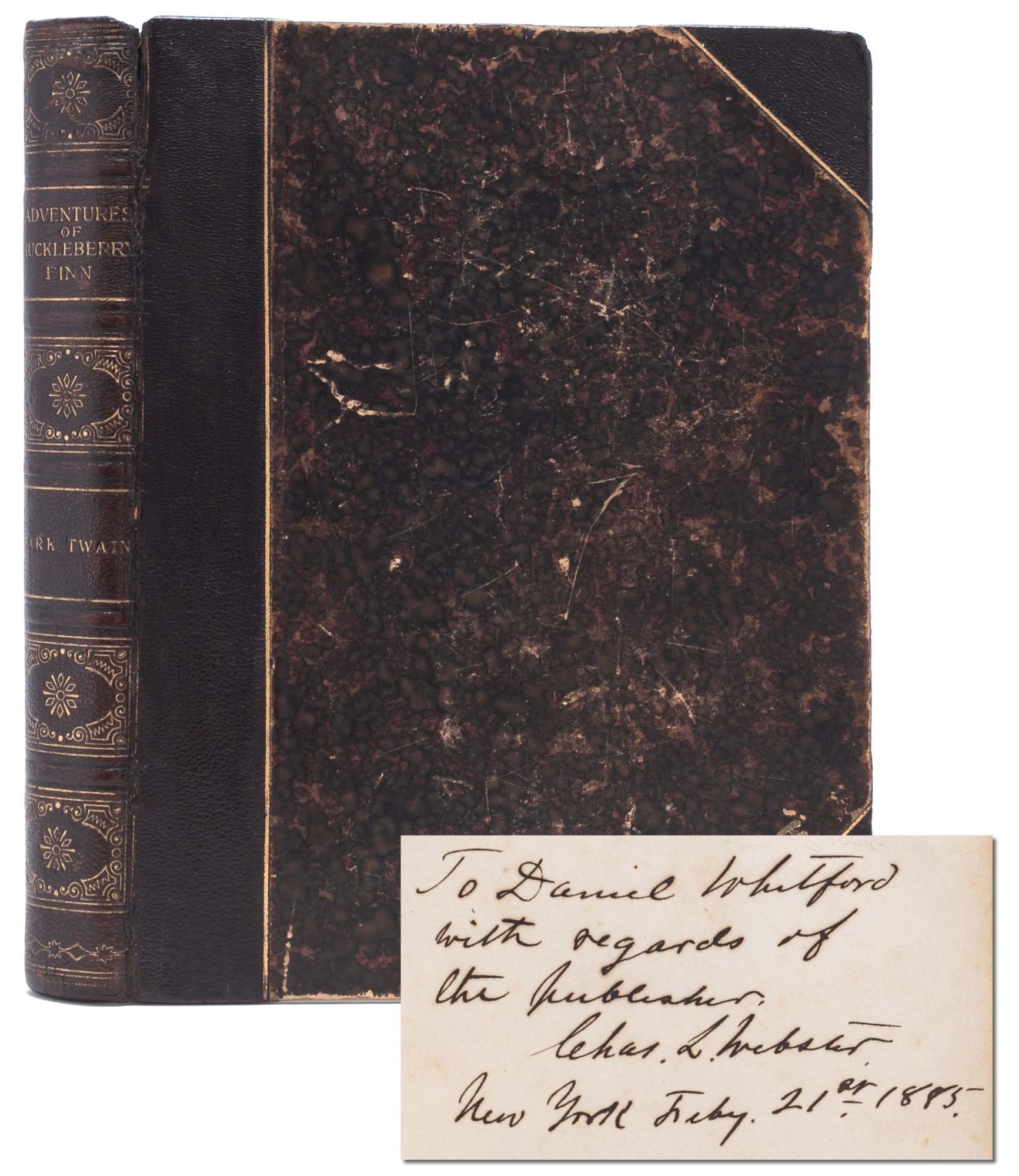 New York: Charles L. Webster & Company, 1885. First edition. Very Good. Presentation copy, inscribed by the publishers to Daniel Whitford, Twain's lawyer: "To Daniel Whitford, with regards of the publisher, Chas. L. Webster. New York, February 21st, 1885." Daniel Whitford, attorney for New York firm Alexander & Green, acted for Webster & Company and was also retained by Twain several times. He acted for Twain in the highly publicized lawsuit over the dramatization of the Prince and the Pauper by Abby Sage Richardson. In 1890, Twain and the producer, Daniel Frohman, were sued by Edward H. House, who claimed that Richardson's adaptation was plagiarized from House's dramatization of the novel, written for Twain years before. Frohman paid House from Twain's royalties to prevent the closure of the play; in turn, Twain sued Frohman for his royalties (amounting to five or six thousand dollars) in 1894.
