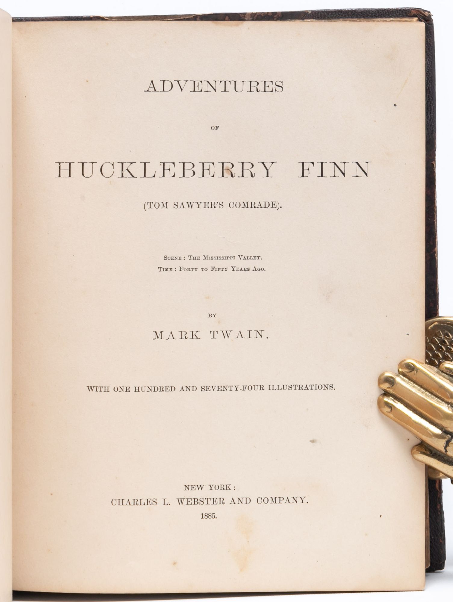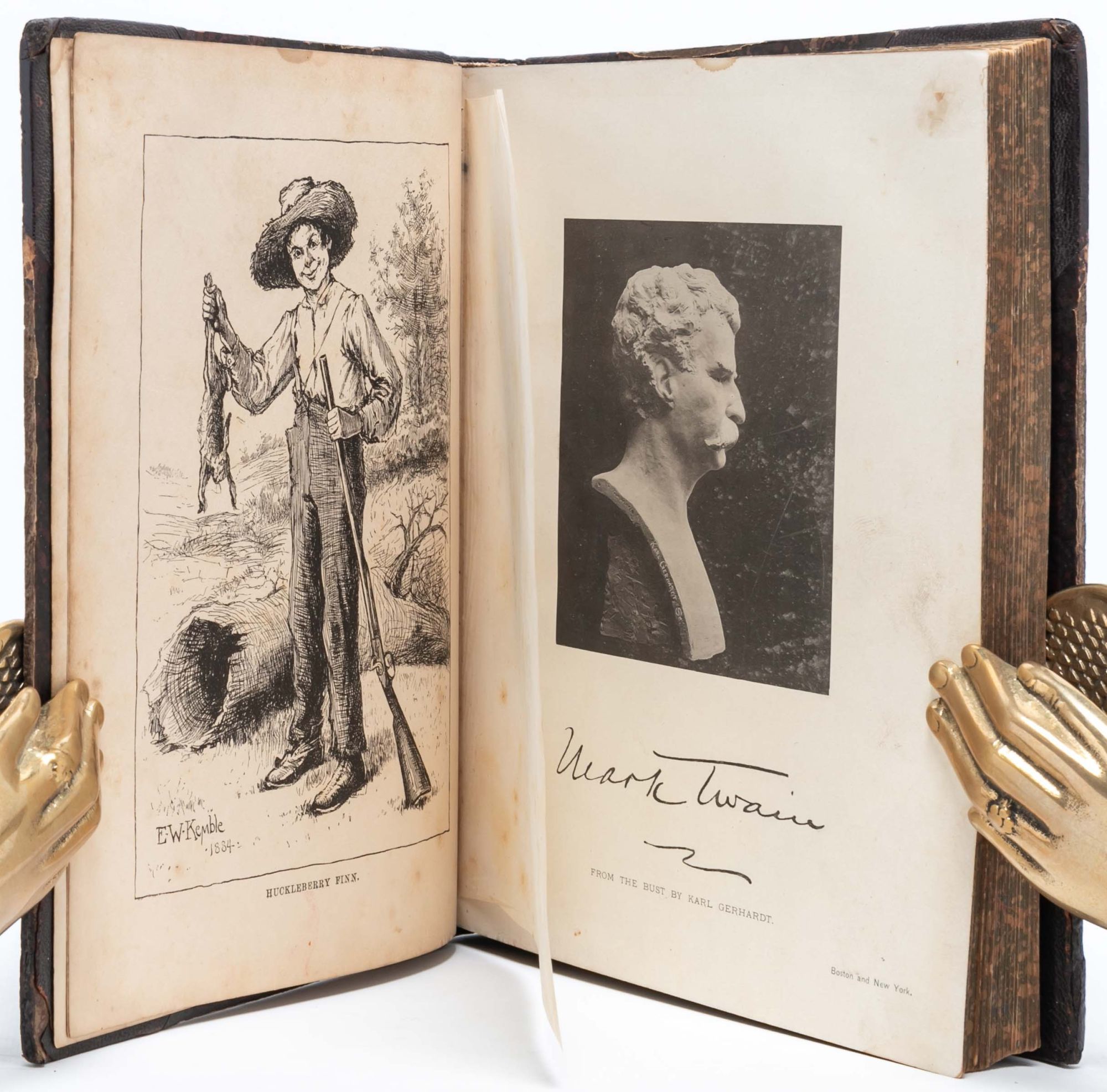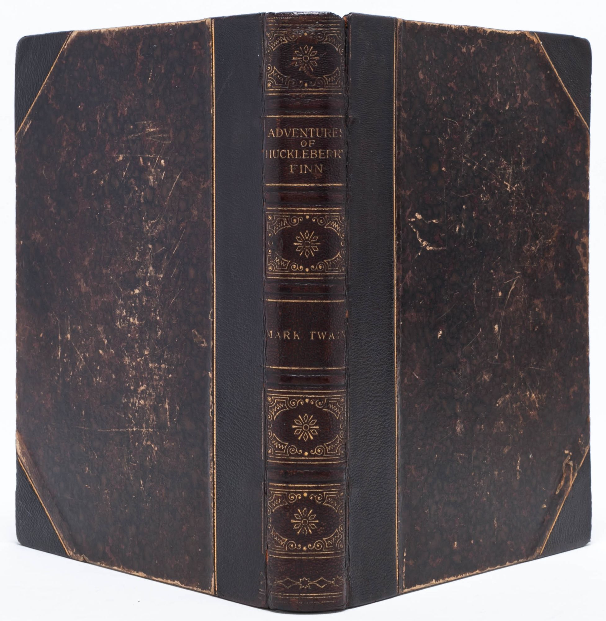 A first printing copy according to MacDonnell with "Huck Decided" on p. 9, "Him and Another Man" listed as being on page 88 in the list of illustrations, and "with the was" on p. 57. With the exception of those three points, the remaining states of various leaves do not indicate a later printing. This copy contains the portrait frontispiece with "Heliotype Printing Company," but tablecloth not visible (BAL state 2); and p. 283 conjugate with a definitely curved fly (BAL state 1), only found in the leather-bound copies. A small chip at the crown and front outer joint just starting. Some marginal dampstaining and light to moderate foxing (or soiling) throughout, but a Very Good copy overall.