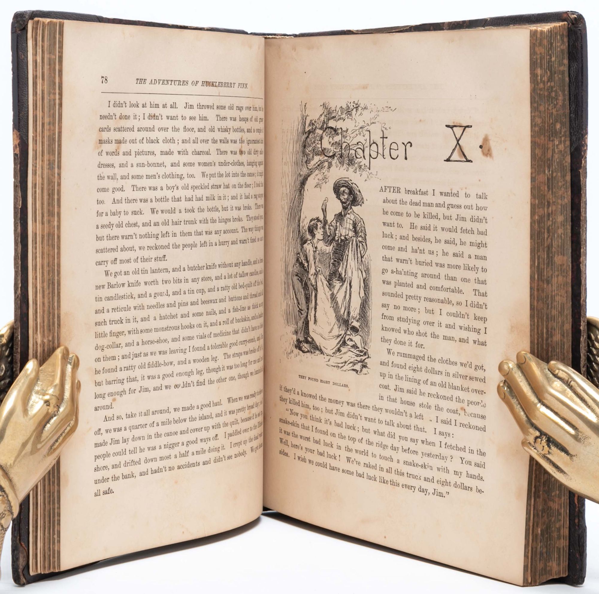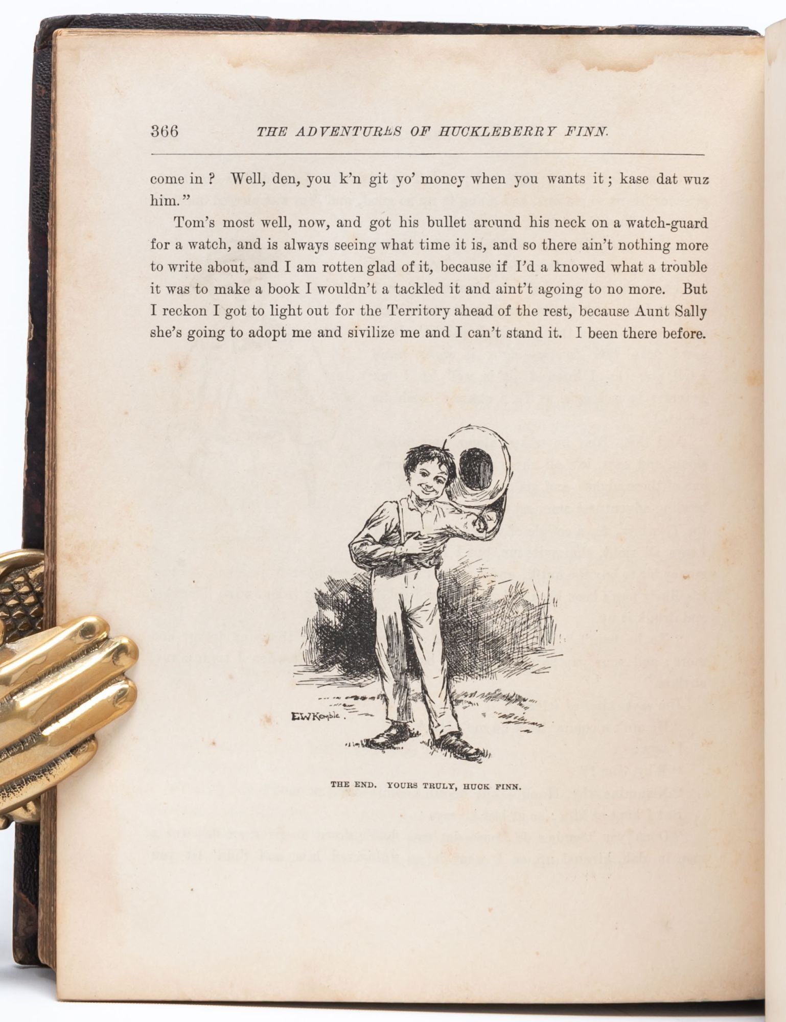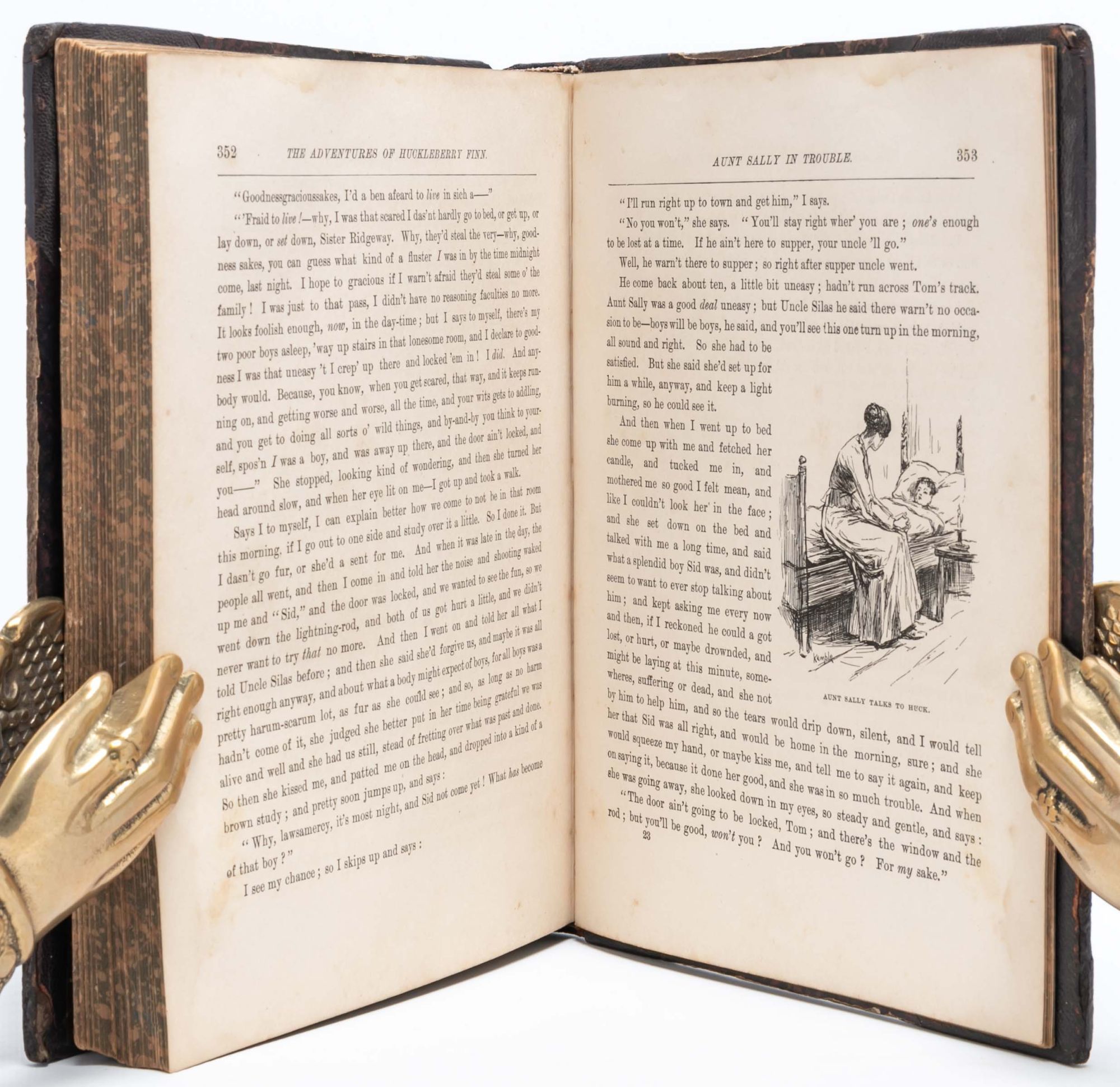 A first printing copy according to MacDonnell with "Huck Decided" on p. 9, "Him and Another Man" listed as being on page 88 in the list of illustrations, and "with the was" on p. 57. With the exception of those three points, the remaining states of various leaves do not indicate a later printing. This copy contains the portrait frontispiece with "Heliotype Printing Company," but tablecloth not visible (BAL state 2); and p. 283 conjugate with a definitely curved fly (BAL state 1), only found in the leather-bound copies. A small chip at the crown and front outer joint just starting. Some marginal dampstaining and light to moderate foxing (or soiling) throughout, but a Very Good copy overall.