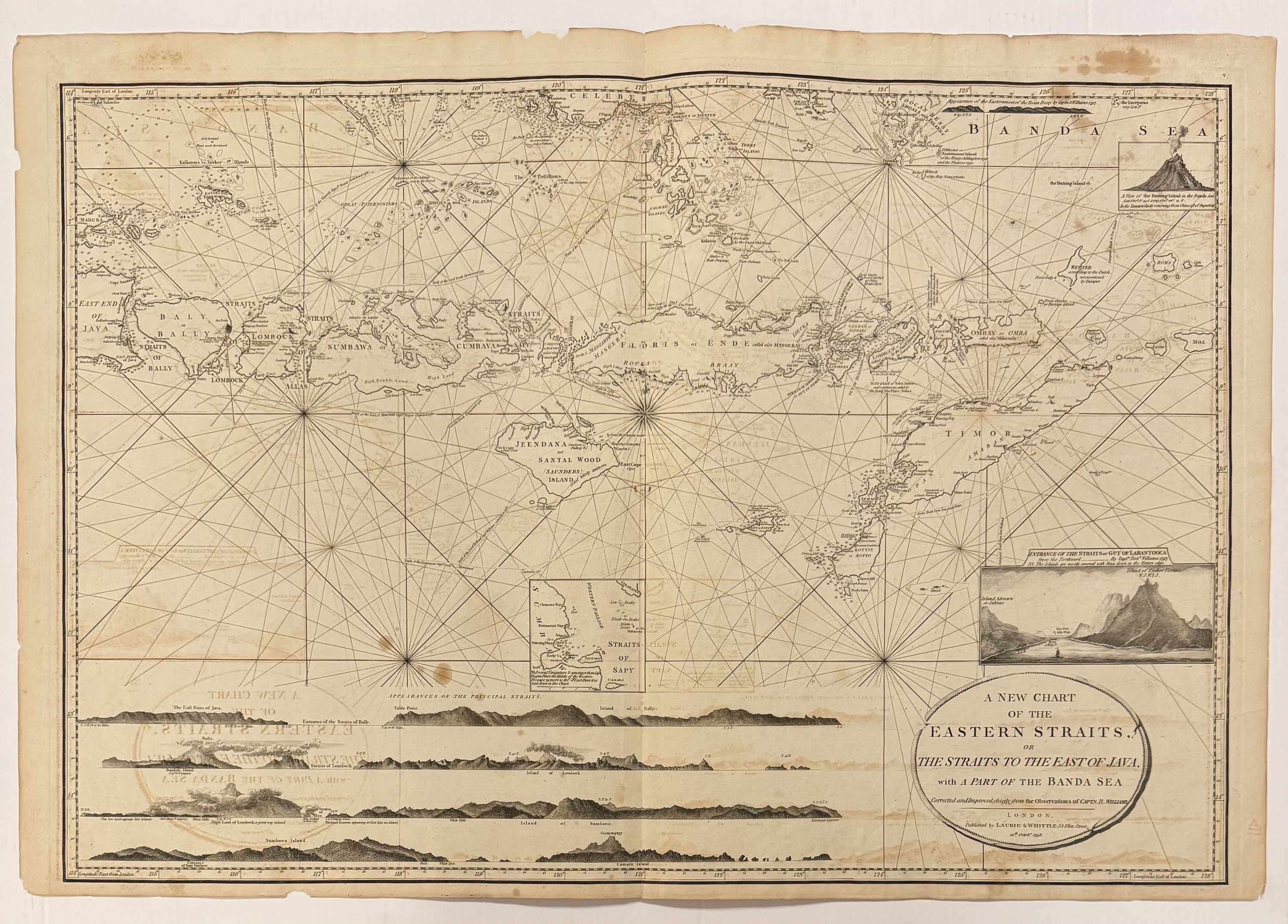 Wonderfully intricate sea chart of the southern East Indies, including Bali, East Timor, and parts of Java and the Banda Sea. Inset illustrations of a smoldering volcano, the Straits of Lantooca, and elevations of each island's coastlines. Robert Laurie (c. 1755 - 1836) and James Whittle (1757-1818) were London-based map and atlas publishers active in the late 18th and early 19th century. Their firm combined Laurie's engraving skills with Whittle's social contacts and print sales experience. Together, they published numerous maps and atlases, often enlisting prominent cartographers such as Kitchin, Faden, Jefferys and others to update and modify their plates. This map is a beautiful example of their work.