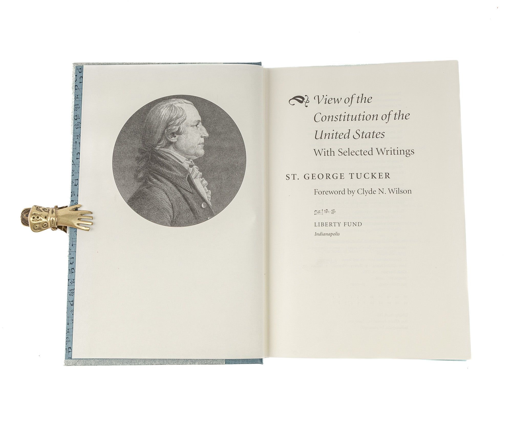 1999. Liberty Fund, 1999.. Liberty Fund, 1999. Tucker, St. George. View of the Constitution of the United States with Selected Writings. Foreword by Clyde N. Wilson. Indianapolis: Liberty Fund, [1999]. xxi, 478 pp. Publisher's blue quarter cloth to spine, with stamped spine and ribbon marker. Near fine. $25. * As professor of law at the College of William and Mary, St. George Tucker in 1803 published View of the Constitution - the first extended, systematic commentary on the United States Constitution after its ratification and later its amendment by the Bill of Rights. View was originally part of Tucker's "Americanized" or "republicanized" edition of the multivolume Commentaries on the Laws of England by Sir William Blackstone. Generations of American law students, lawyers, judges, and statesmen learned their Blackstone - and also their understanding of the Constitution - through Tucker. As Clyde N. Wilson notes, "Tucker is the exponent of Jeffersonian republicanism... in contrast to the commercial republicanism of New England that has since the Civil War been taken to be the only true form of American philosophy." In addition to the entirety of View, the Liberty Fund volume includes seven other essays from Tucker's renowned edition of Blackstone. These include "On the Study of Law," "Of the Unwritten, or Common Law of England," and "Of the Several Forms of Government." (Publisher's description).