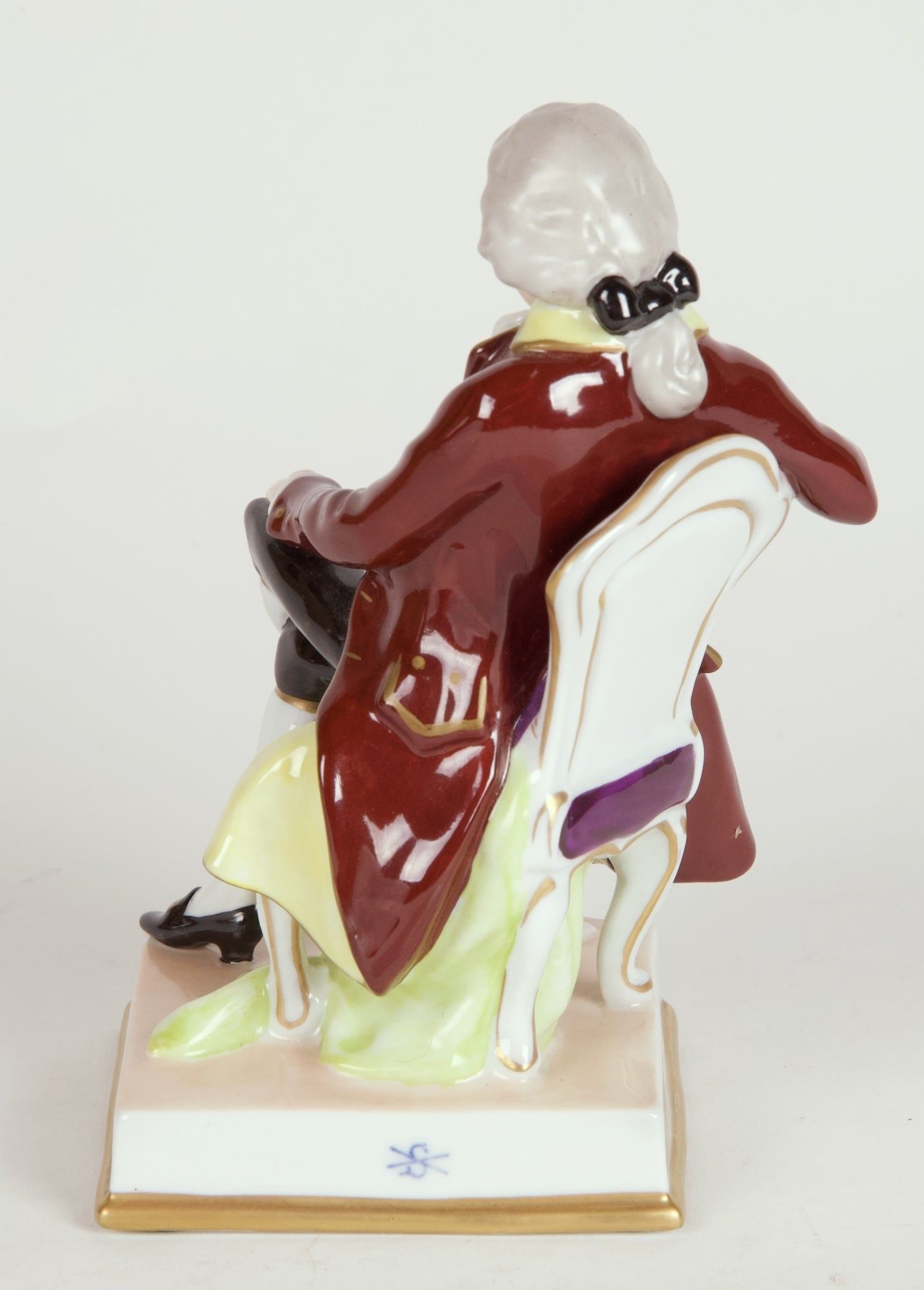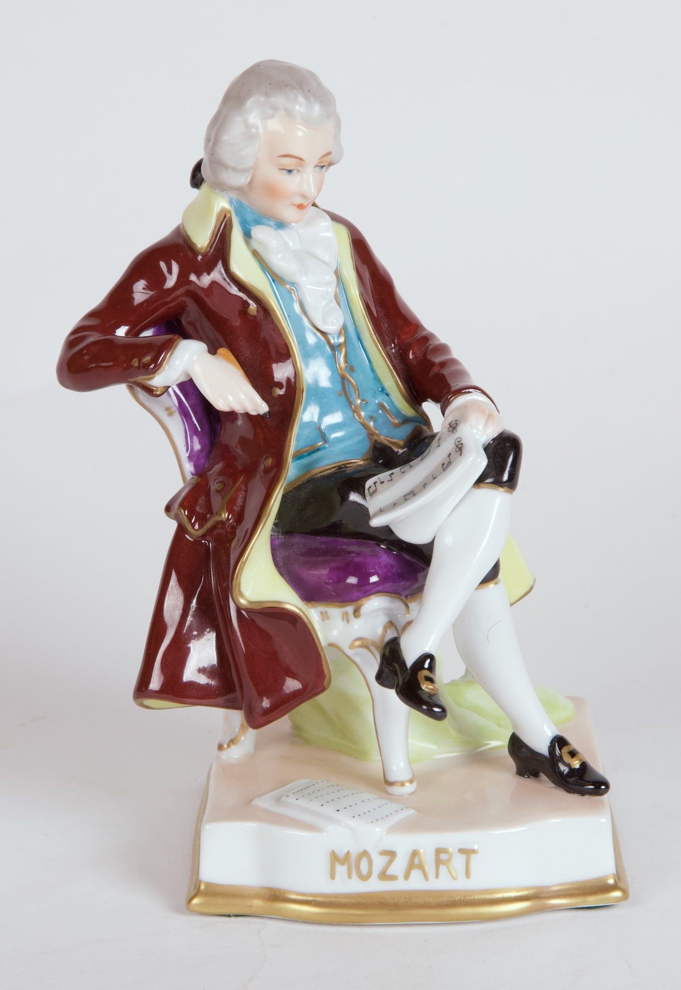 Mozart is depicted seated on a purple upholstered chair, legs crossed, wearing a dark reddish brown coat with lapel and inside in light yellow, a blue vest, white ruffled shirt, black britches, and black shoes with gold buckles. The composer holds a writing implement in his right hand and a leaf of music manuscript paper in his left; sheets of music paper lie on the floor under the composer. On an off-white base with "Mozart" in gold on front edge and lower edge in gold.