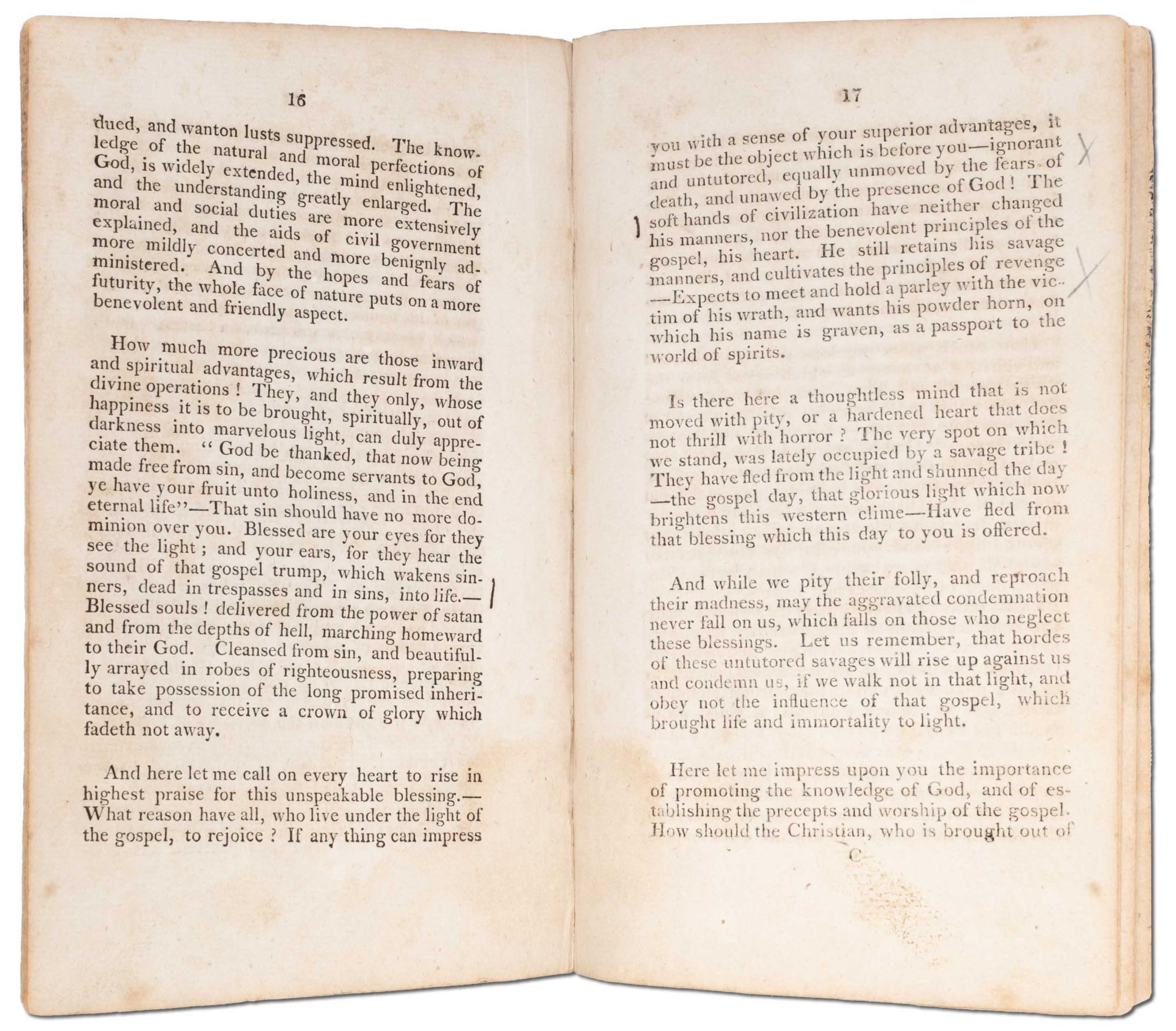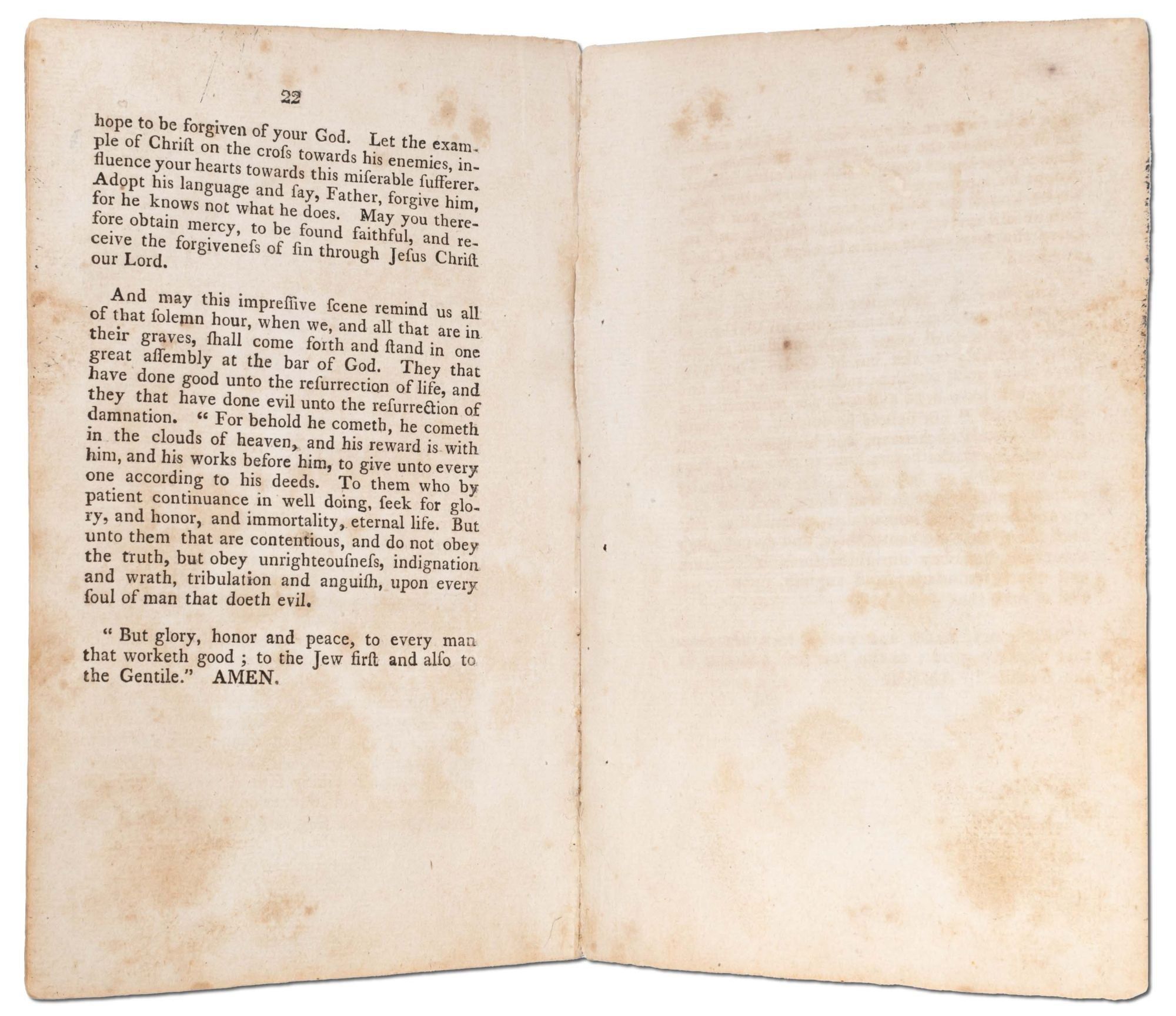 Other than a few sensationalized retellings of the story framed as myths and ghost stories, however, we could find few records of John, his crime, and his execution. This item, then, is a scarce record of the event, and a view into the rhetoric that white Christians used to justify the removal of Native people from their land. Very Good +.