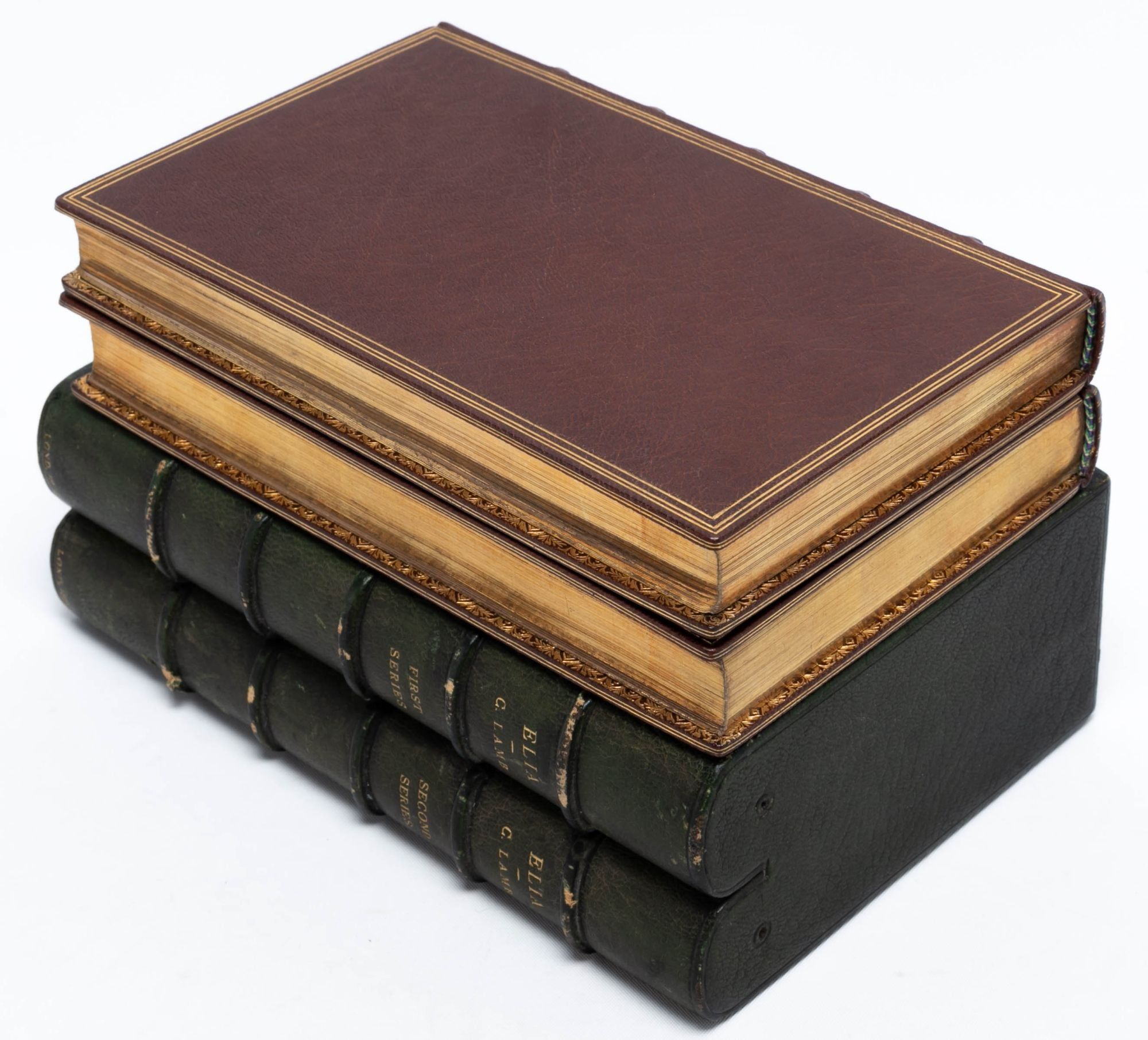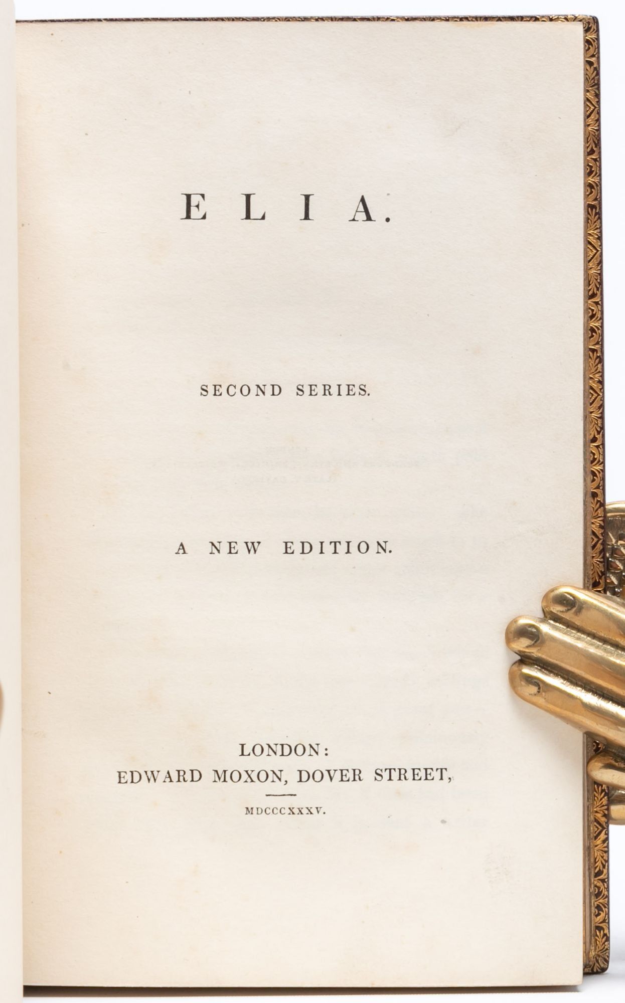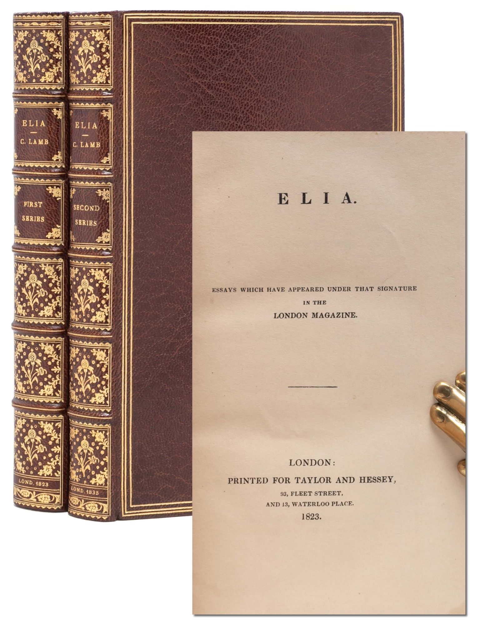 First edition, second issue of Essays of Elia (with both the Fleet Street and Waterloo addresses in the imprint), bound without the terminal publisher's ads. Second edition of Last Essays of Elia, which was first published by Edward Moxon in 1833.