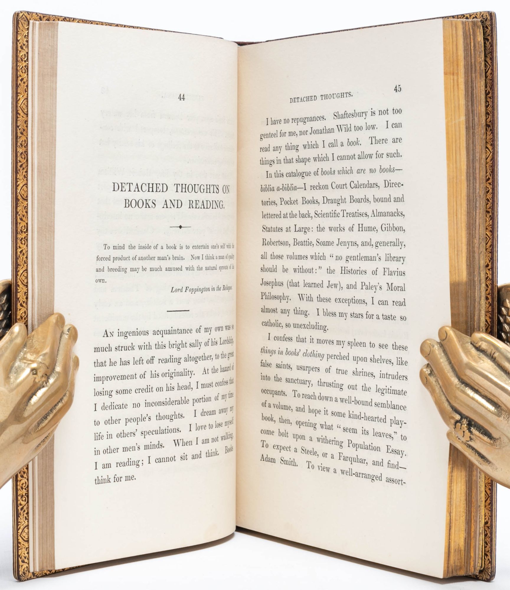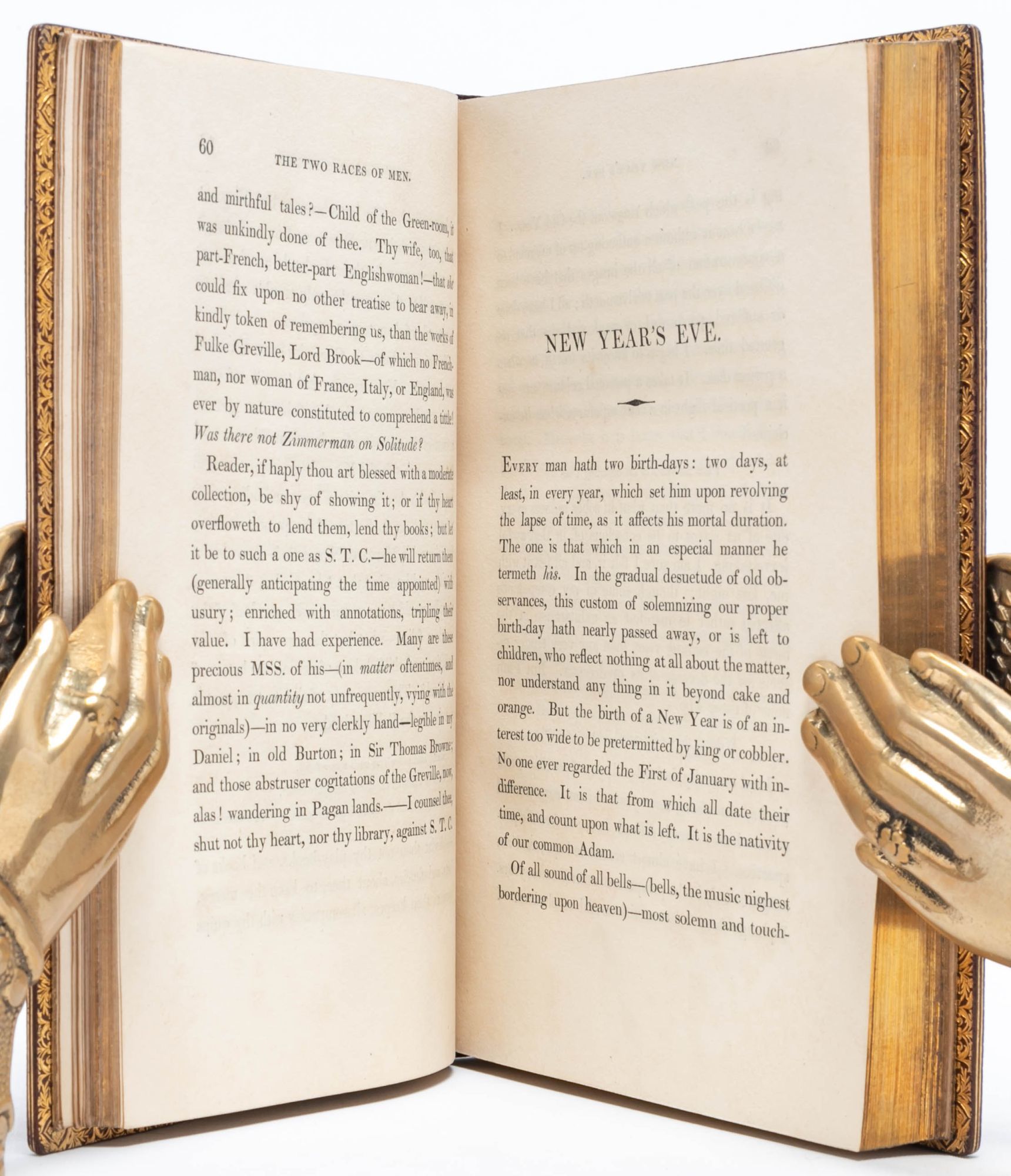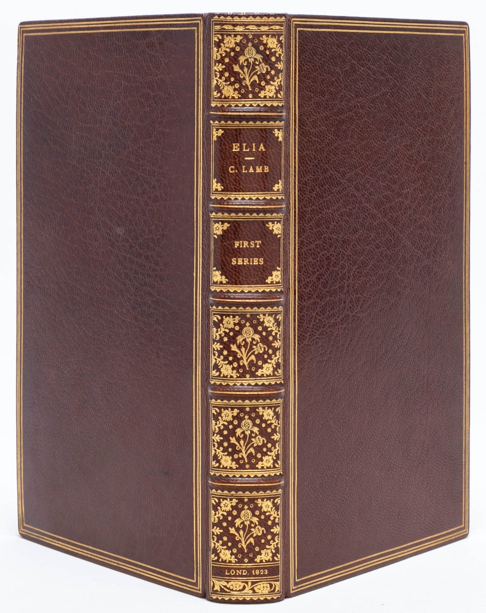London: Taylor and Hessey [and] Edward Moxon, 1835. First edition [and] second edition. Fine. Lamb's Essays of Elia and Last Essays of Elia, finely bound by Riviere & Son in full dark brown morocco with a dark green morocco pull-off case. Two volumes, octavo. [vi], 341; xiii, 295 pp., complete. Elaborate gilt spines in six compartments with raised bands. Gilt rule to boards and gilt turn-ins. All edges gilt. Teal coated endpapers. Small twentieth-century bookseller's ticket to lower flyleaves. A Fine, fresh set in a beautiful binding.