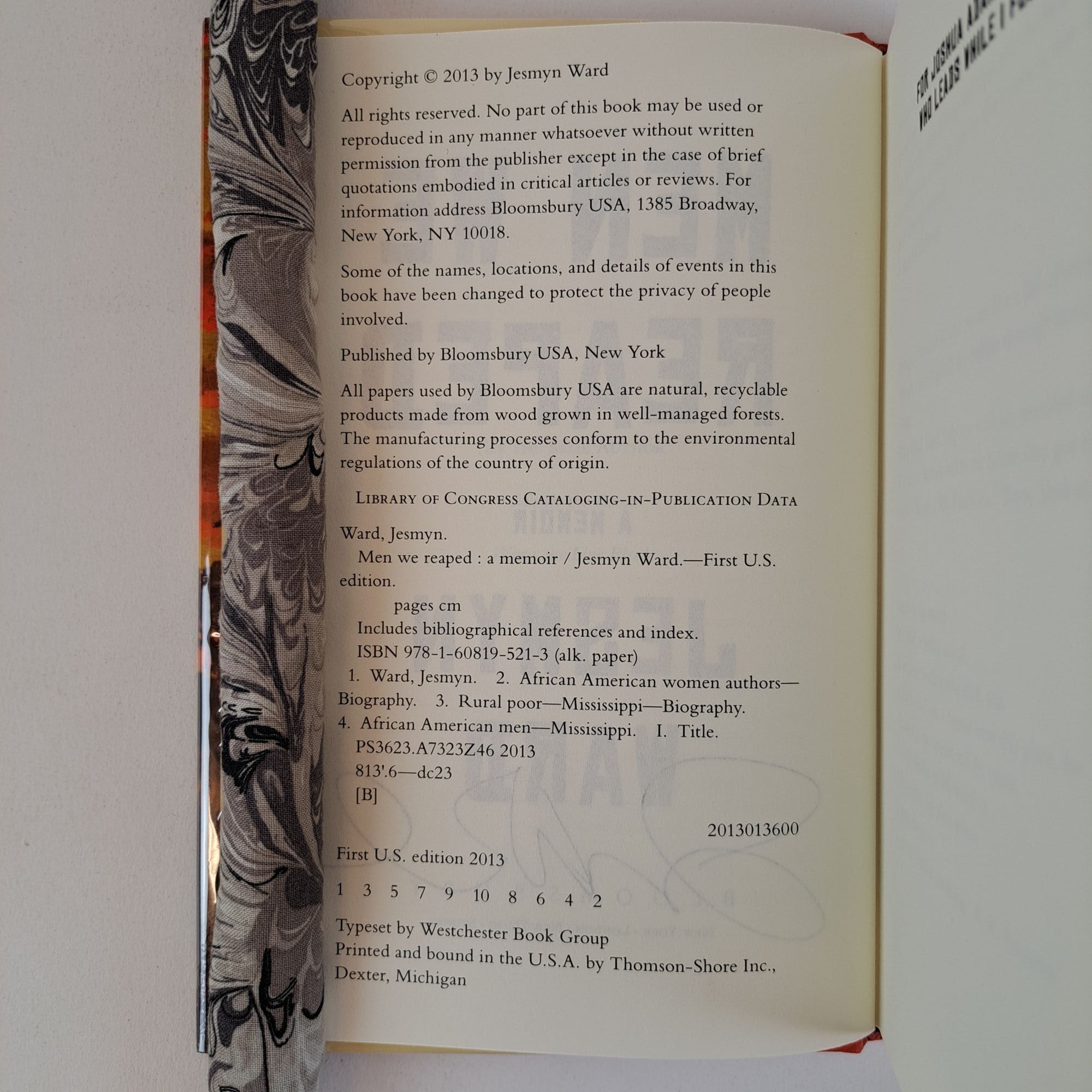 New York, New York: Bloomsbury, 2013. First Edition, First Printing. Hardcover. Octavo, 259 pages. In Very Good condition with Near Fine condition dust jacket. Spine is orange, green, and brown with white and black lettering. Dust jacket wrapped in mylar covering, price uncut: "$26.00" on front flap. Boards have mild shelving wear along the head joint. Signed flat by Jesmyn Ward on title page. Shelved in hallway. 1389354. Special Collections.