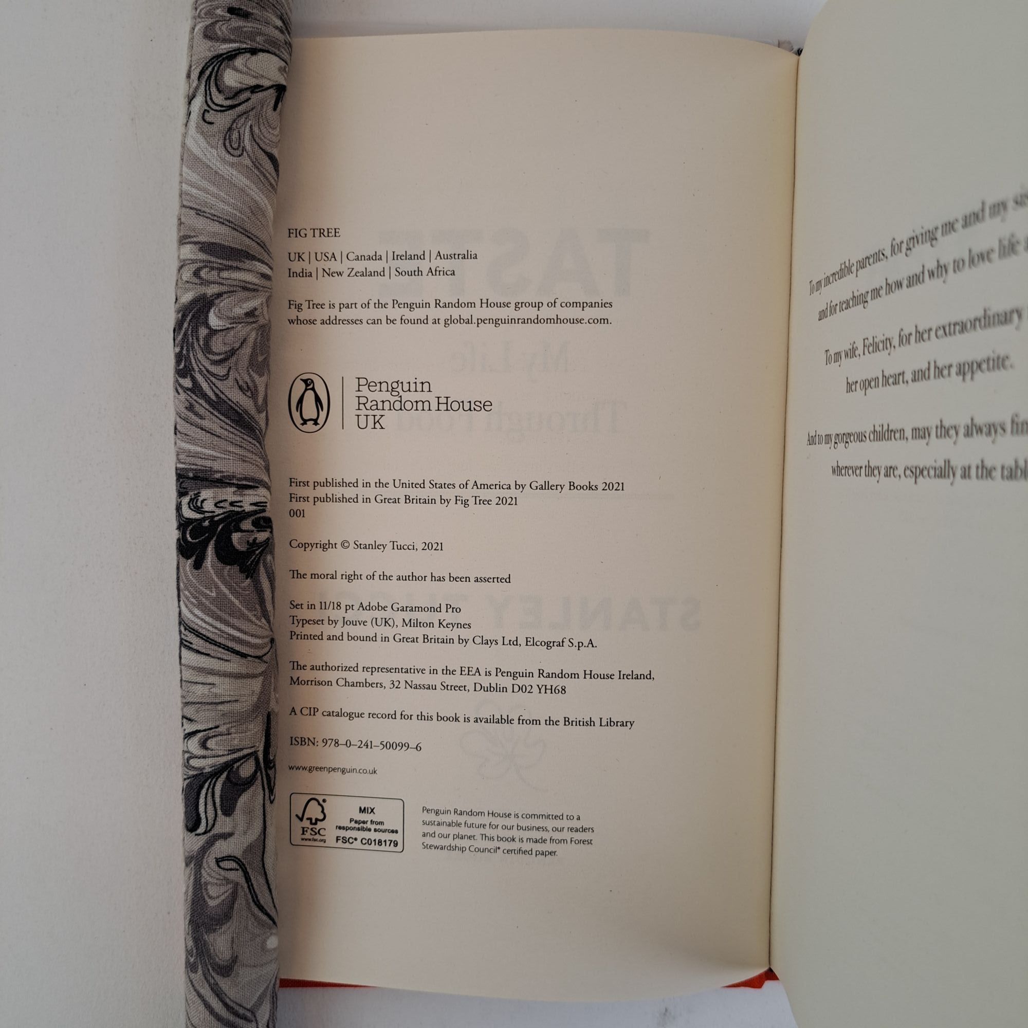 Dublin, Ireland: Fig Tree, 2021. First Edition, First Printing. Hardcover. Octavo. 302 pages. In Very Good condition. Spine is white and orange with black lettering. Boards are partially cloth bound in orange cloth. Boards have mild shelving wear and soiling along spine head. Circular orange "signed copy" on front cover. Signed flat on half title page by Stanley Tucci. Shelved in hallway. 1389532. Special Collections.