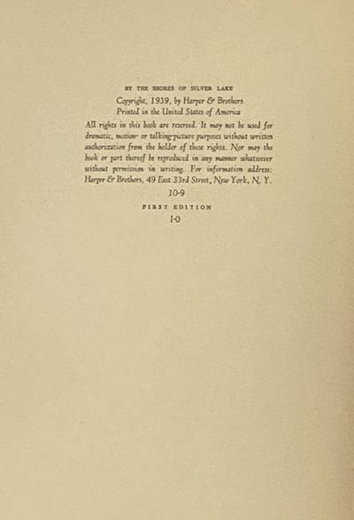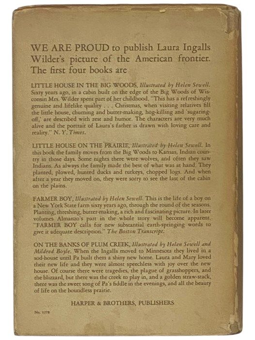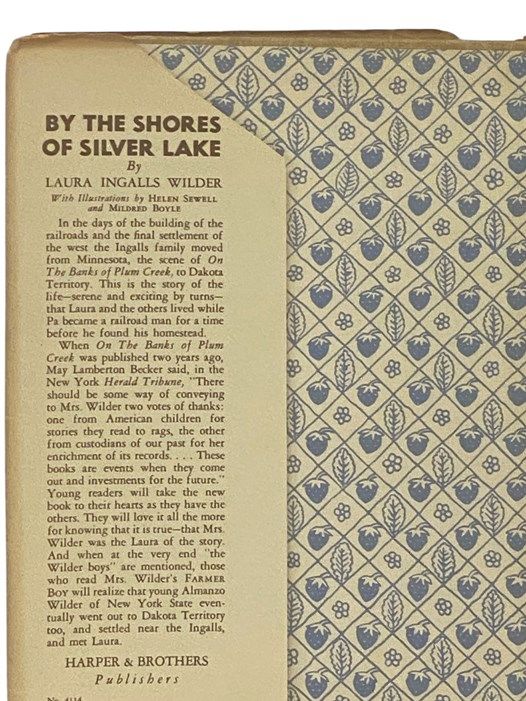 New York: Harper & Brothers, 1939. First Edition. Hard Cover. Very Good/Good. 8x6x1. Sewell, Helen; Boyle, Mildred. First edition (stated, with I-O code), with significantly thicker paper stock than later printings (book is 1 1/2 inches thick, reprints are 7/8). Includes scarce original jacket. Jacket price clipped, some loss from jacket corners, jacket a bit toned (more on spine), a few light spots on front board, pencil name on front endpaper. 1939 Hard Cover. vi, 260 pp. Color frontispiece and black-and-white illustrations by Helen Sewell and Mildred Boyle. The adventures of Laura Ingalls and her family continue as they move from their little house on the banks of Plum Creek to the wilderness of the unsettled Dakota Territory. Here Pa works on the new railroad until he finds a homestead claim that is perfect for their new little house. Laura takes her first train ride as she, her sisters, and their mother come out to live with Pa on the shores of Silver Lake. After a lonely winter in the surveyors' house, Pa puts up the first building in what will soon be a brand-new town on the beautiful shores of Silver Lake. The Ingallses' covered-wagon travels are finally over.