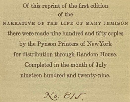 New York: Random House / Pynson Printers, 1929. Limited Edition. Small Hard Cover. Good/No Jacket. Limited edition, #815 of 950 copies. Three 1/2 inch chips from spine, beginning to split along rear joint. Binding firm, interior clean, bright, and unmarked. 1929 Small Hard Cover. xv, 459 pp. 5 5/8 x 3 5/8. This is the twenty-third recorded edition of the work, and reproduces the contents of the first edition printed by J.D. Bemis and Co. The edition was designed and printed by Pynson Printers, founded by Rochester native Elmer Adler. The original edition was published in 1824 (Howes S-263: 'One of the most authentic and interesting of captivity narratives, told by one who spent a long life among the Senecas and was the first white woman to descend the Ohio.'), and quickly republished in London in 1826 (Sabin 78678, Church 1334: 'This well written narrative, purporting to be only the biography of a captive among the Senecas, is really the best resume we have of incidents in the history and common life of the Seneca Indians. Its truthfulness is vouched for by such veracious testimony as that of Eli Parker, an educated chief of that nation, though its authenticity can scarcely have greater corroboration than the fact that Mr. Seaver received almost the whole mass of incidents narrated in his book, directly from the lips of the aged captive herself. - FIELD. Forty years had passed since the close of the revolutionary war, and almost seventy years had seen Mrs. Jemison with the Indians, when Daniel W. Banister, Esq., at the instance of several gentlemen, and prompted by his own ambition to add something to the accumulating fund of useful knowledge, resolved, in the autumn of 1823, to embrace that time, while she was capable of recollecting and reciting the scenes through which she had passed to collect from herself, and to publish to the world, an accurate account of her life. - Introduction, p. viii. At this time Mrs. Jemison was about eighty years of age, and was living in the neighborhood of Genesee River, about four miles from Castile, New York, to which place she went on foot to meet the author and his publisher and tell the story of her life.').