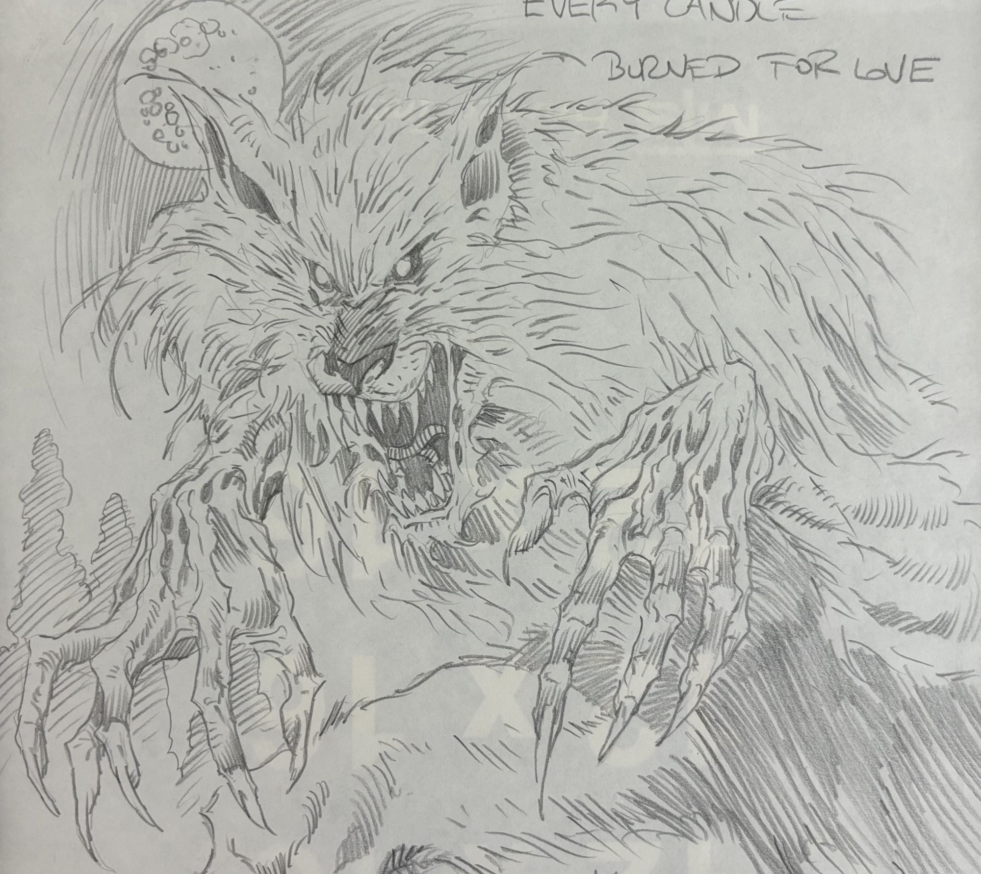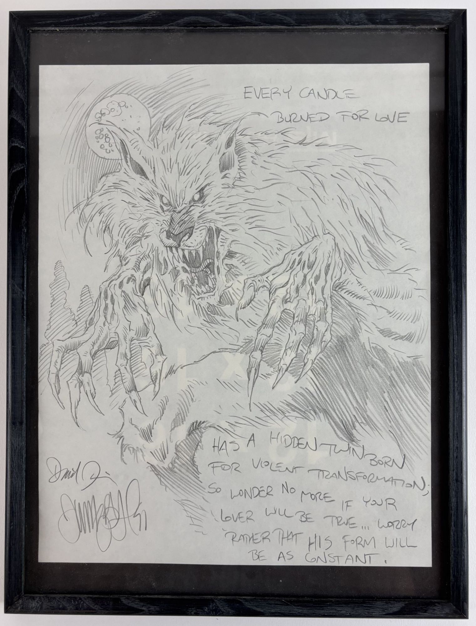 Original artwork measures ~11 in. x 14 in. Black-painted wood frame measures ~12.75 in. x 17 in. Signed by both Tim Vigil (artwork) and David Quinn (text). Drawing in Very Good+ condition. Minimal wear to wood frame. PO Consignment. Shelved at DuPont. Tim Vigil is an American comic book artist best known for horror works, including the series Faust, which Vigil co-created with writer David Quinn. 1389606. Shelved Dupont Bookstore.