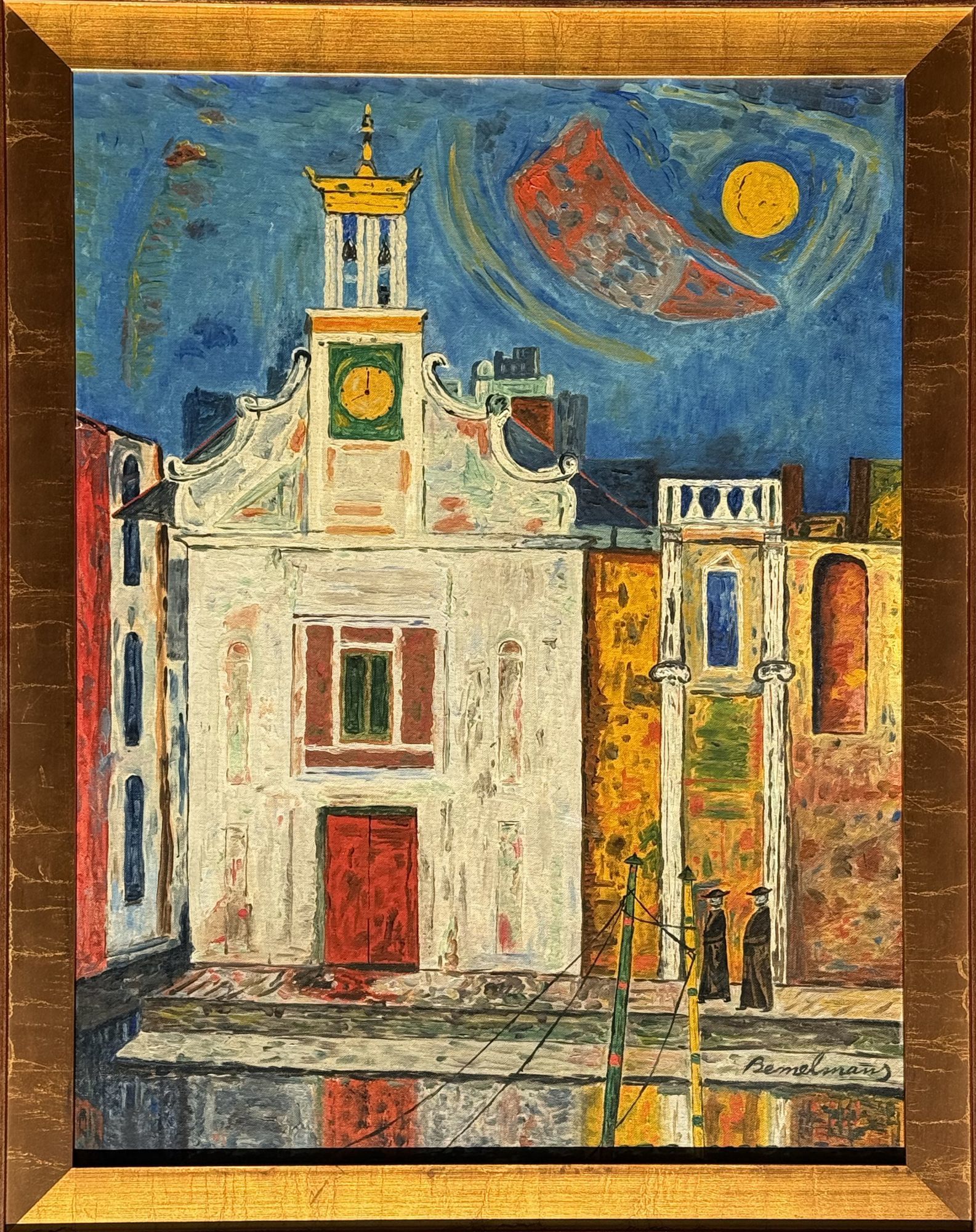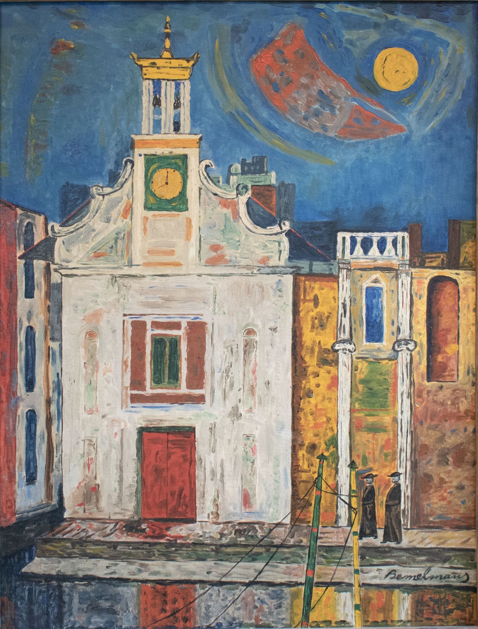 Oil on canvasboard, signed “Bemelmans” (lower right). 26 x 20 in. Framed. Oil on canvasboard, signed “Bemelmans” (lower right). 26 x 20 in. This artwork exemplifies Bemelmans' extraordinary ability to merge reality and imagination, capturing a serene nocturnal view of a Venetian church bathed in moonlight. A composition of both elegance and subtlety, the painting renders an intimate portrayal of the city's architecture and its romantic charm.